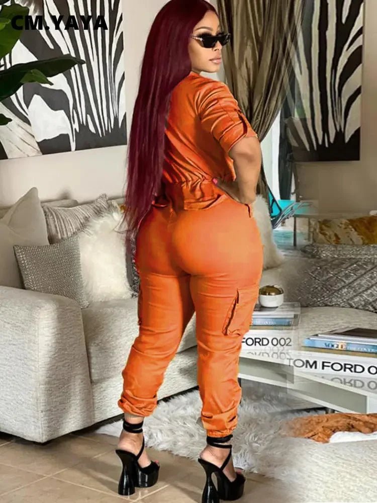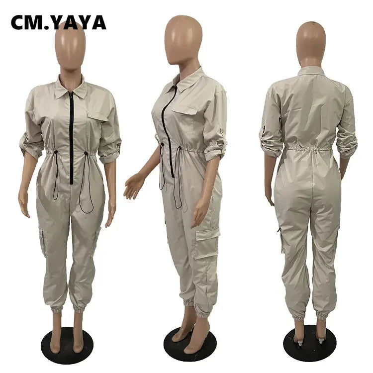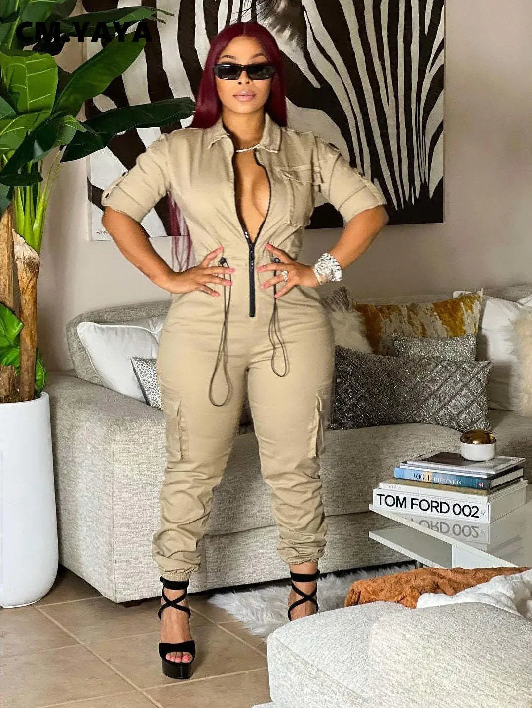 CM.YAYA Women Safari Style Short Sleeve Zipper Fly Pocket Side INS Zipper Fly Jumpsuit Fashion Casual One Piece Suit Playsuit