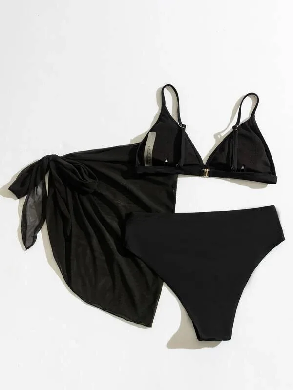 DAMOCHIC 2022 Drop Shipping New Style Three Pieces Swimwear Black Bikini Set with Cover Ups 3 Piece Swimsuit for Women Swim Suit