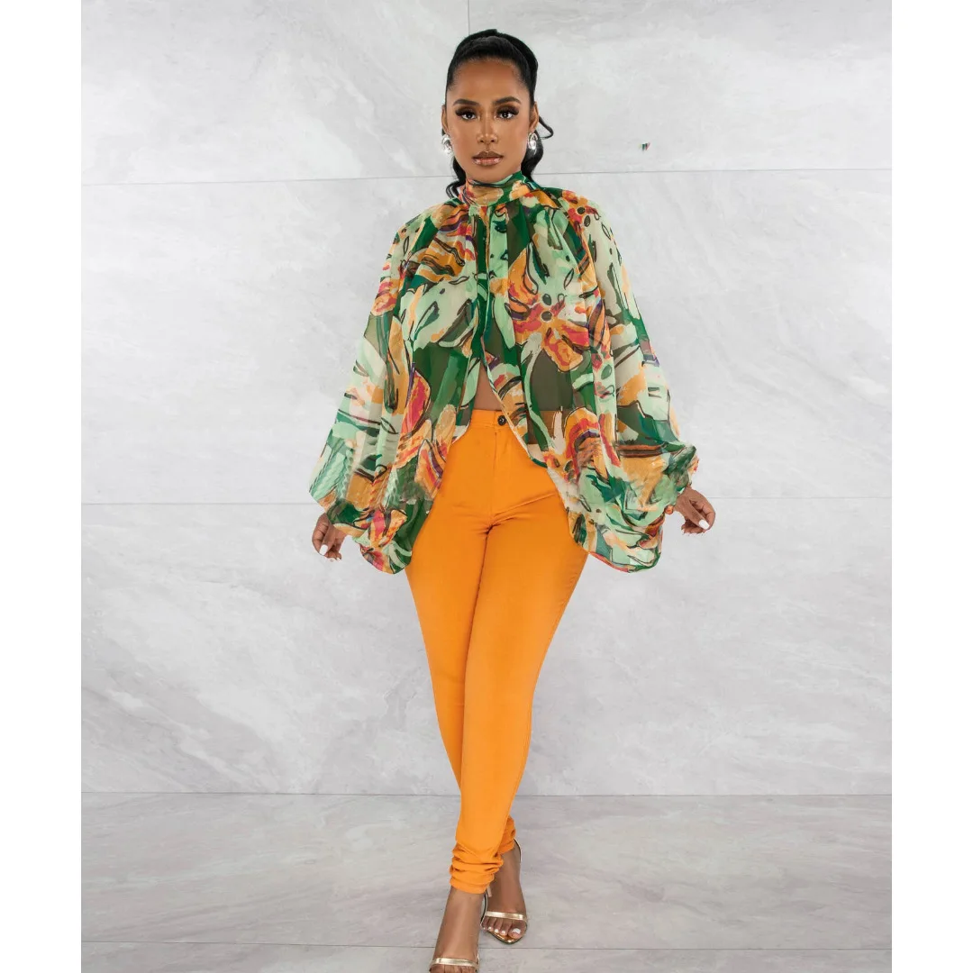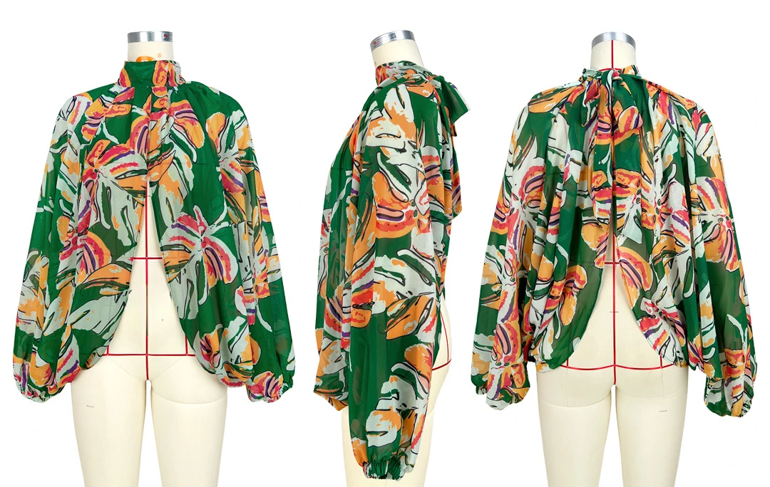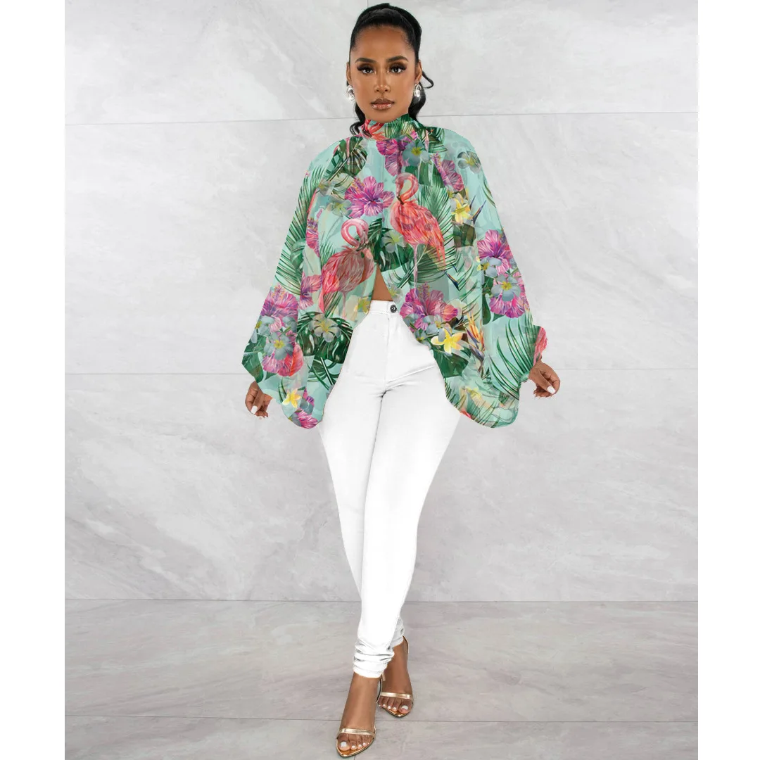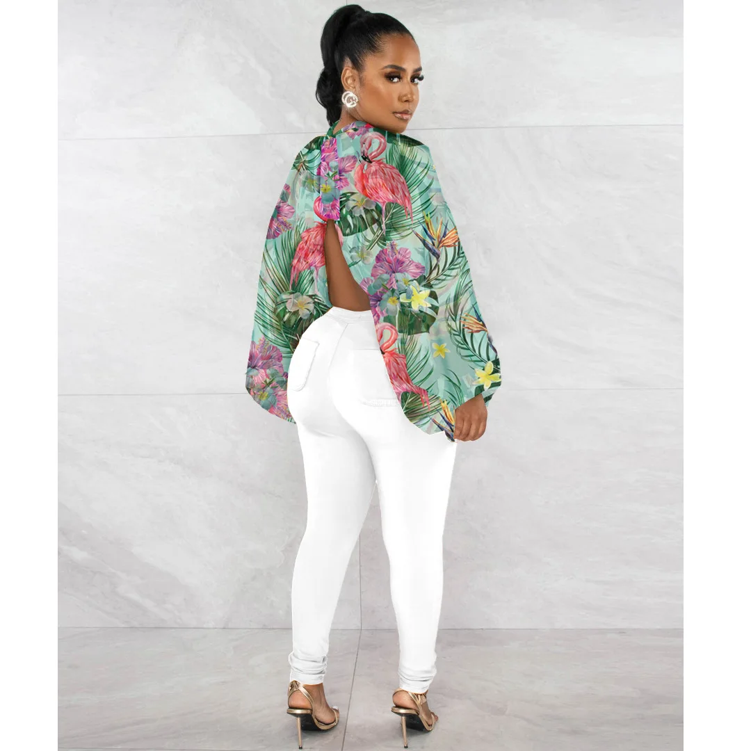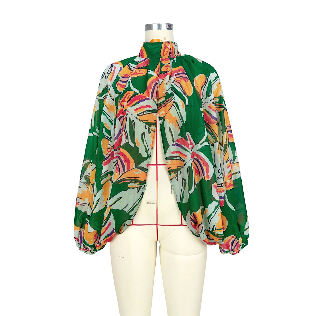 DAMOCHIC Elegant Print Blouse Shirt Ladies Batwing Sleeve Fall High Neck Lace Up Open Back Tops Female Chiffon Blouse Women 2023 Wholesale Supplier