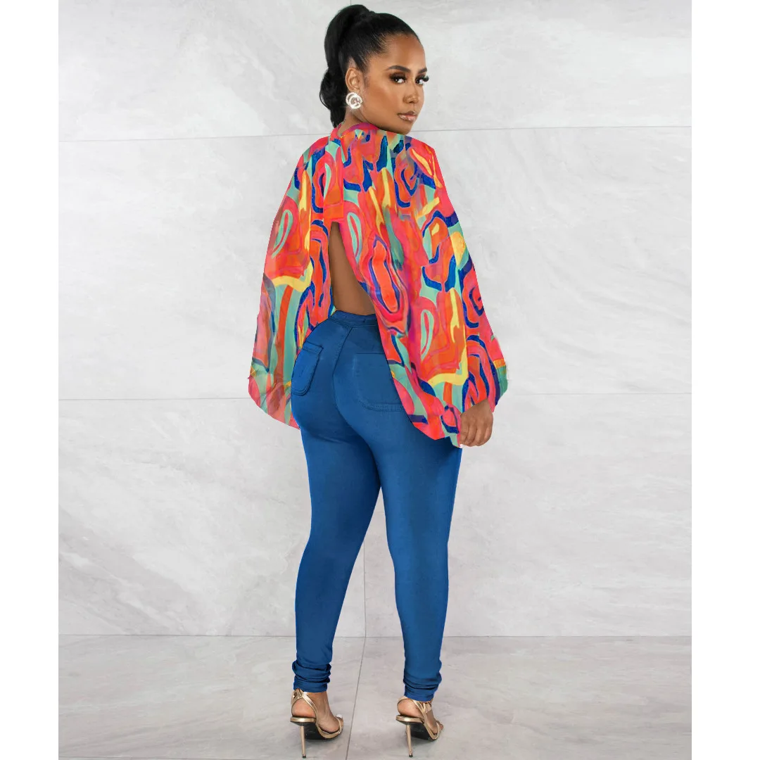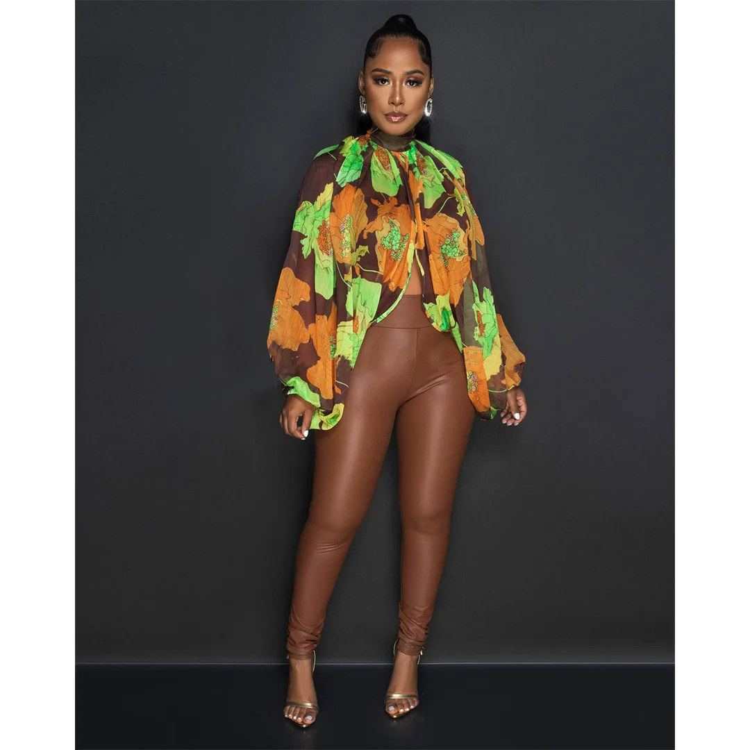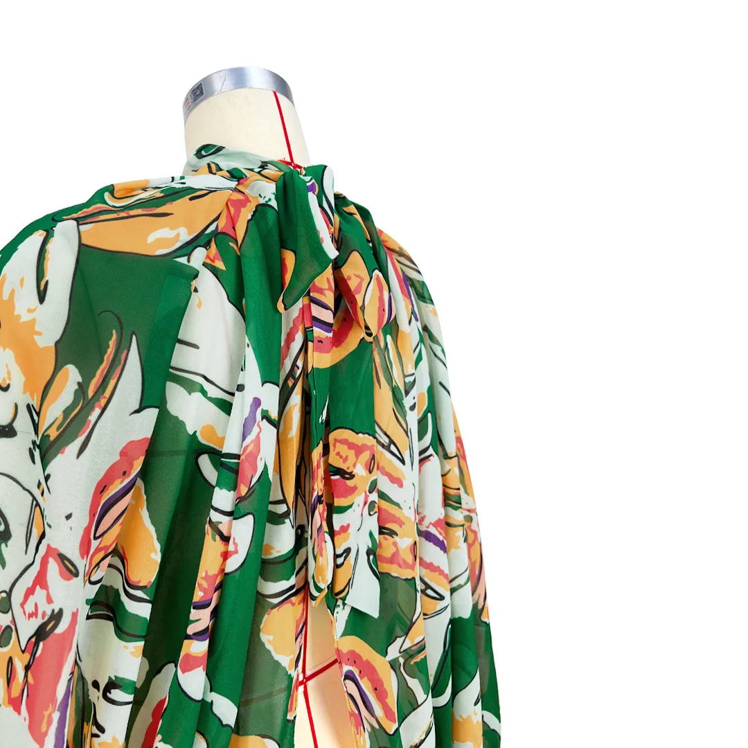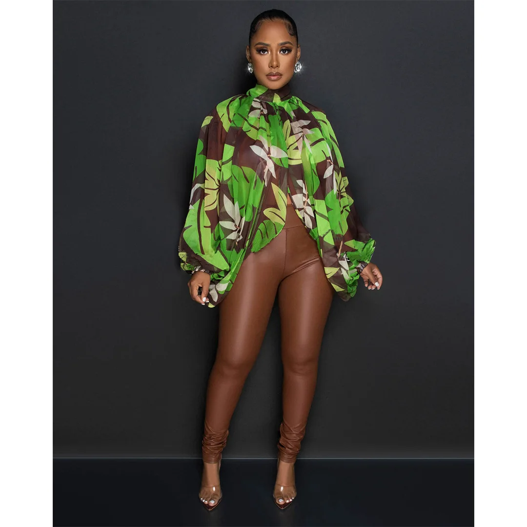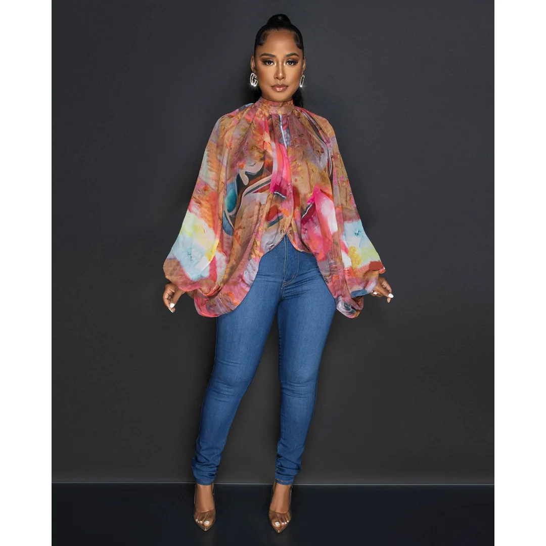 DAMOCHIC Elegant Print Blouse Shirt Ladies Batwing Sleeve Fall High Neck Lace Up Open Back Tops Female Chiffon Blouse Women 2023 Wholesale Supplier