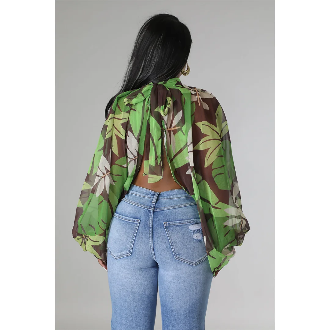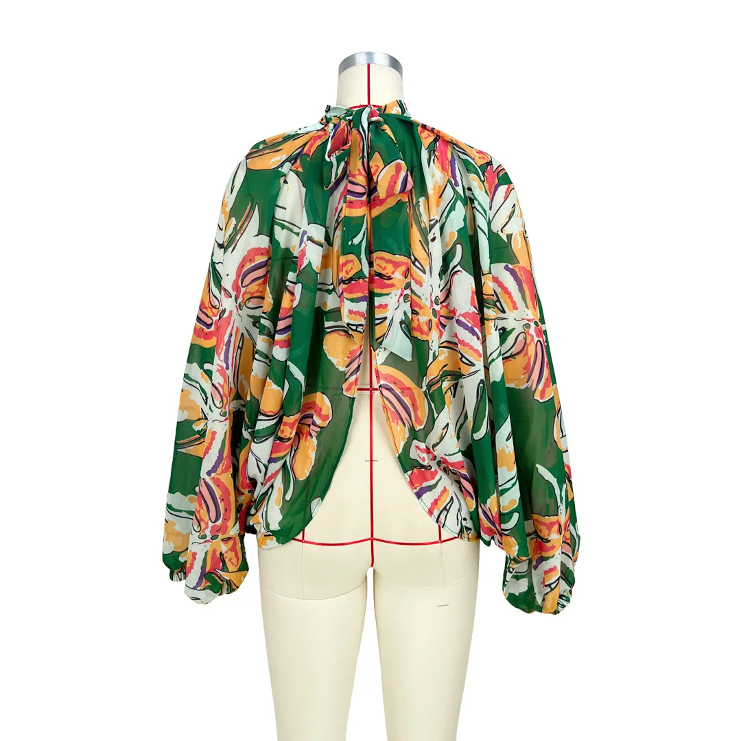 DAMOCHIC Elegant Print Blouse Shirt Ladies Batwing Sleeve Fall High Neck Lace Up Open Back Tops Female Chiffon Blouse Women 2023