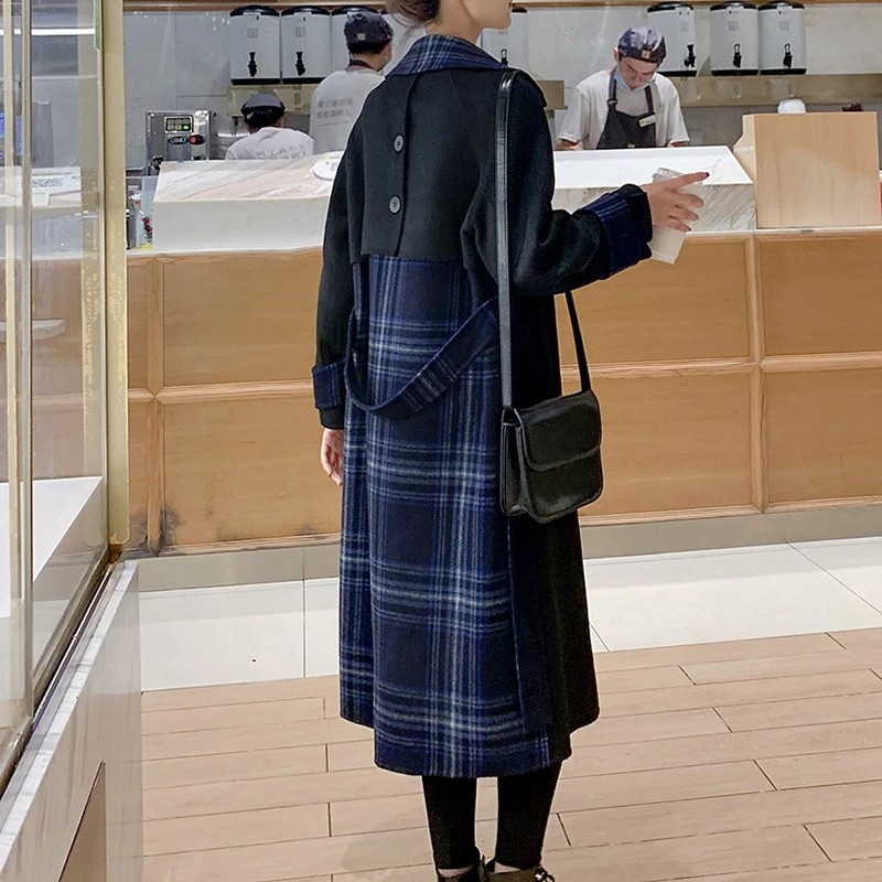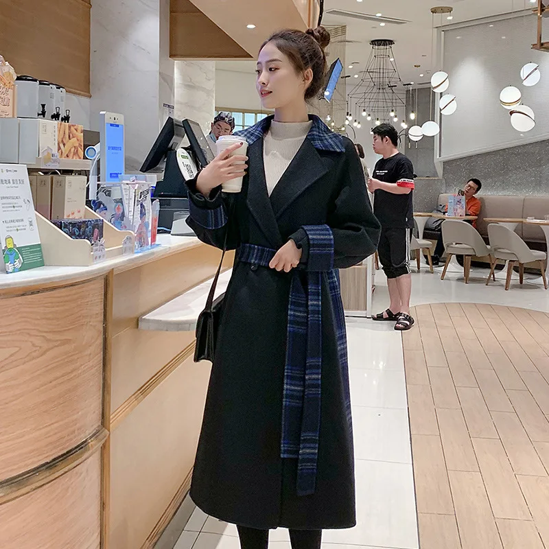 Elegant Turn Down Collar Cashmere Coat Women Belted Stitching Plaid 100% Wool Coat