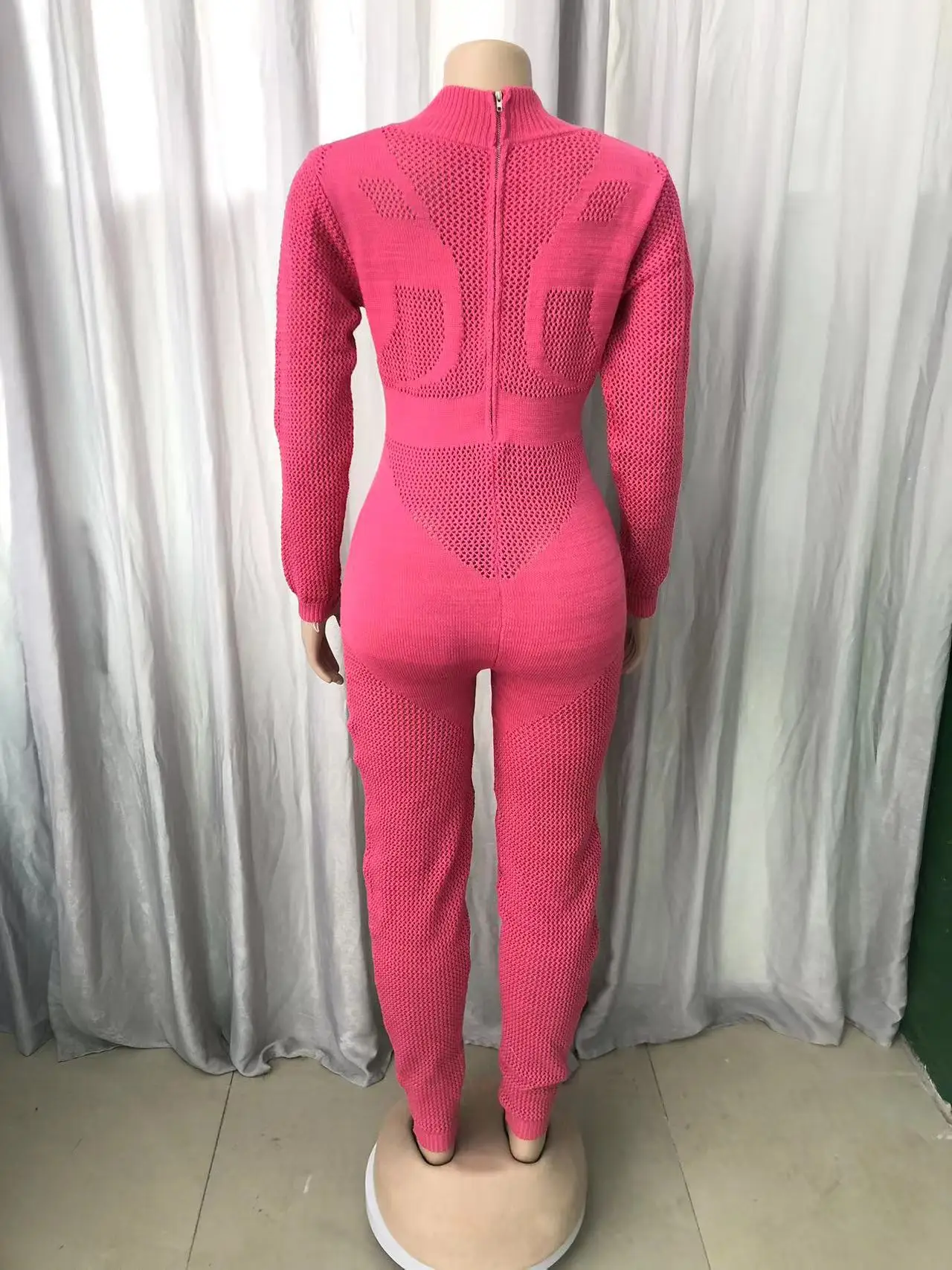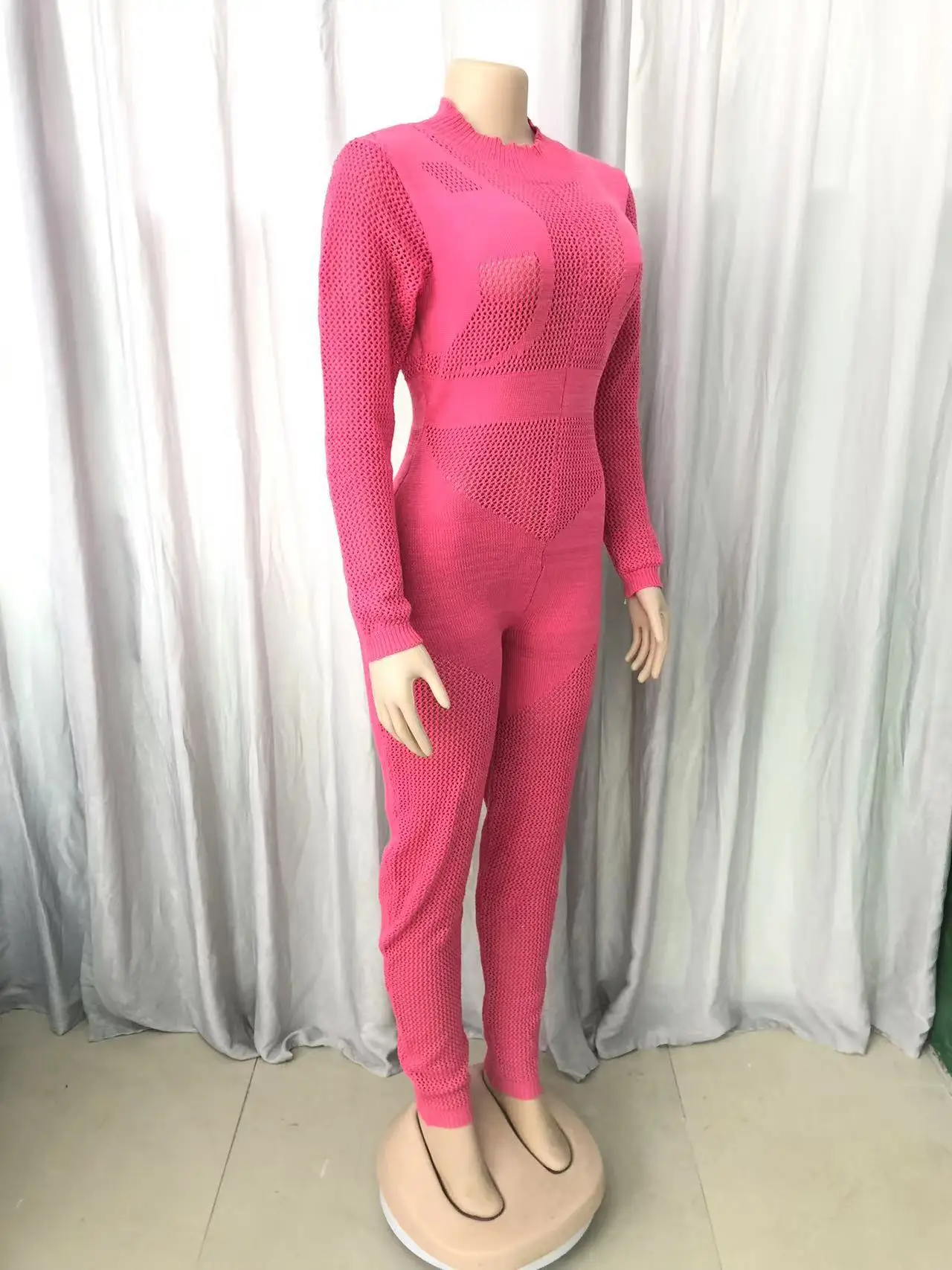 Fall Winter Clothing 2023 New Arrivals Women Birthday Jumpsuit Tight Fitting See Through Sexy Long Sleeve Knit Sweater Jumpsuit