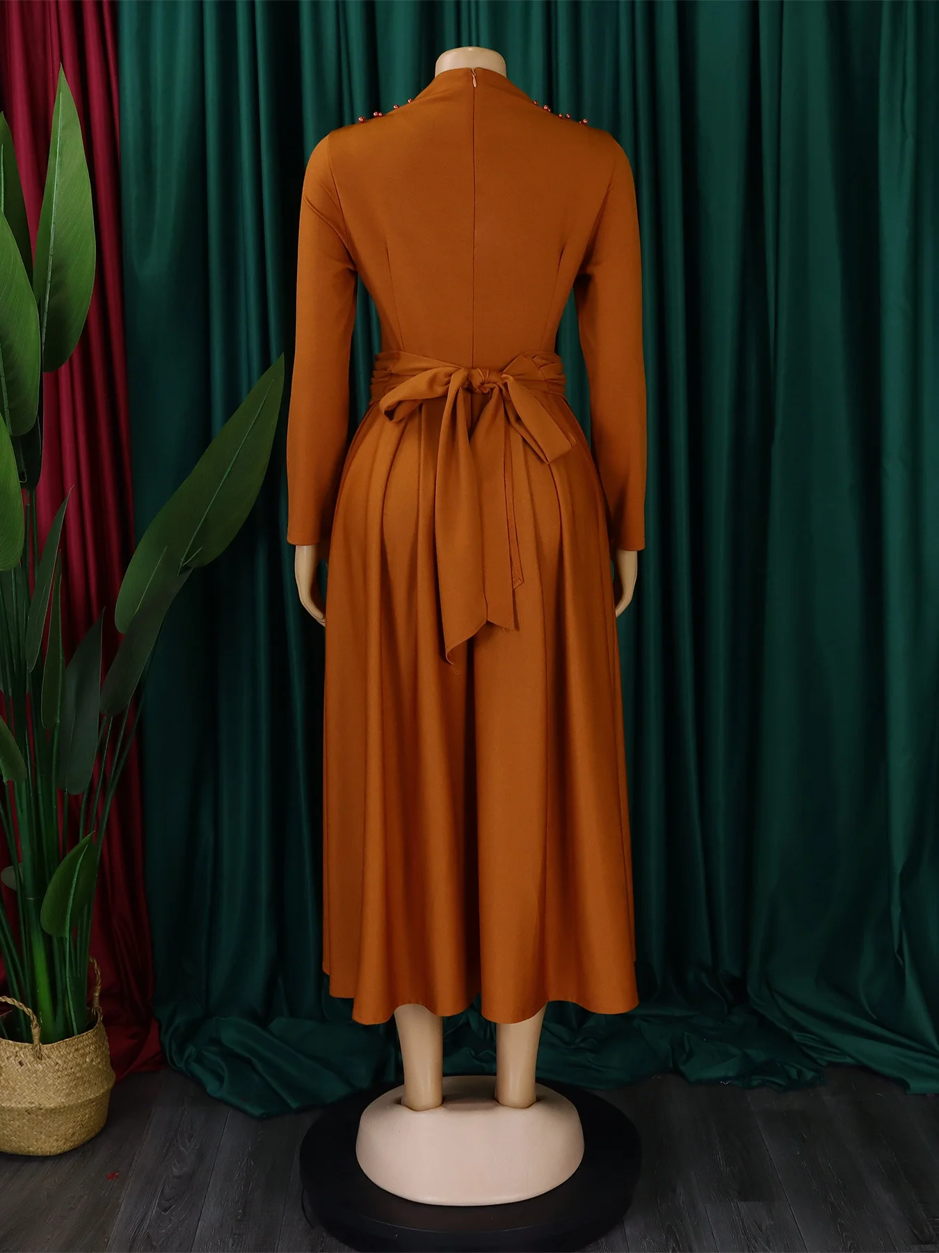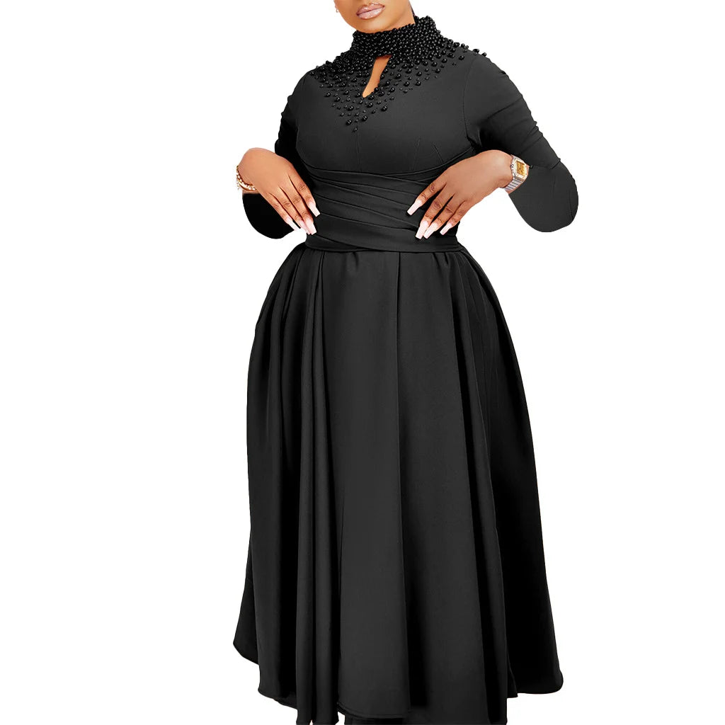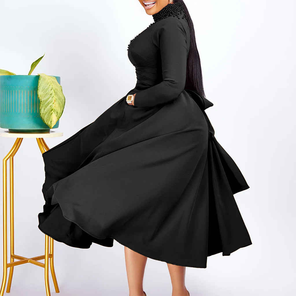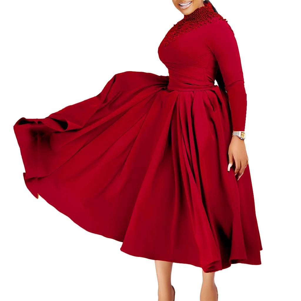 Fashionable High-collar Elegant Embroidered Large Dress Women Waist-shaping African Dress Trendy Plain Pattern Long Skirt