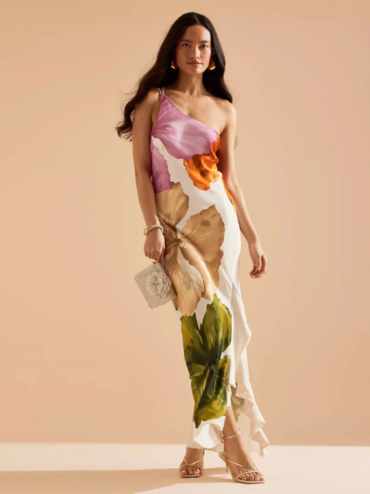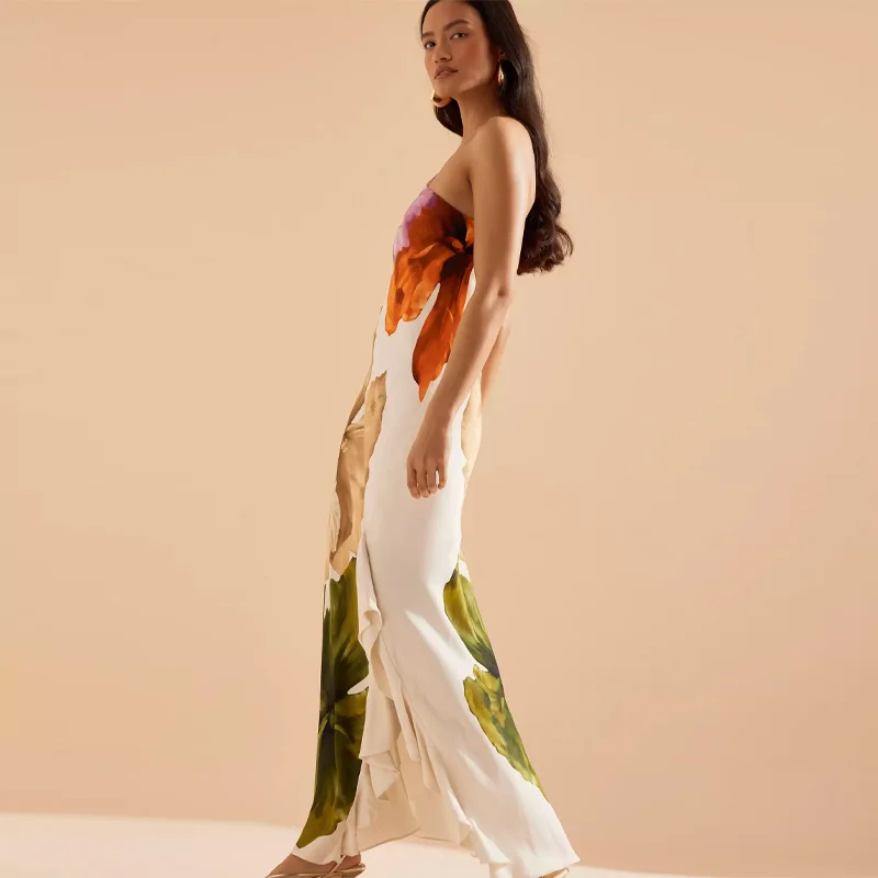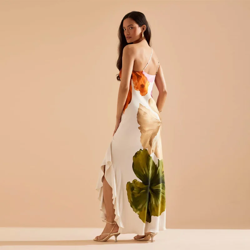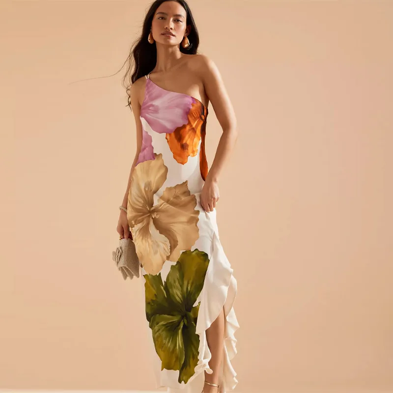 Flower Print Slanted Shoulder Dress Vintage Backless Sleeveless Skinny Irregular Robe For Women 2025 Summer Lady Beach Vestido