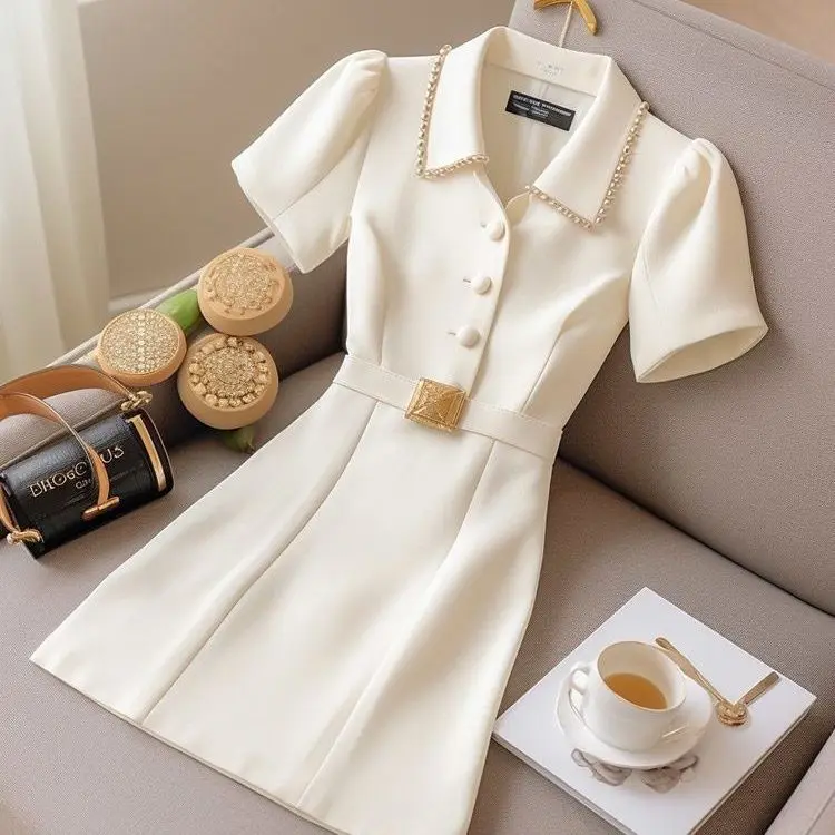 French white dress female spring and autumn new heavy industry beaded lapels senior age-reducing temperament waist (with belt)