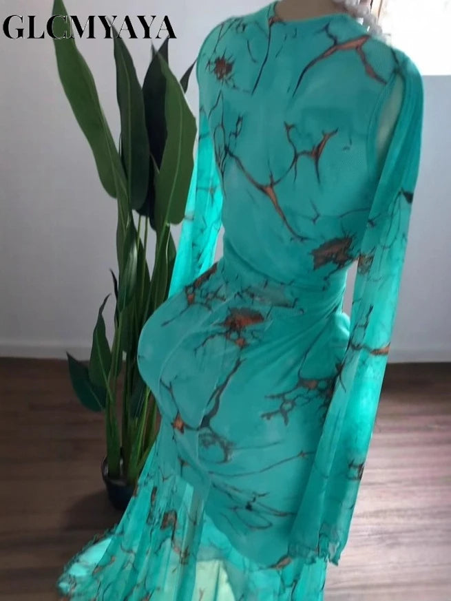 GLCMYAYA 2025 Fall Women O-neck Long Sleeve Print Mermaid Maxi Dress 2025 Evening Birthday Beach Sexy Night Party Long Dresses