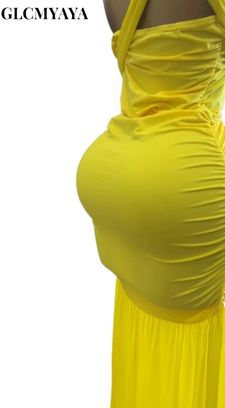 GLCMYAYA Women Halter Neck Ruched Stacked Sleeveless Bodycon Midi Maxi Long Dress 2025 Summer Vacation Holiday Elegant Dresses