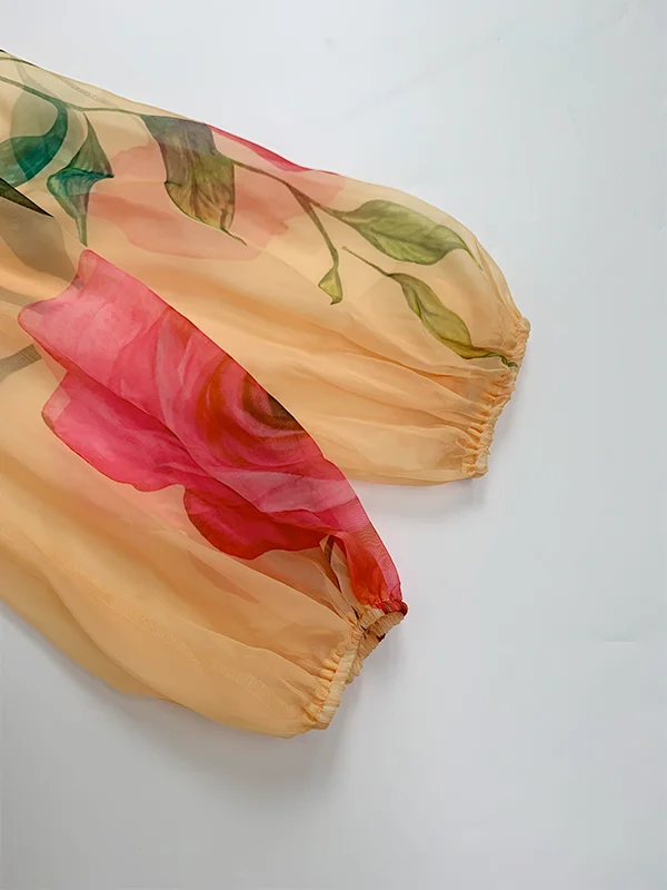 Gymystars Woman Beach Dress Elegant Party Dresses Summer Fashion Puff Sleeves Flower Print See-Through Chiffon Bohemian Dress