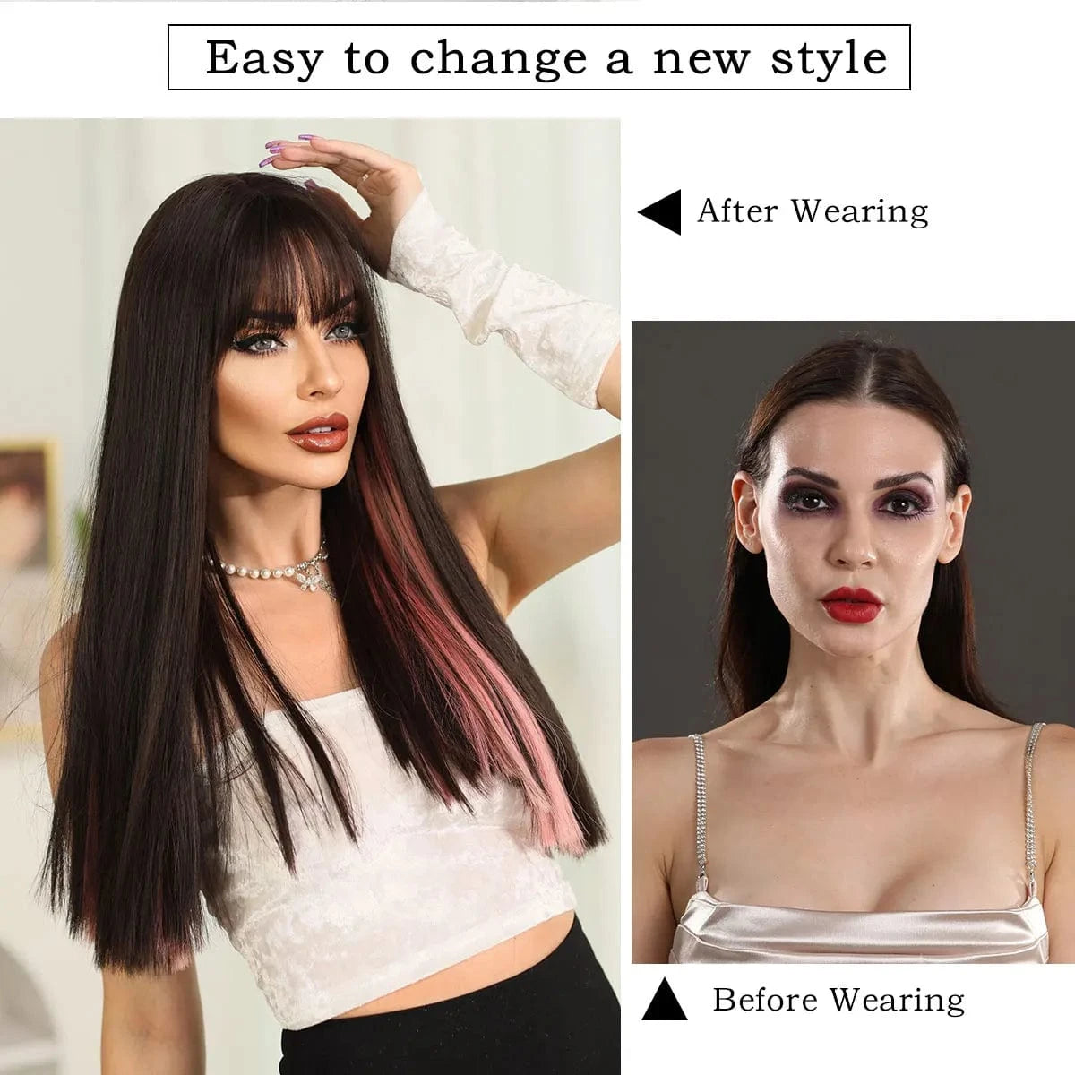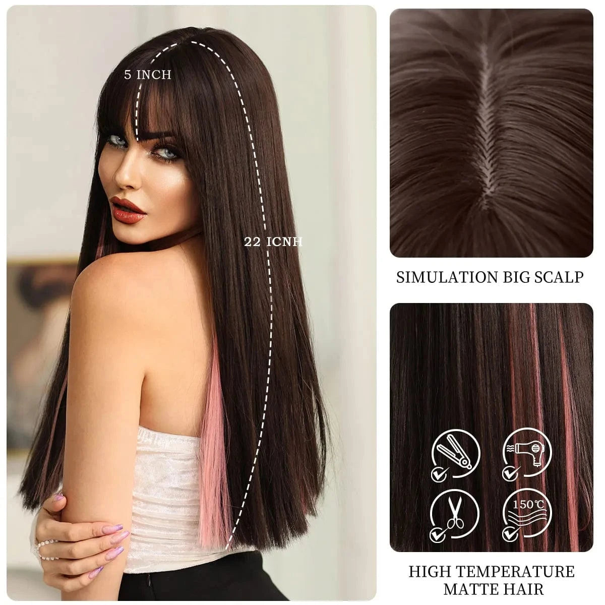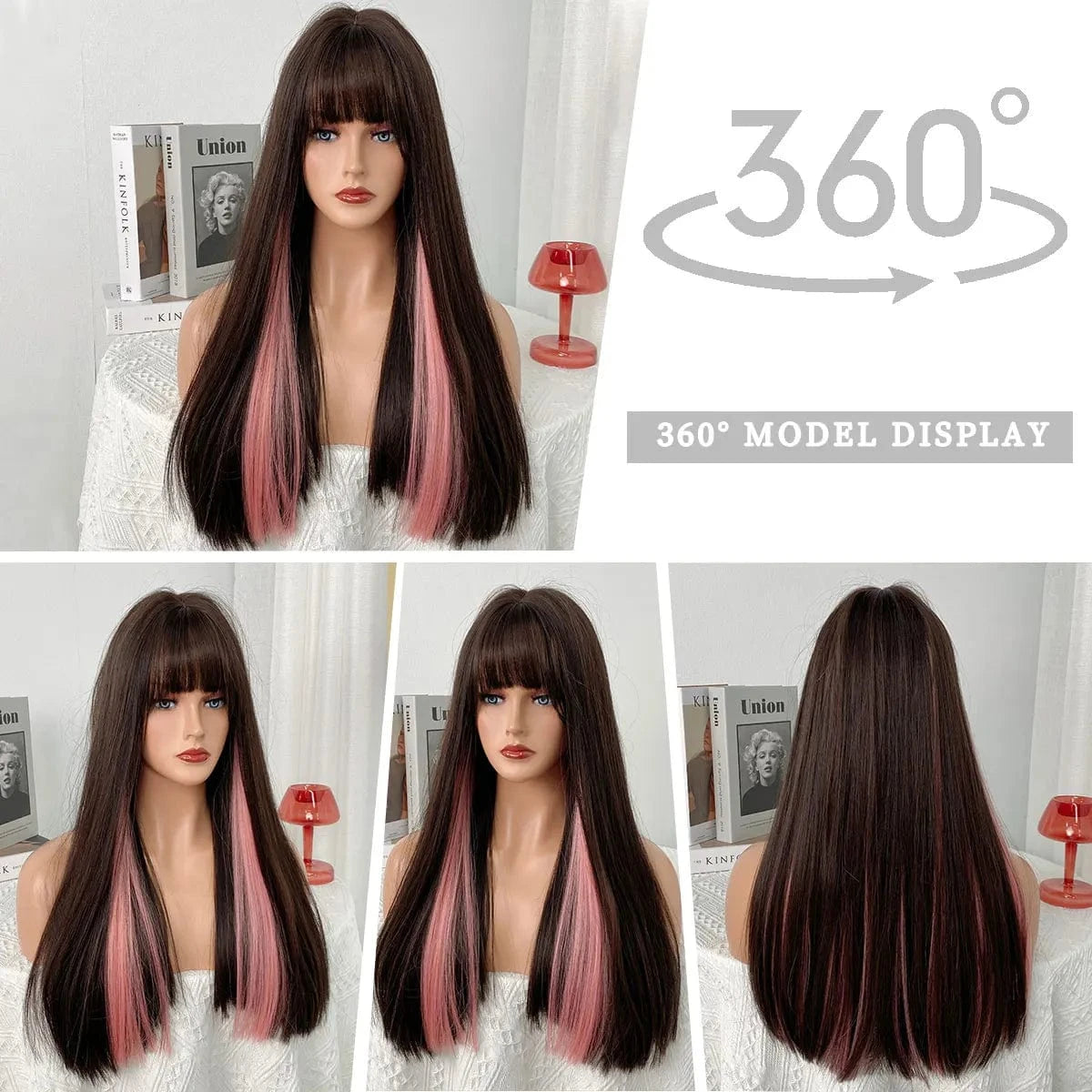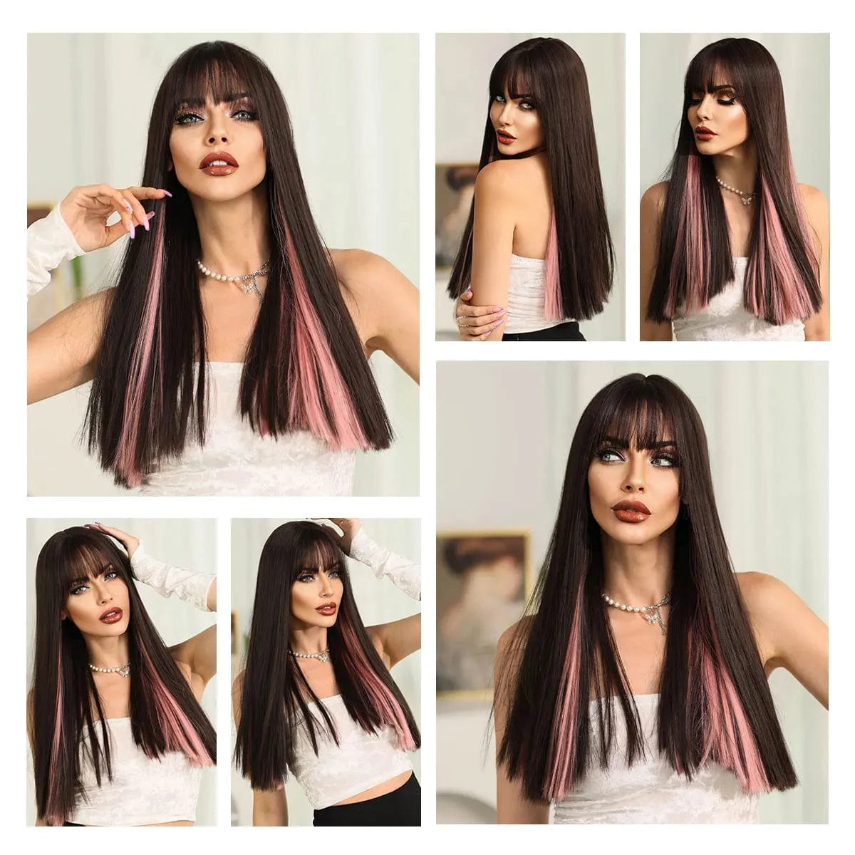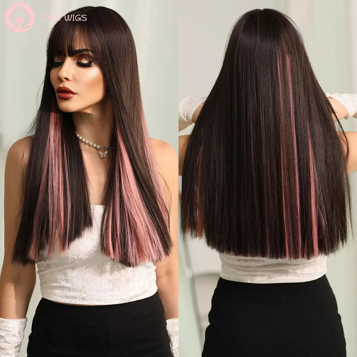 Highlights Pink Wig with Bangs Long Straight Wigs for Women,Heat Resistant Light Pink Synthetic Wigs Black Pink Hair