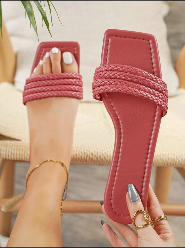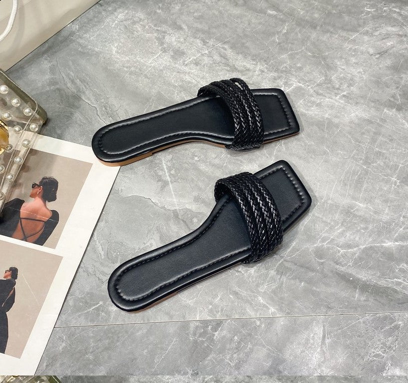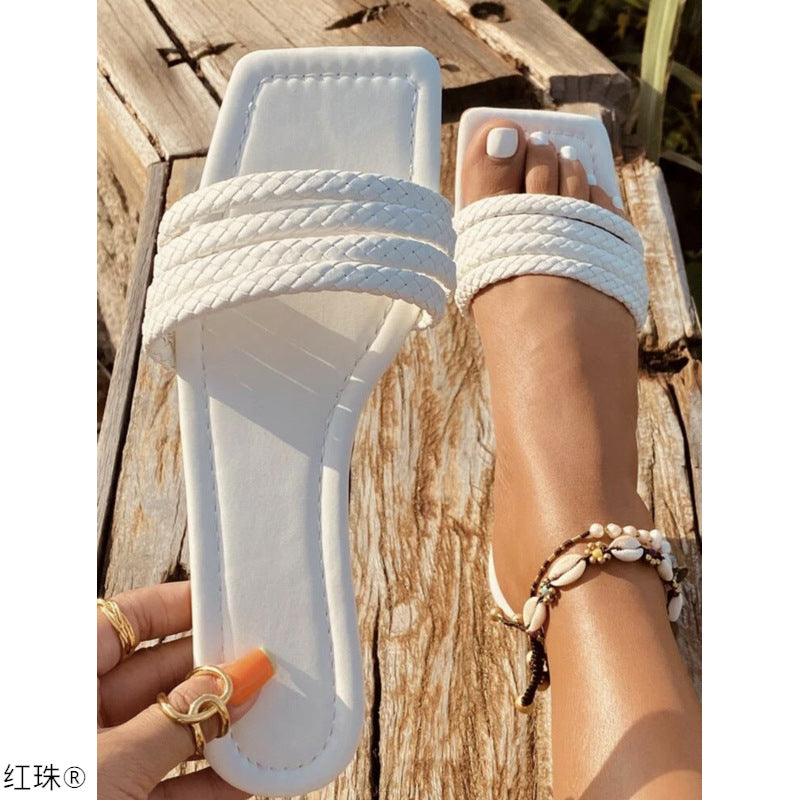 En stock, venta al por mayor, sandalias para interiores y exteriores, zapatillas de talla grande para mujer, zapatillas de playa planas tejidas caladas con fondo plano de verano para mujer