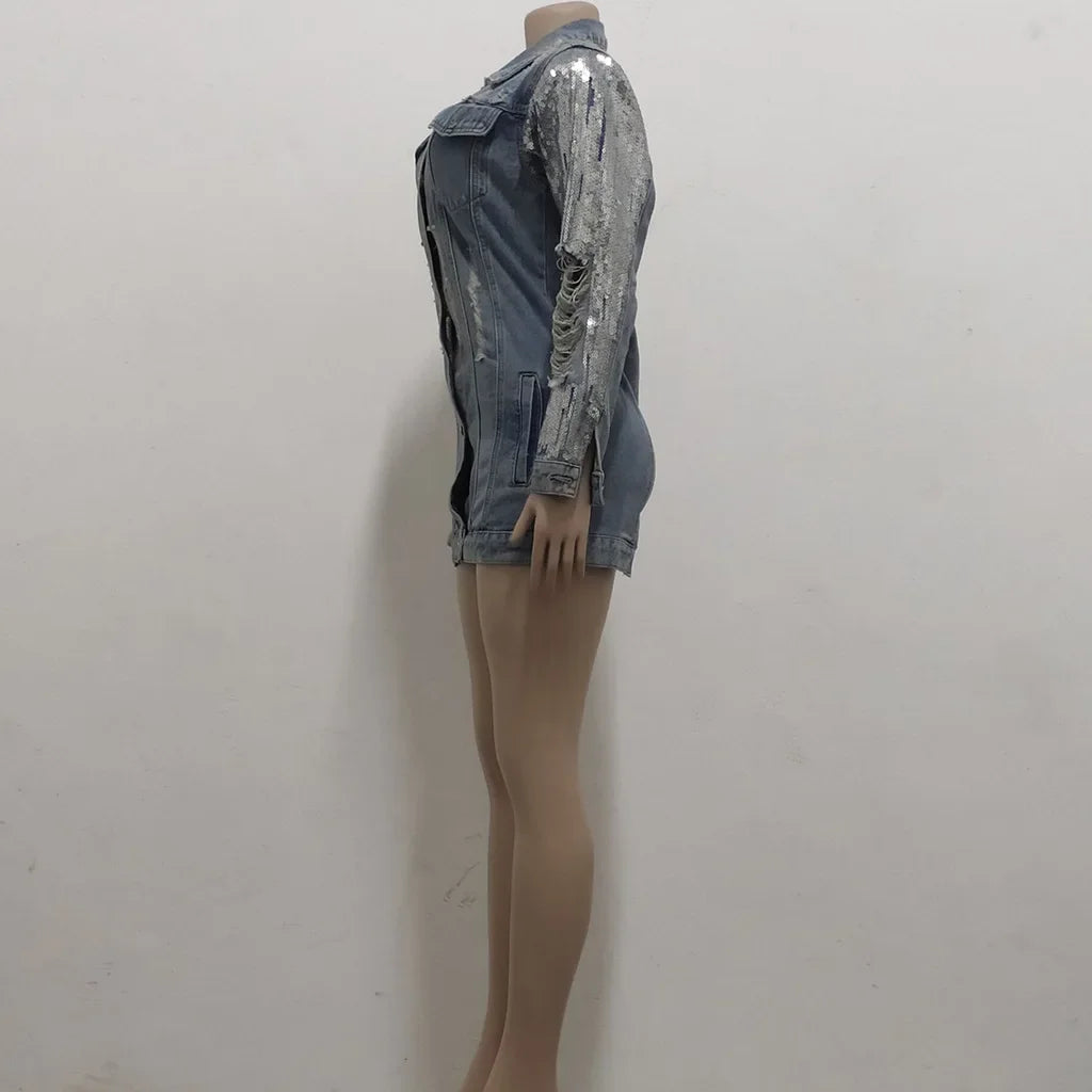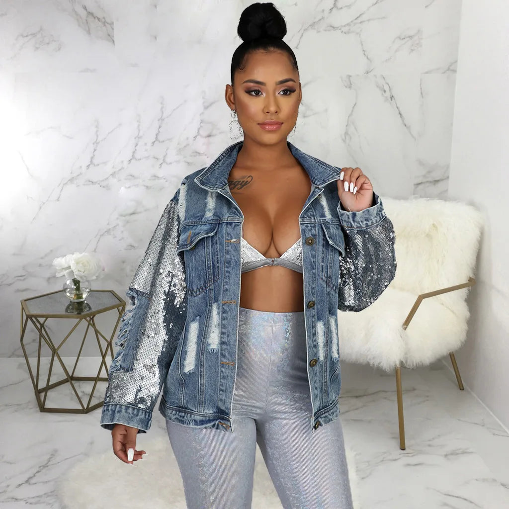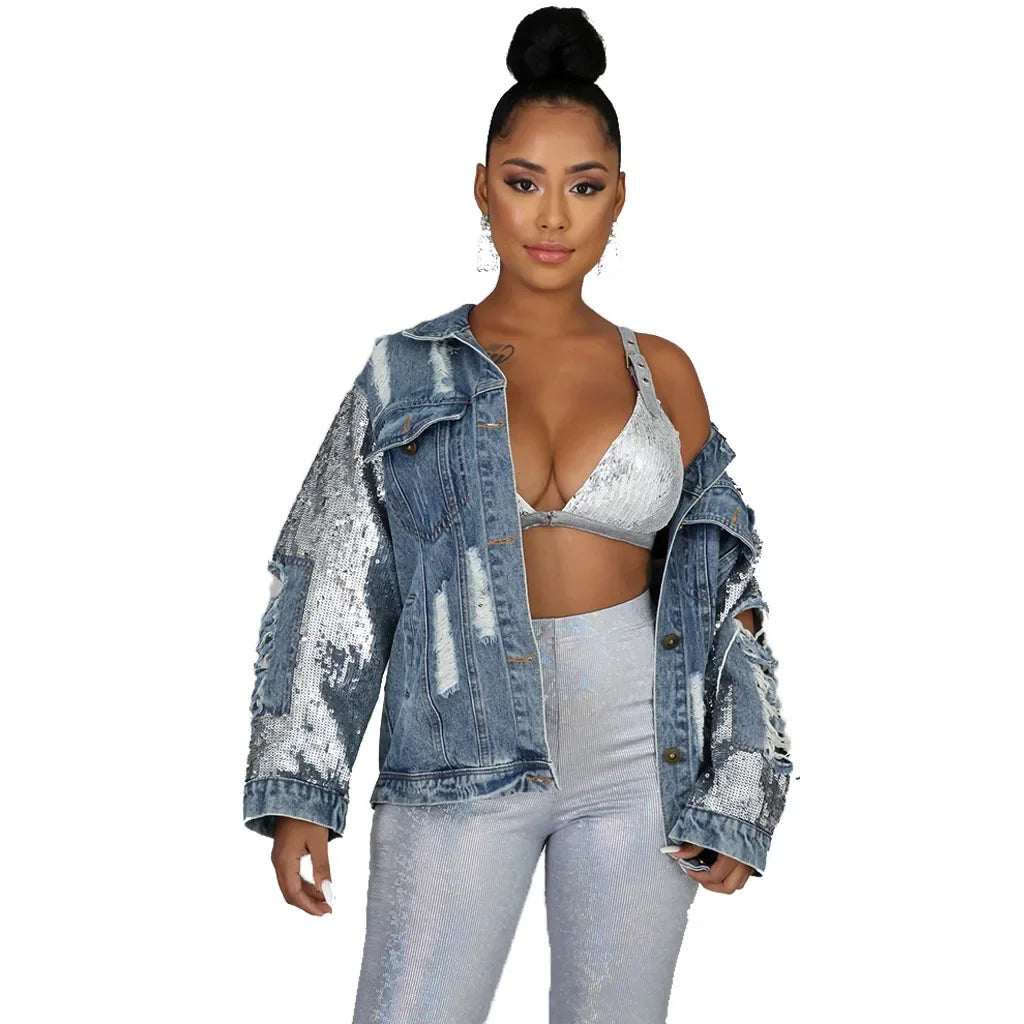 Jackets Women Denim Coat Hole Sequins Patchwork Single Breasted Turn Down Collar Y2k Vintage Streetwear 2025 Autumn Outerwear