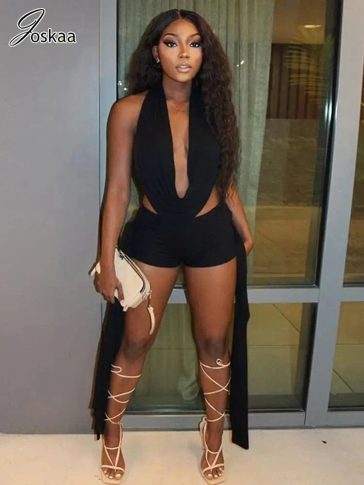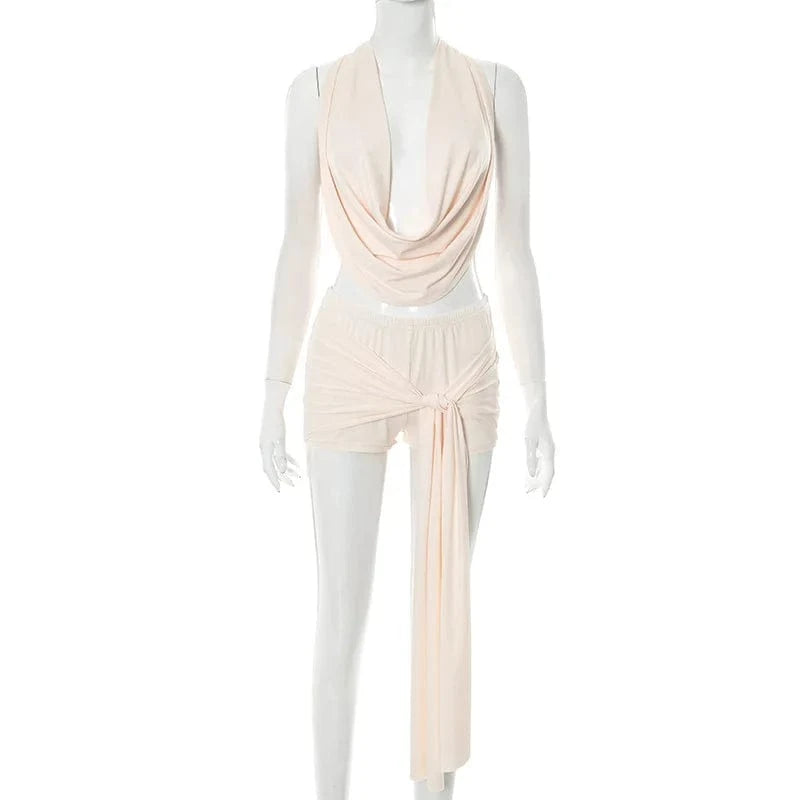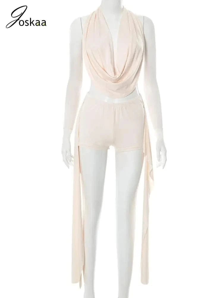 Joskaa 2025 Summer Beach Style 2 Piece Sets Women Sexy Backless Bandage Halter Tops and Ribbons Shorts Matching Vacation Outfits