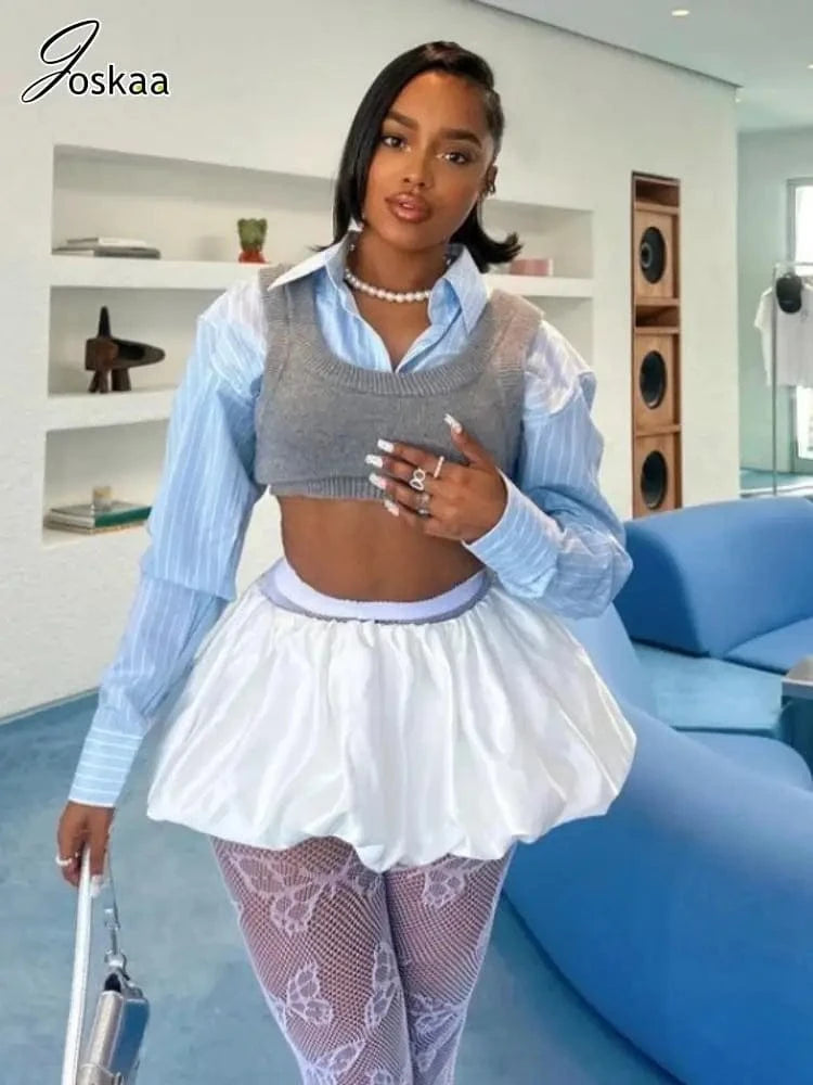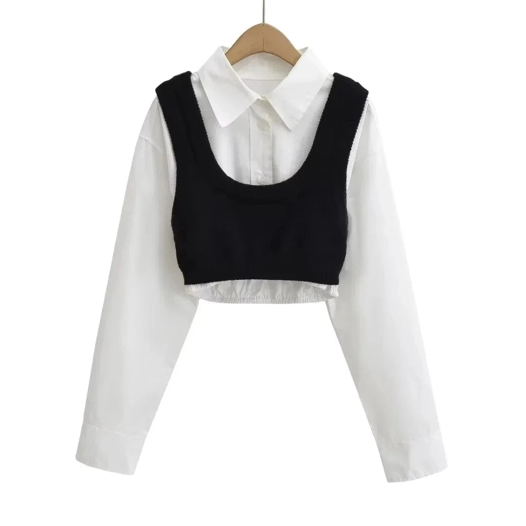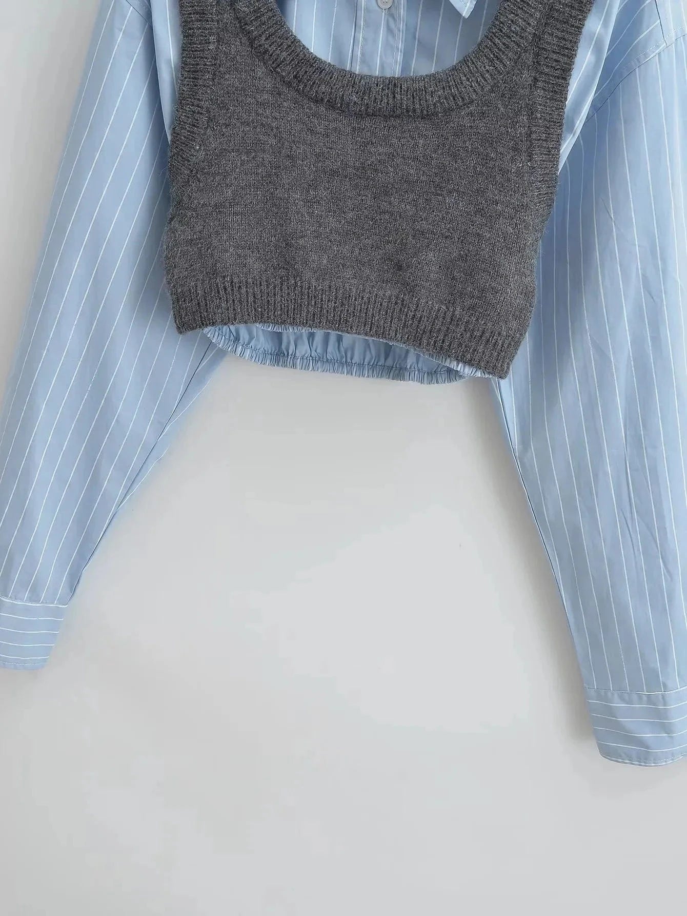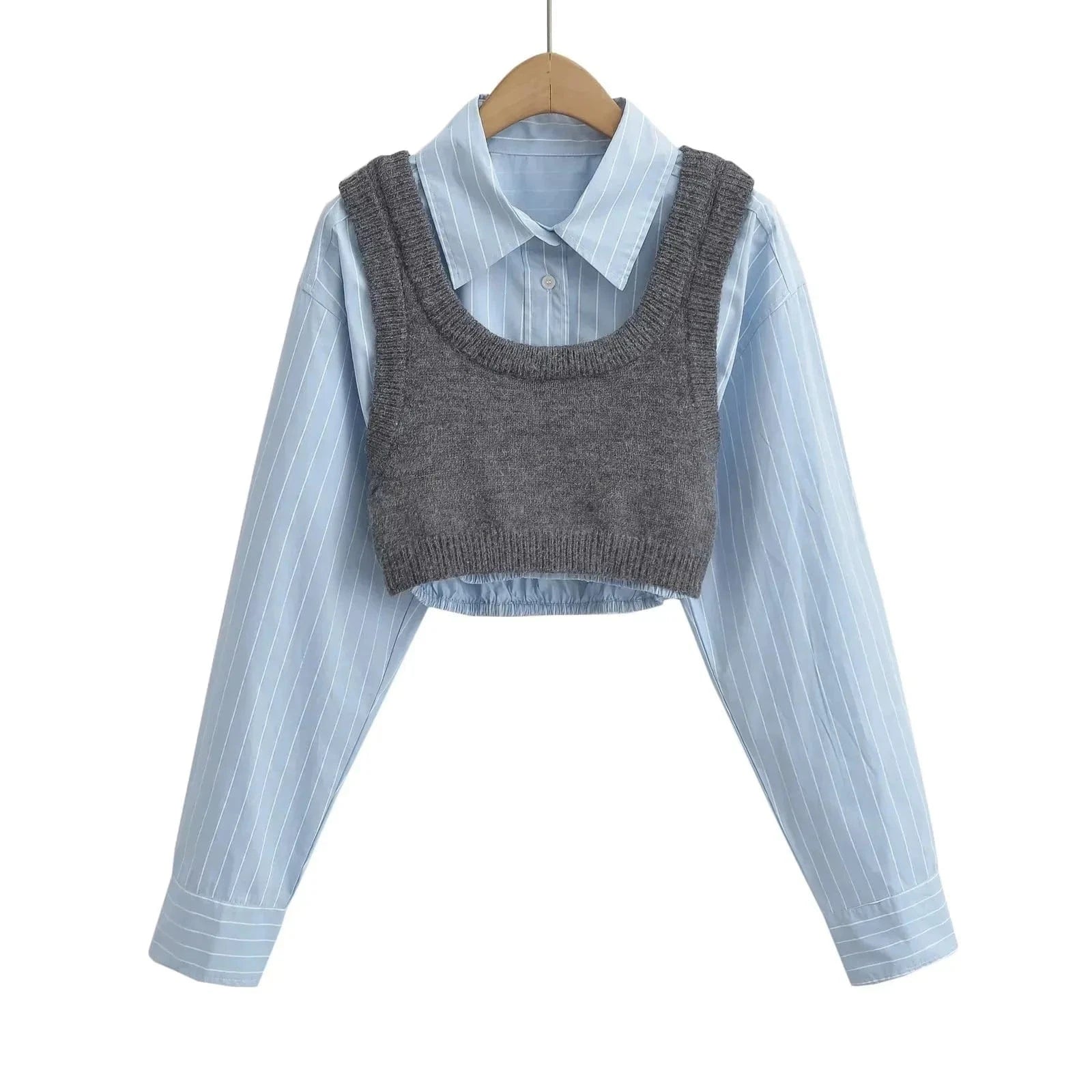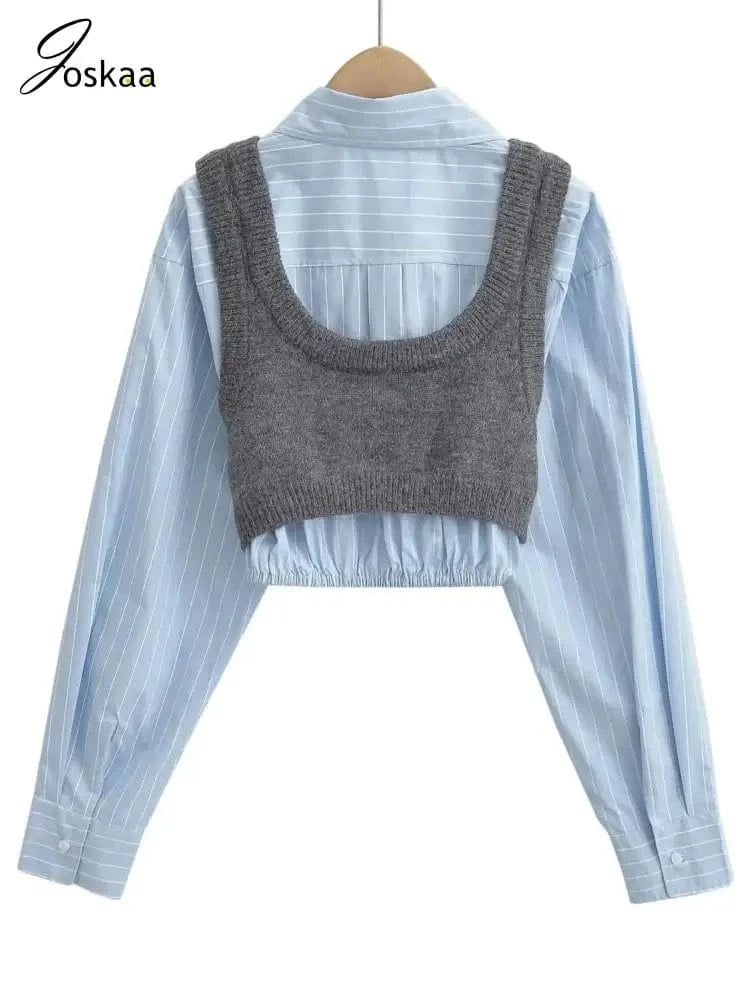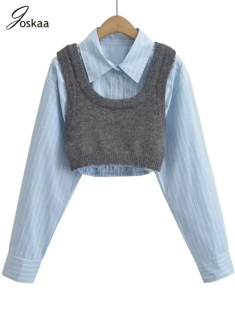 Joskaa Women Lapel Long Sleeve Single Breasted Cropped Shirt with Knitted Vest 2 Piece Set 2024 Summer Fashion Tops Streetwear