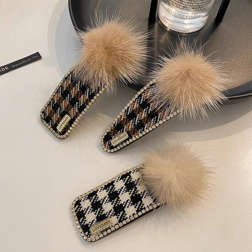 Korean Rhinestone Barrette Lattice Pattern Bobby Hairpin Good Price Soft Fluffy Faux Rabbit Fur Hair Clips for Woman Girls