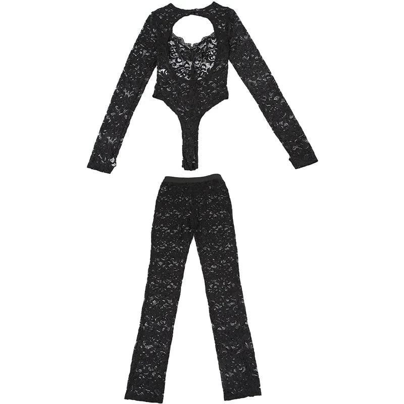 Lace See Through 2 Piece Set Women 2024 Autumn Sexy Hollow Jacquard Backless Bodysuit Leggings Party Clubwear Skinny Outfits