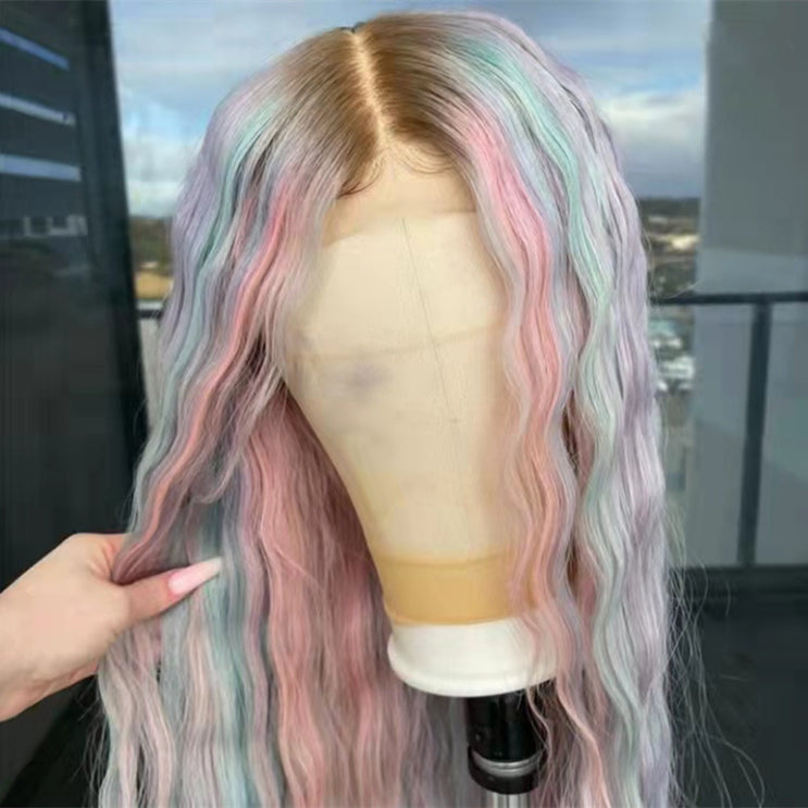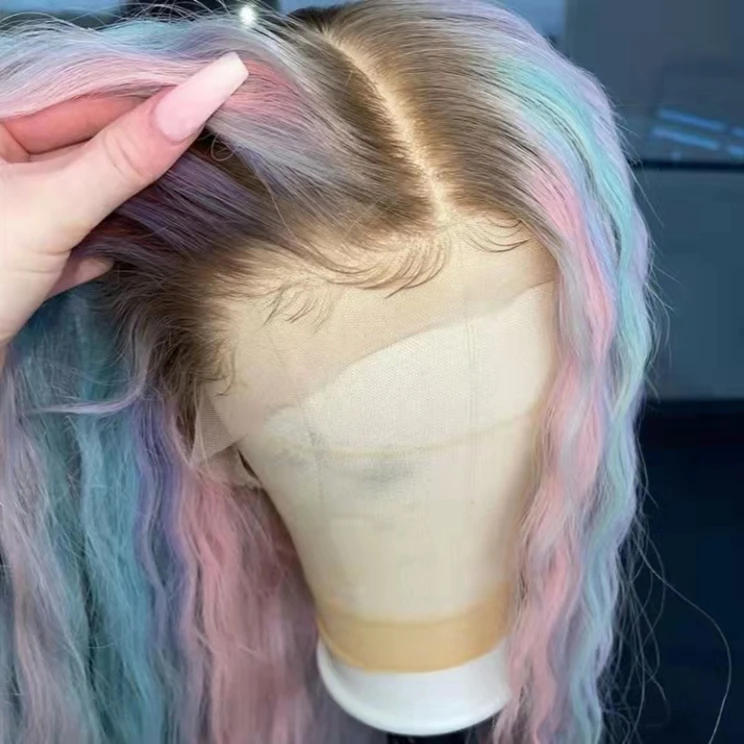 Peluca de encaje suizo de color arcoíris para mujer, pelucas delanteras de encaje de cabello humano alineadas con cutícula ondulada larga y recta, color rosa degradado