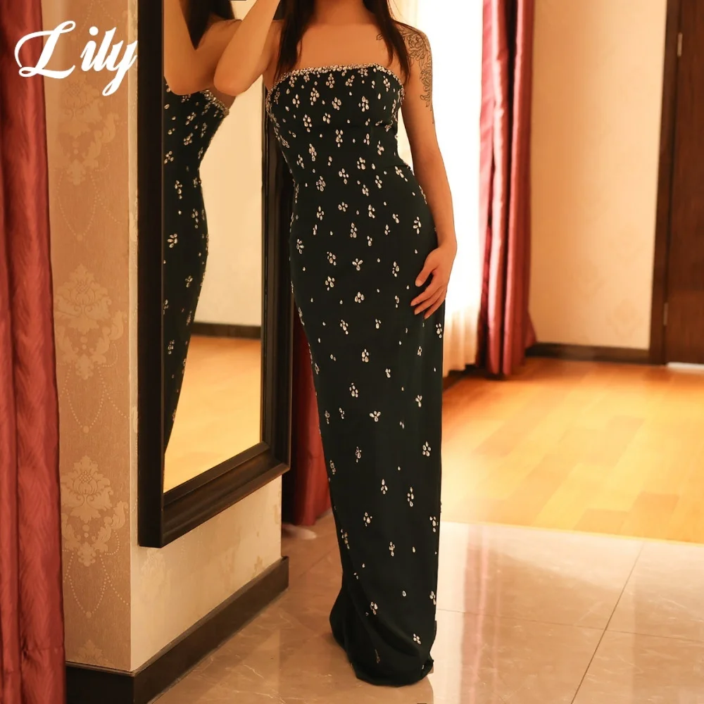 Lily Black Formal Gown Strapless Sleeveless Evening Gown with Pleats Satin and Glitter Crystals Trumpet Party Dress Customized
