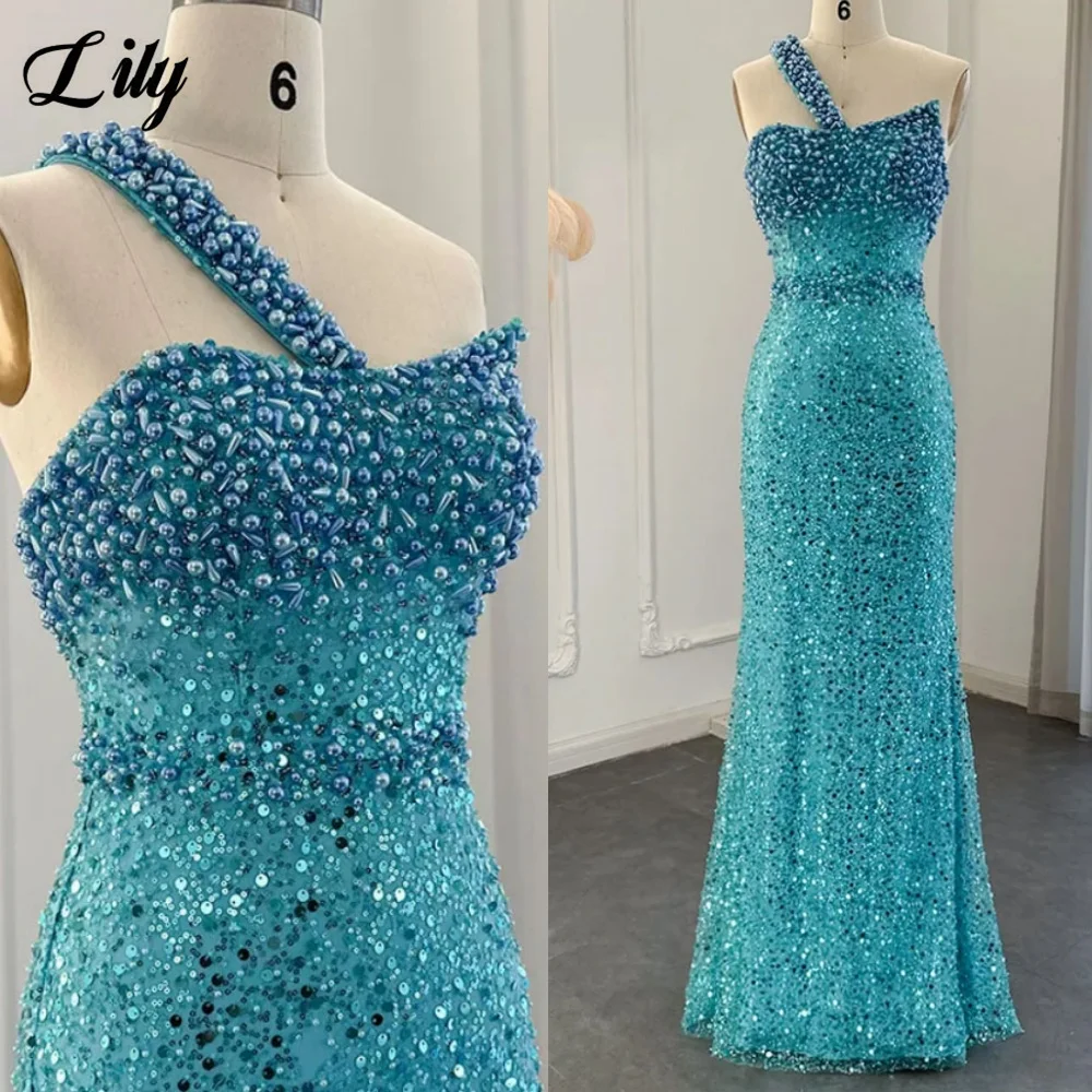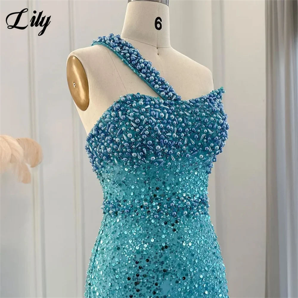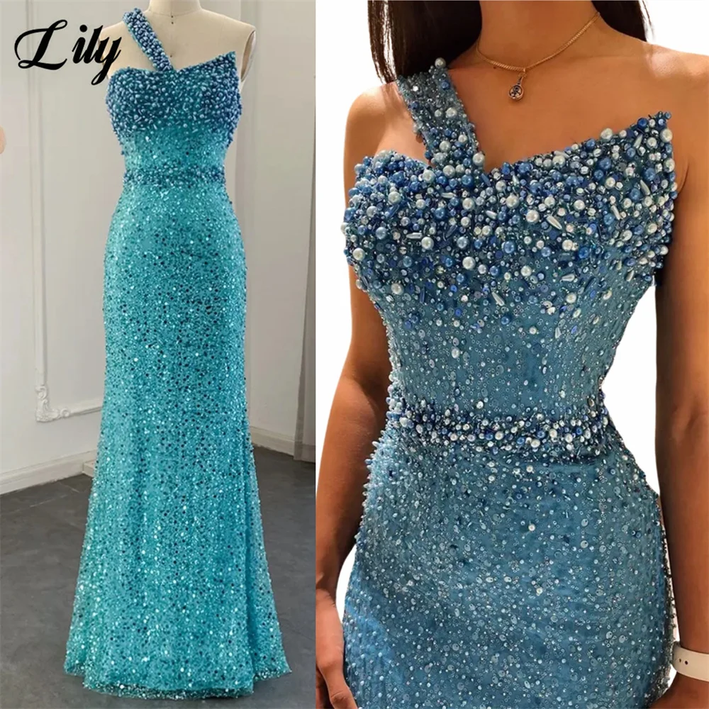Lily Blue Gorgeous Rhinestones Prom Dresses One Shoulder Sleeveless Evening Dress Pearls Sequins Mermaid Party Gowns Customized