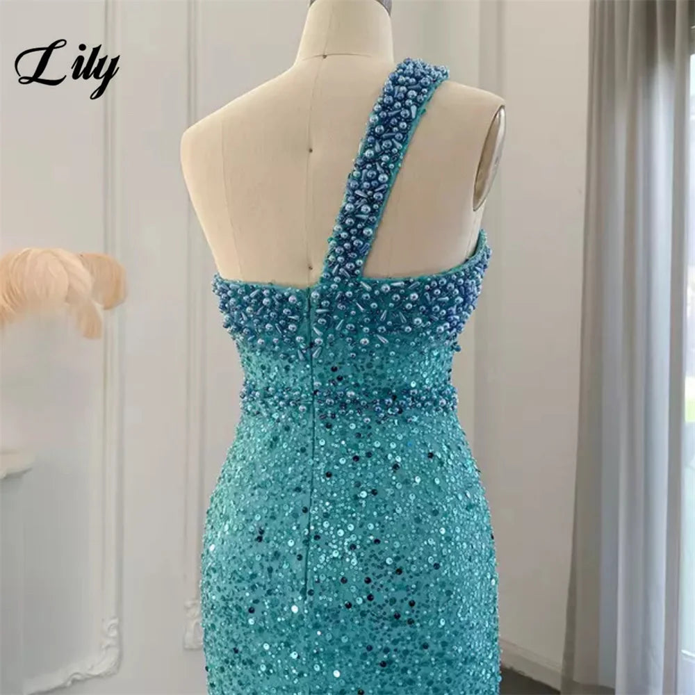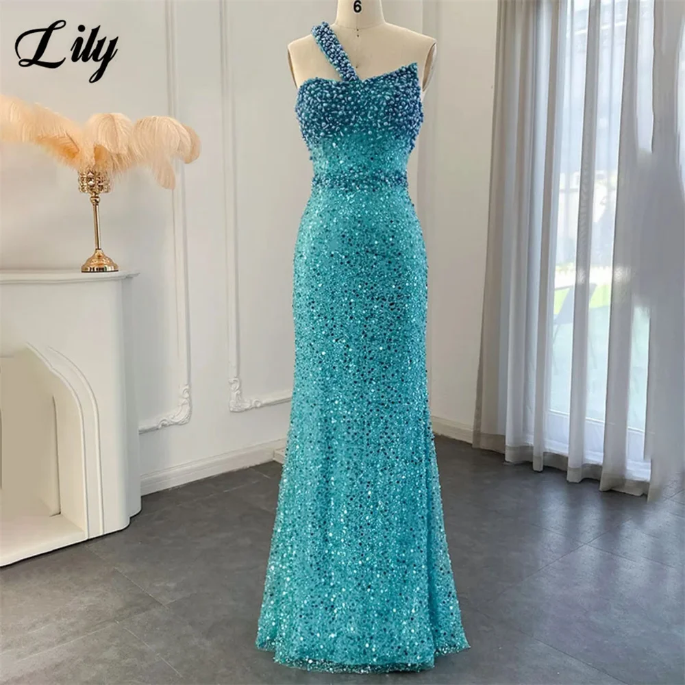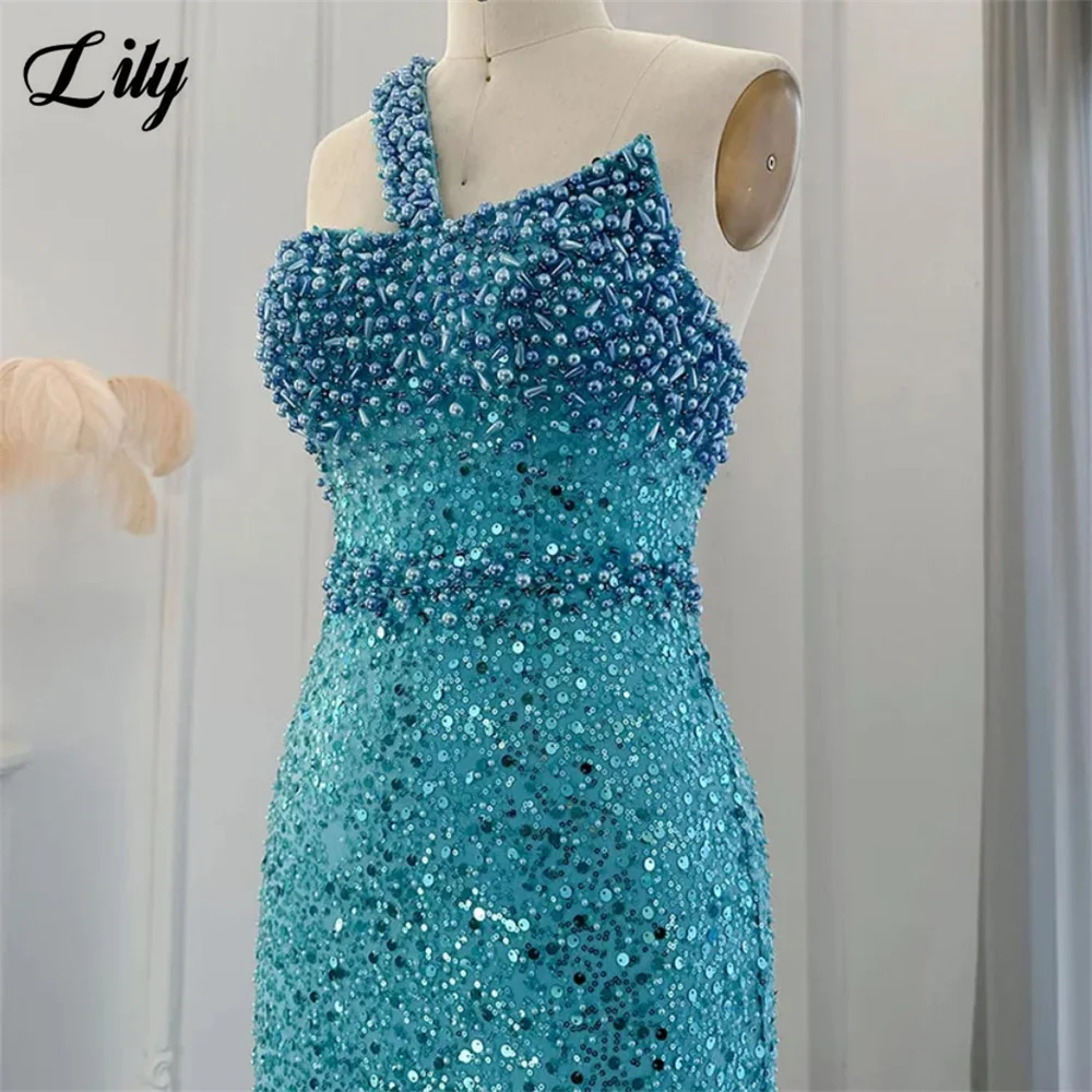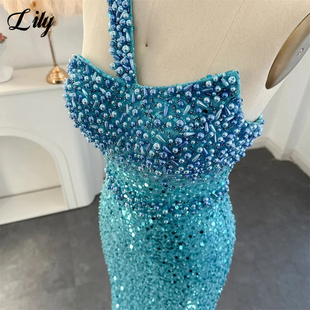 Lily Blue Gorgeous Rhinestones Prom Dresses One Shoulder Sleeveless Evening Dress Pearls Sequins Mermaid Party Gowns Customized