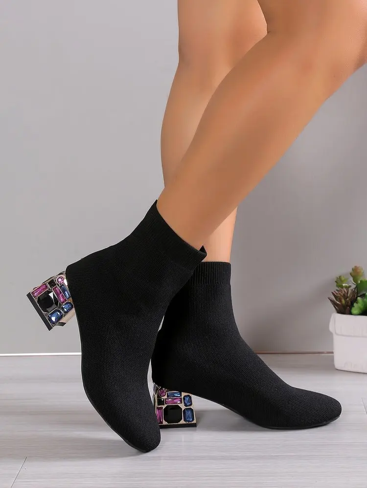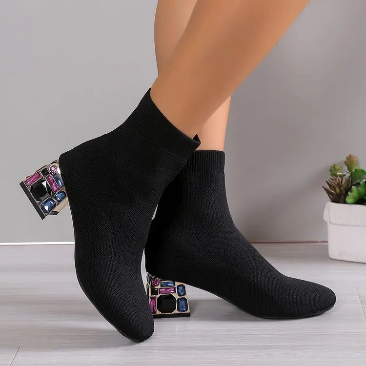 Lug Sole Slip On Chunky Block Heel Knitting Hot pink Black Ankle Classic Boots Women's Platform Chelsea Boots
