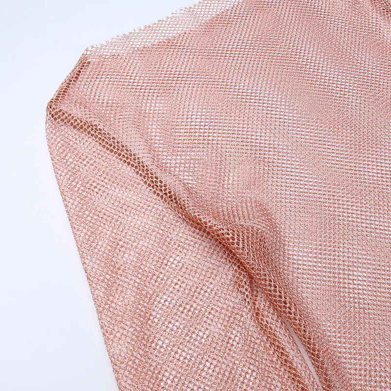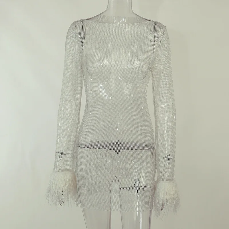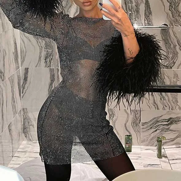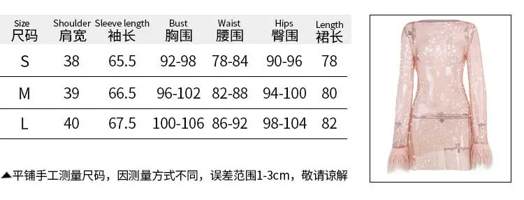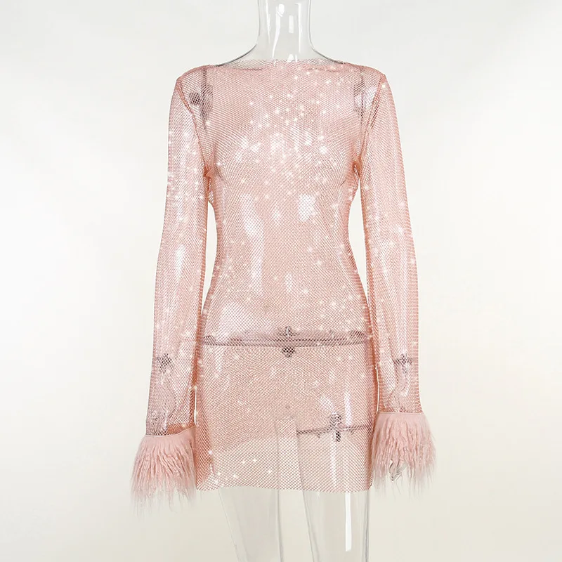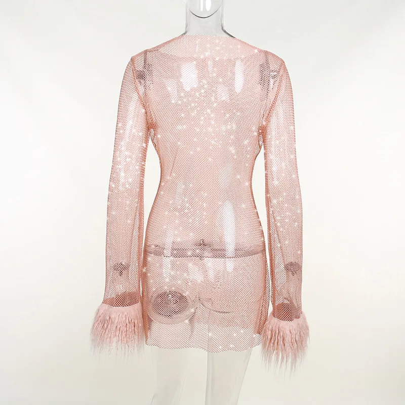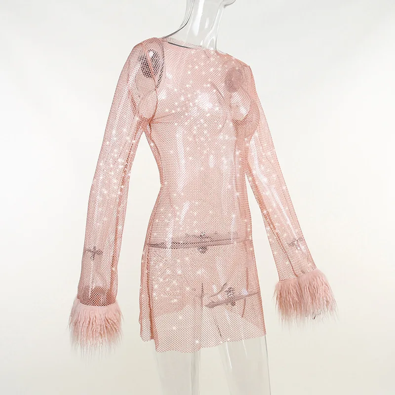 New Arrival Fashion Sexy Dresses Women Night Club Pink Mesh See Through Fur Sleeve Lady Party Dress