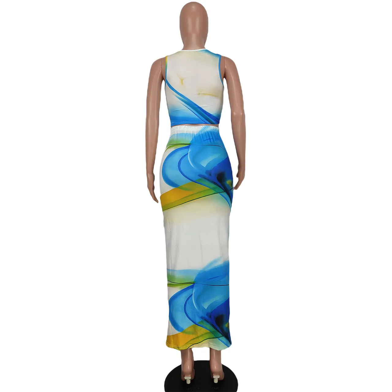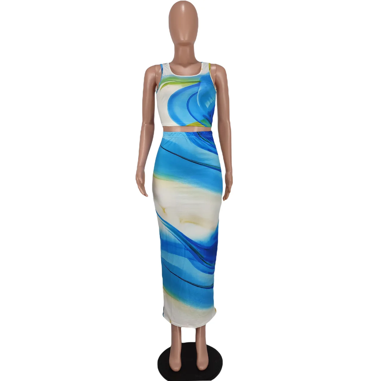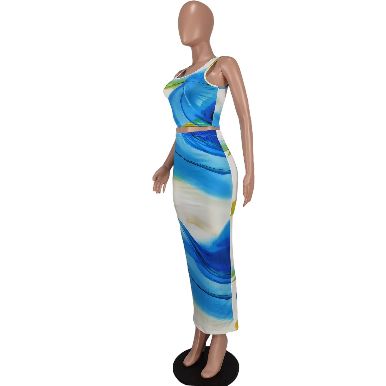 New arrivals 2023 women clothing crop tank top two piece skirt set printed sexy long maxi skirt set