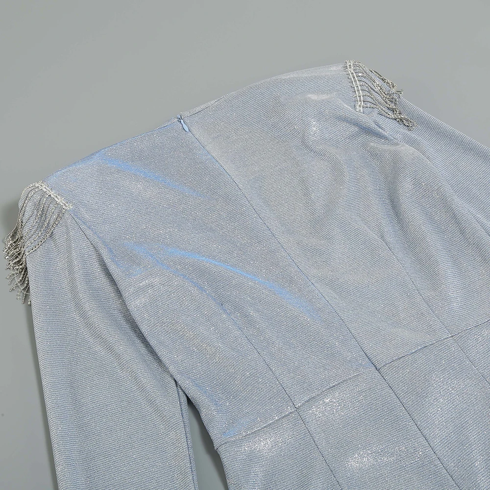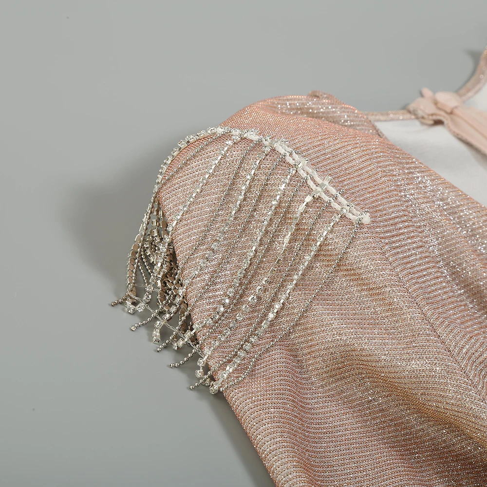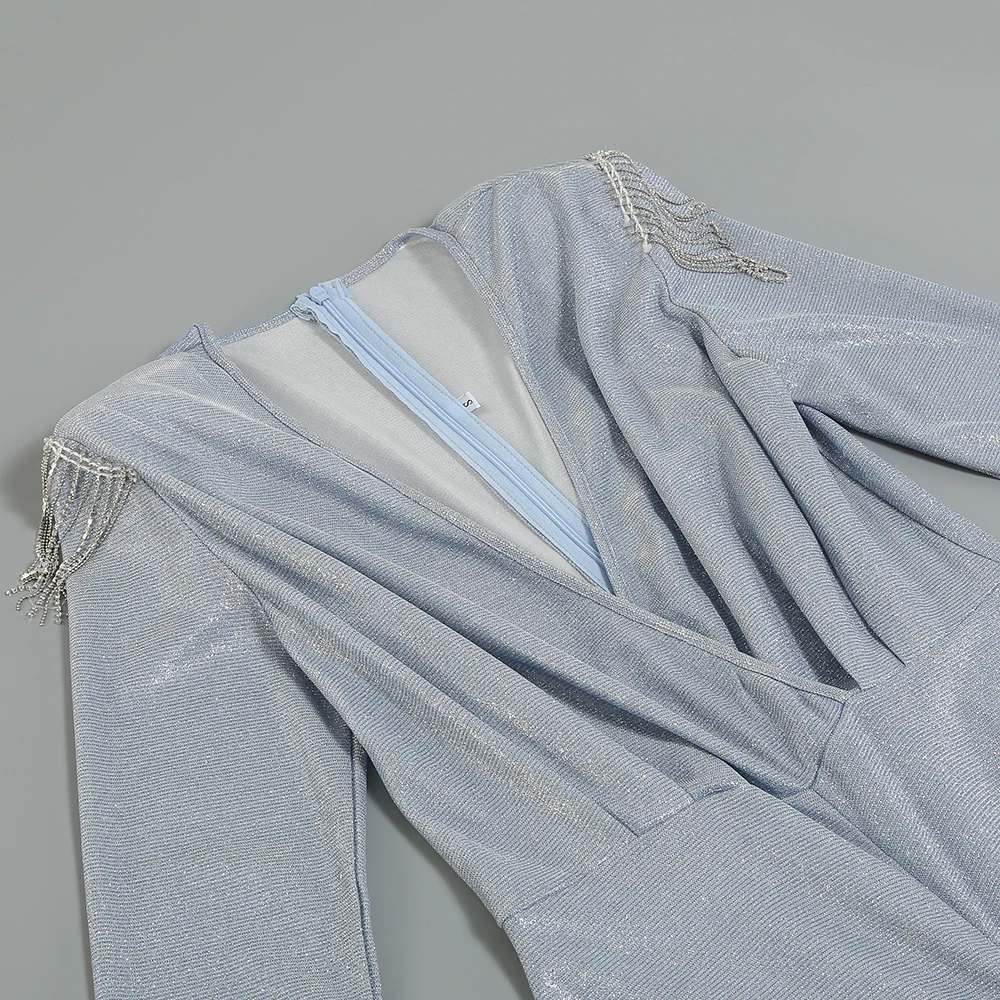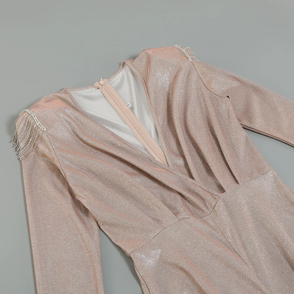 The deep V - neckline, long sleeves with tassel accents, and bejeweled belt create an ultra - chic