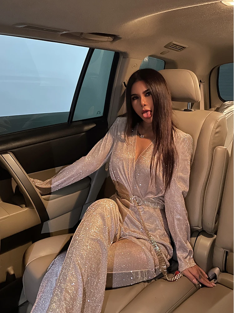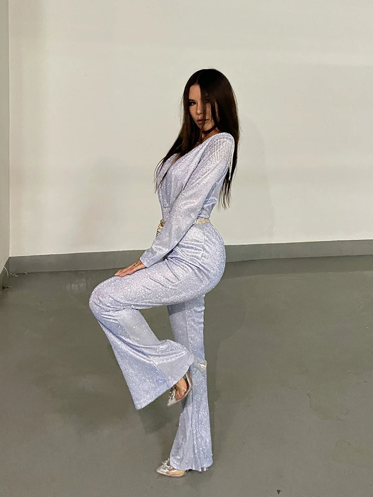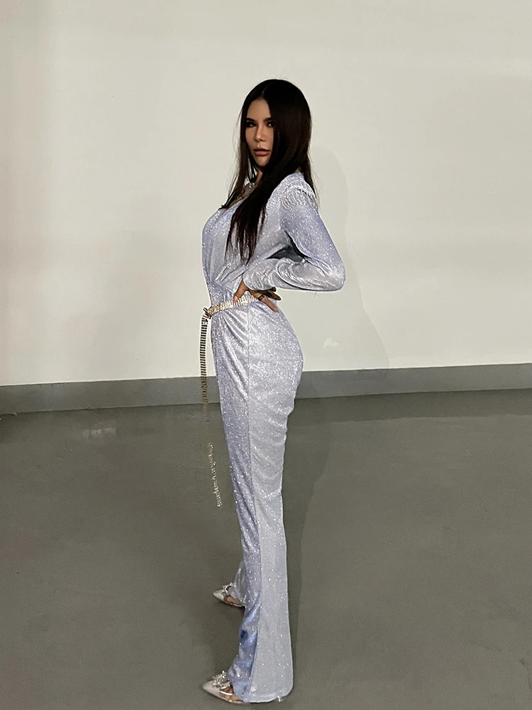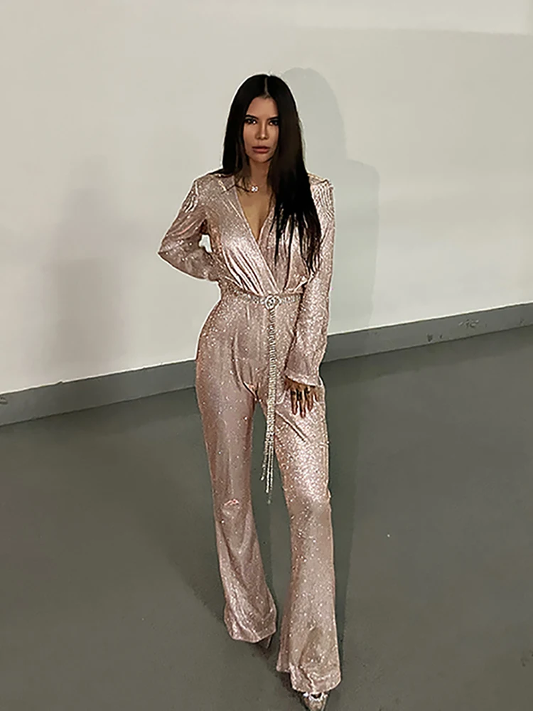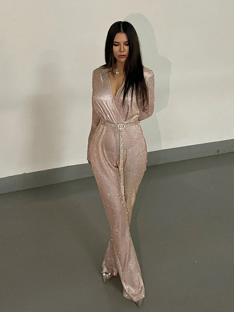 New Fashion Sequins Jumpsuit For Women 2025 Long Sleeves V Neck Draped Autumn Rompers Celebrity Evening Party Club Overall