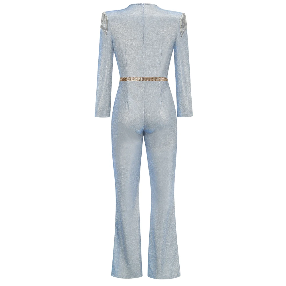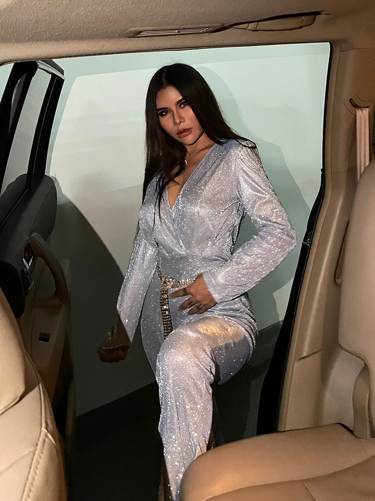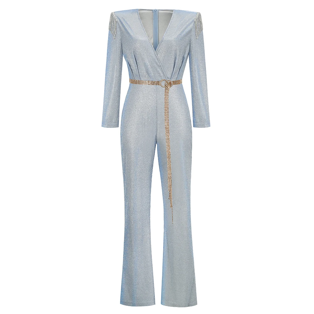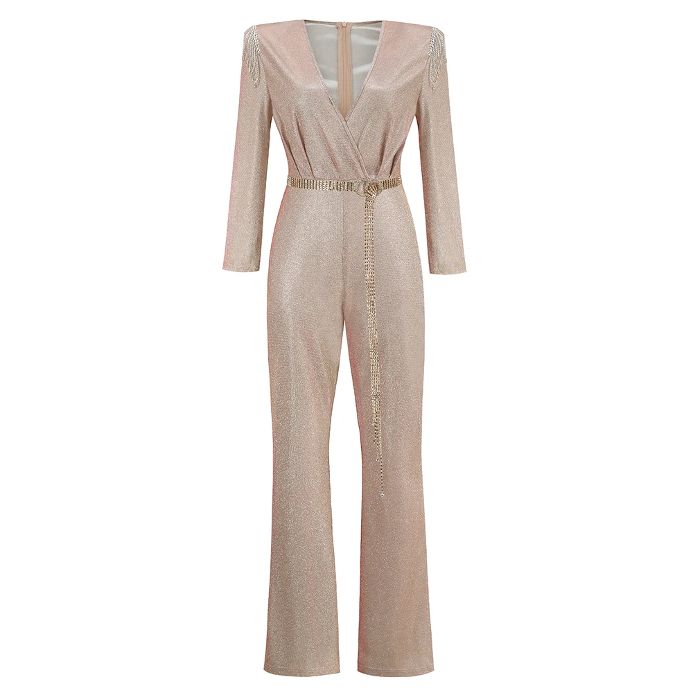New Fashion Sequins Jumpsuit For Women 2025 Long Sleeves V Neck Draped Autumn Rompers Celebrity Evening Party Club Overall
