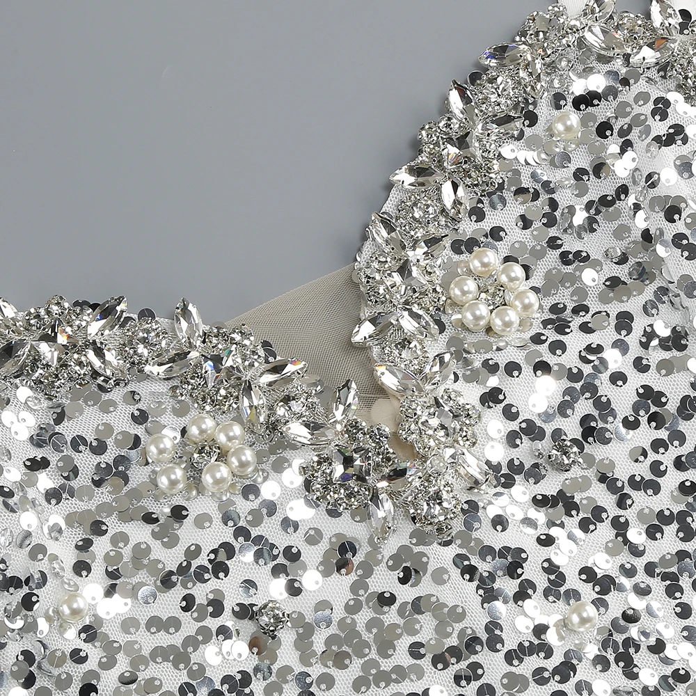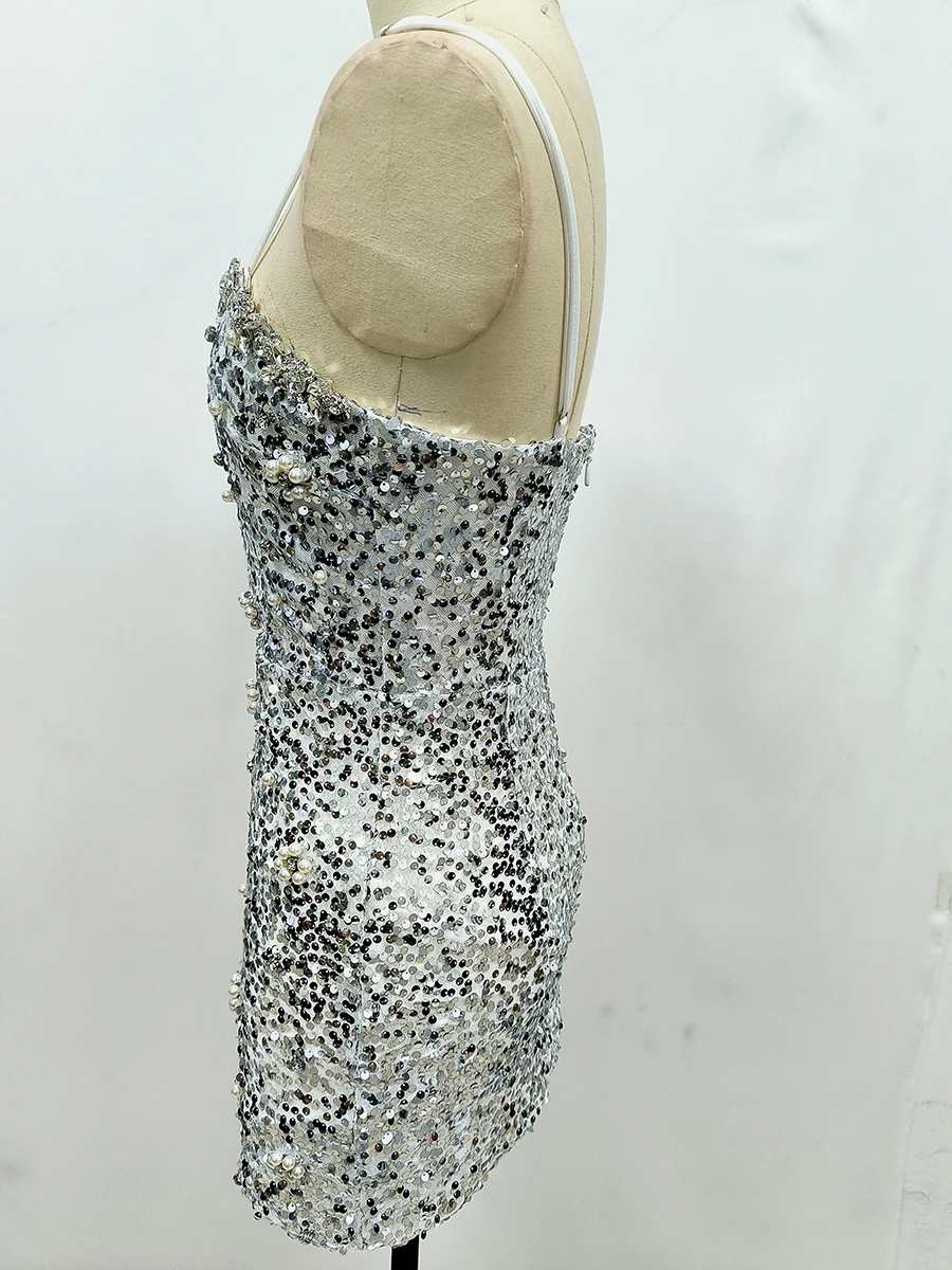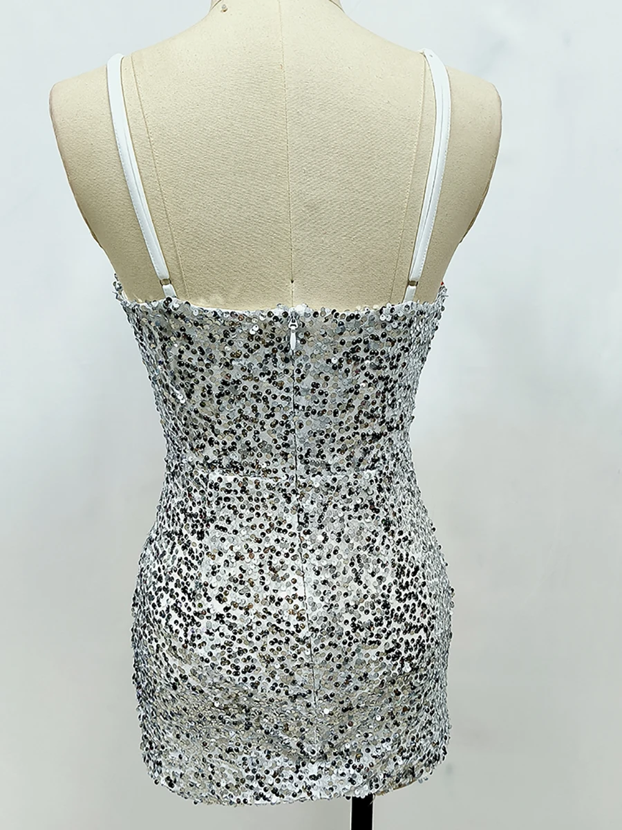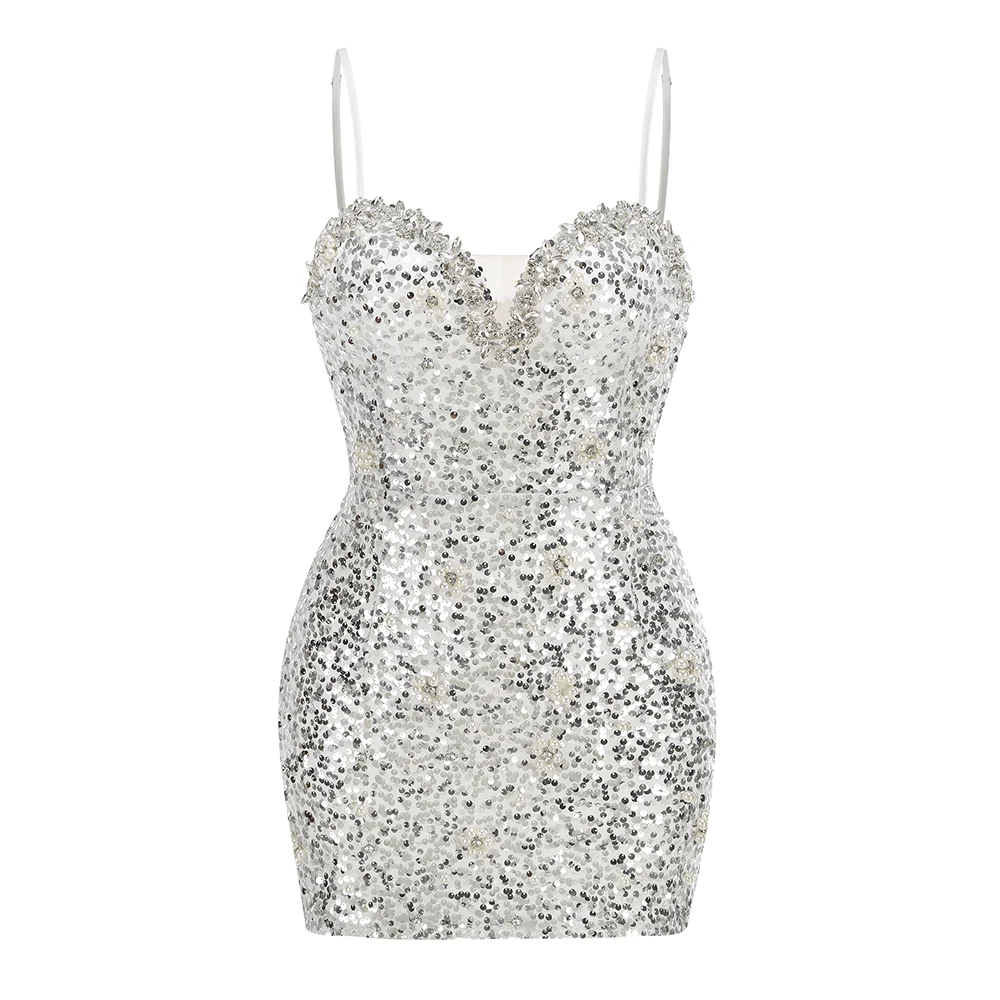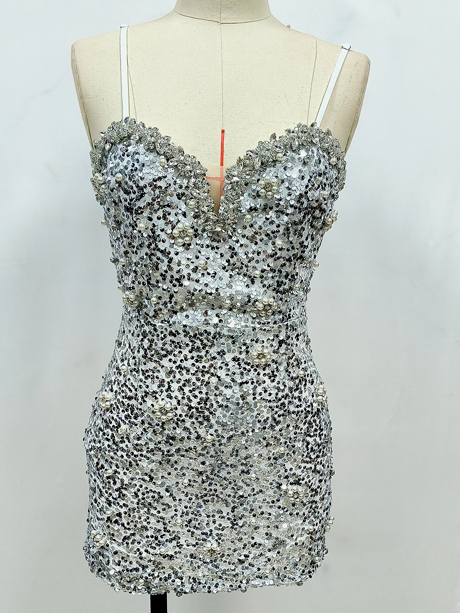 New Women Heavy Textured Evening Party Dress Luxury Socialite Style Silver Sparkle Sequin V-Neck Sexy Slim-Fit Halter Mini Dress