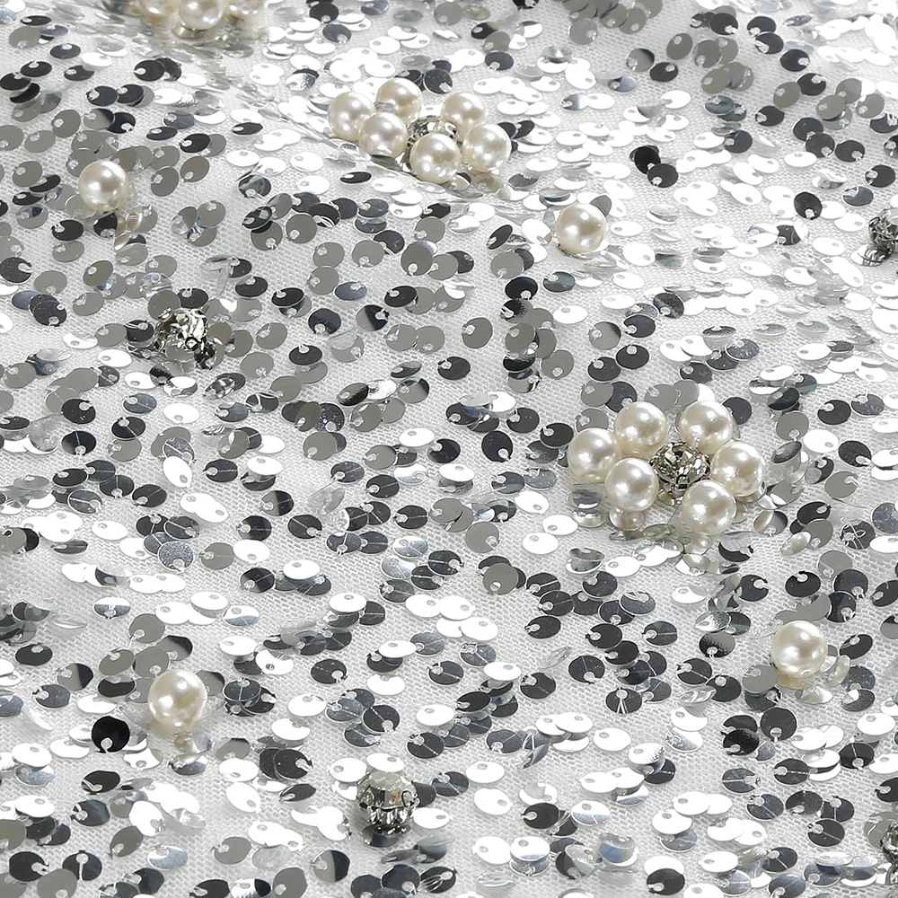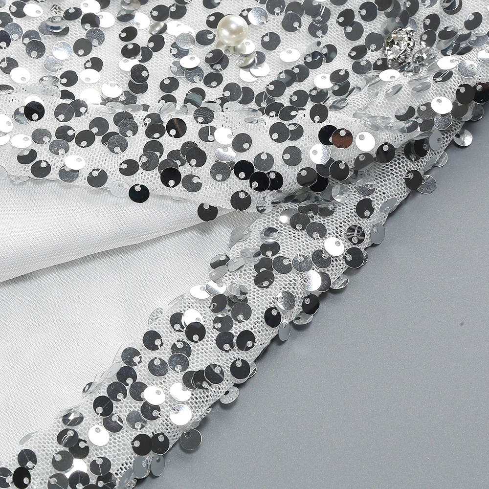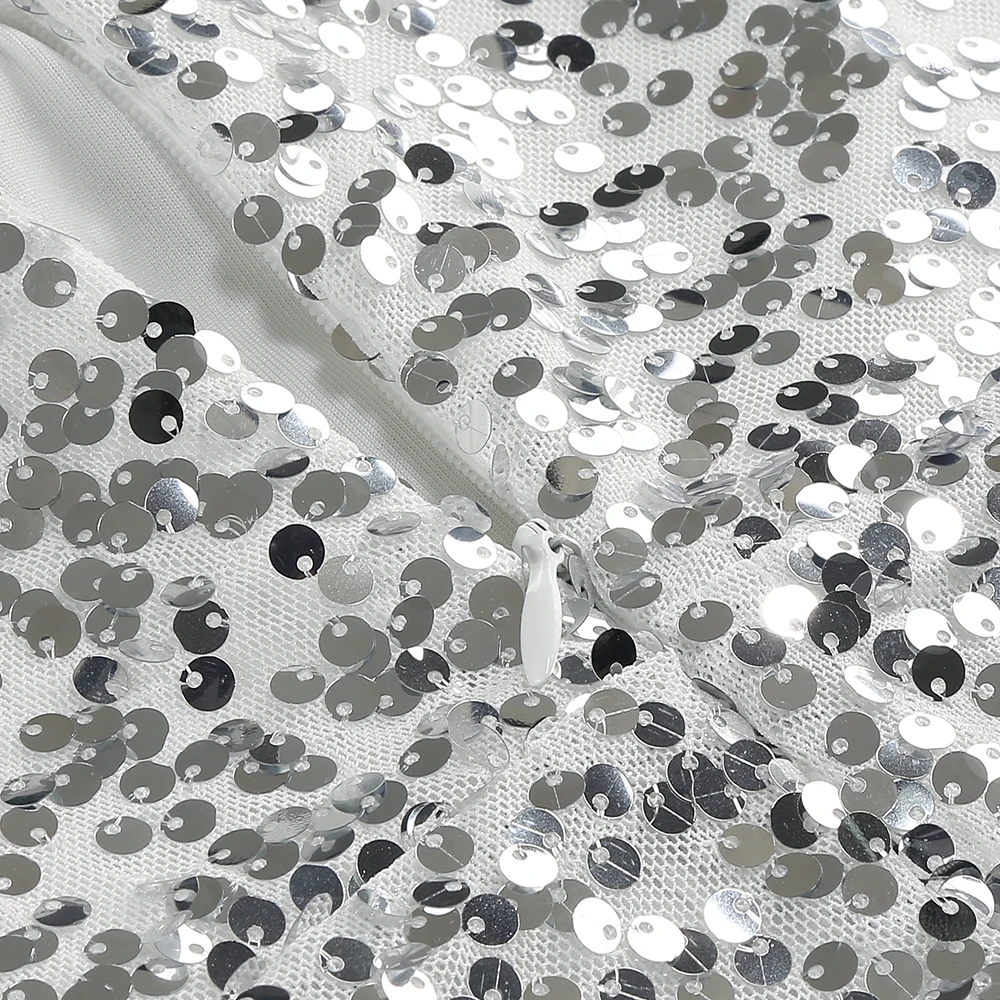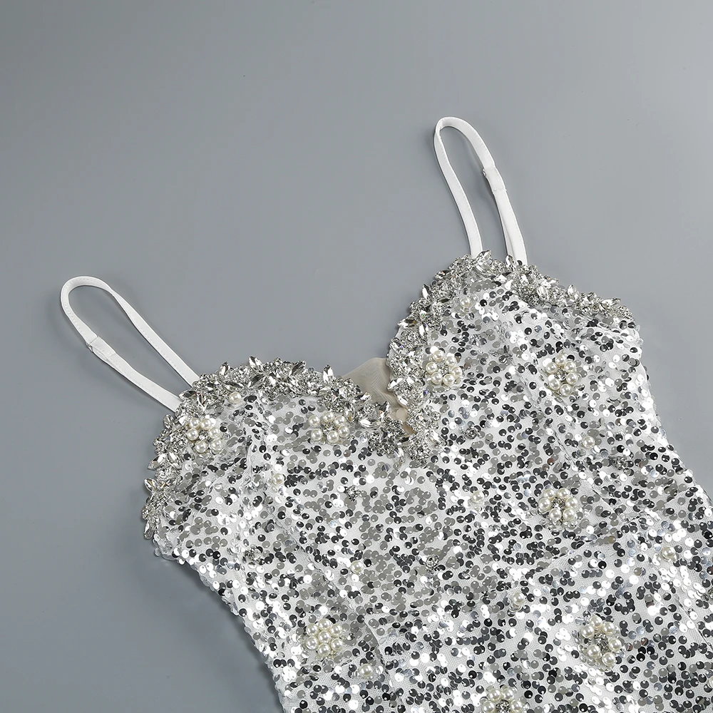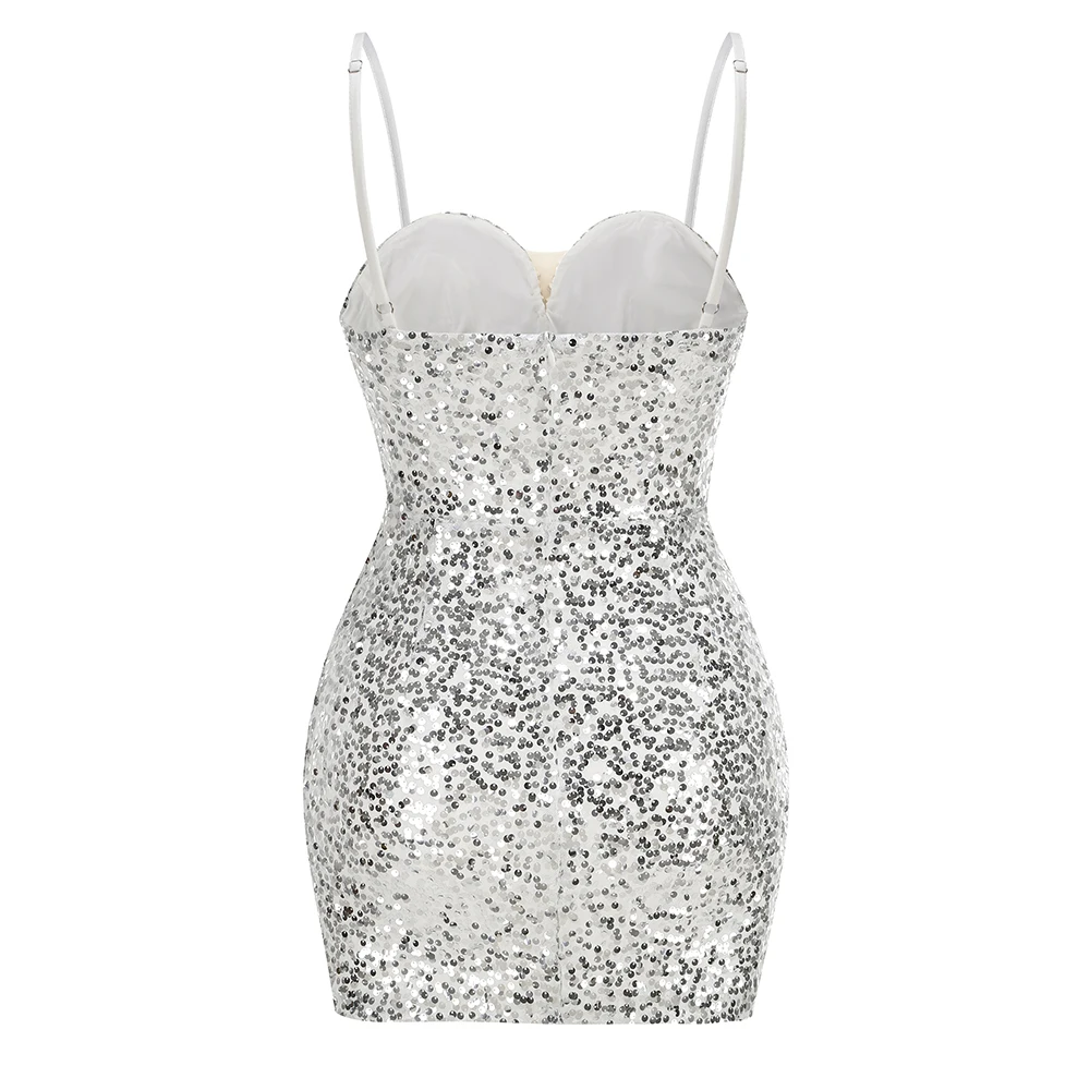 New Women Heavy Textured Evening Party Dress Luxury Socialite Style Silver Sparkle Sequin V-Neck Sexy Slim-Fit Halter Mini Dress