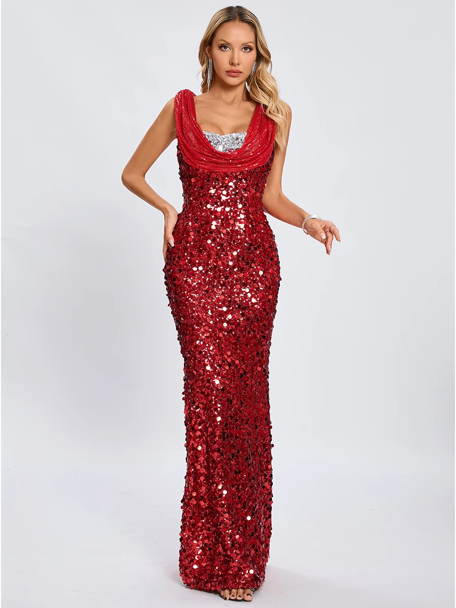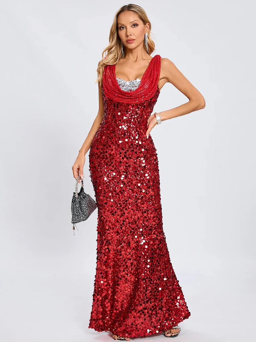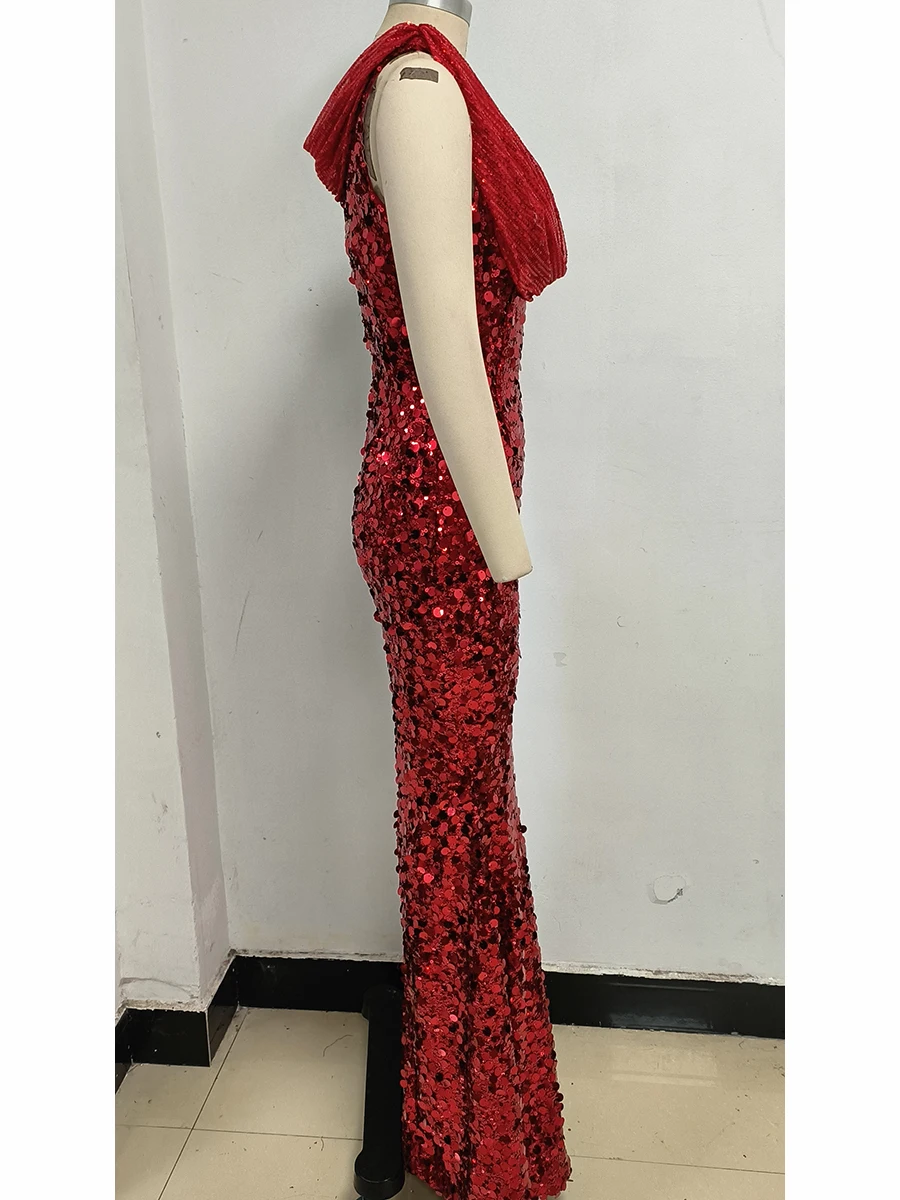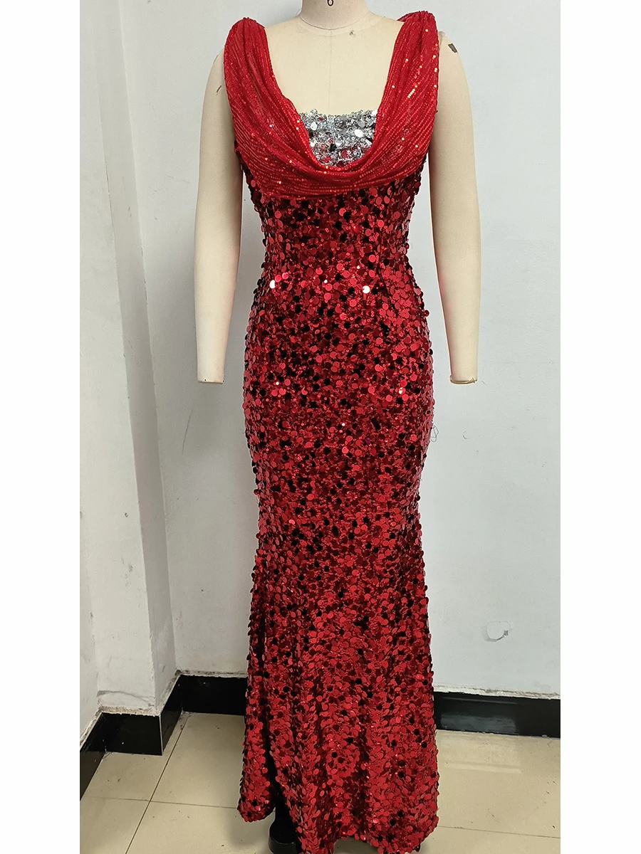 New Women's Splicing Sequins Red Swing Collar Halter Sleeveless Dress Sexy Luxury Shiny Floor-Length Dress Fashion Banquet