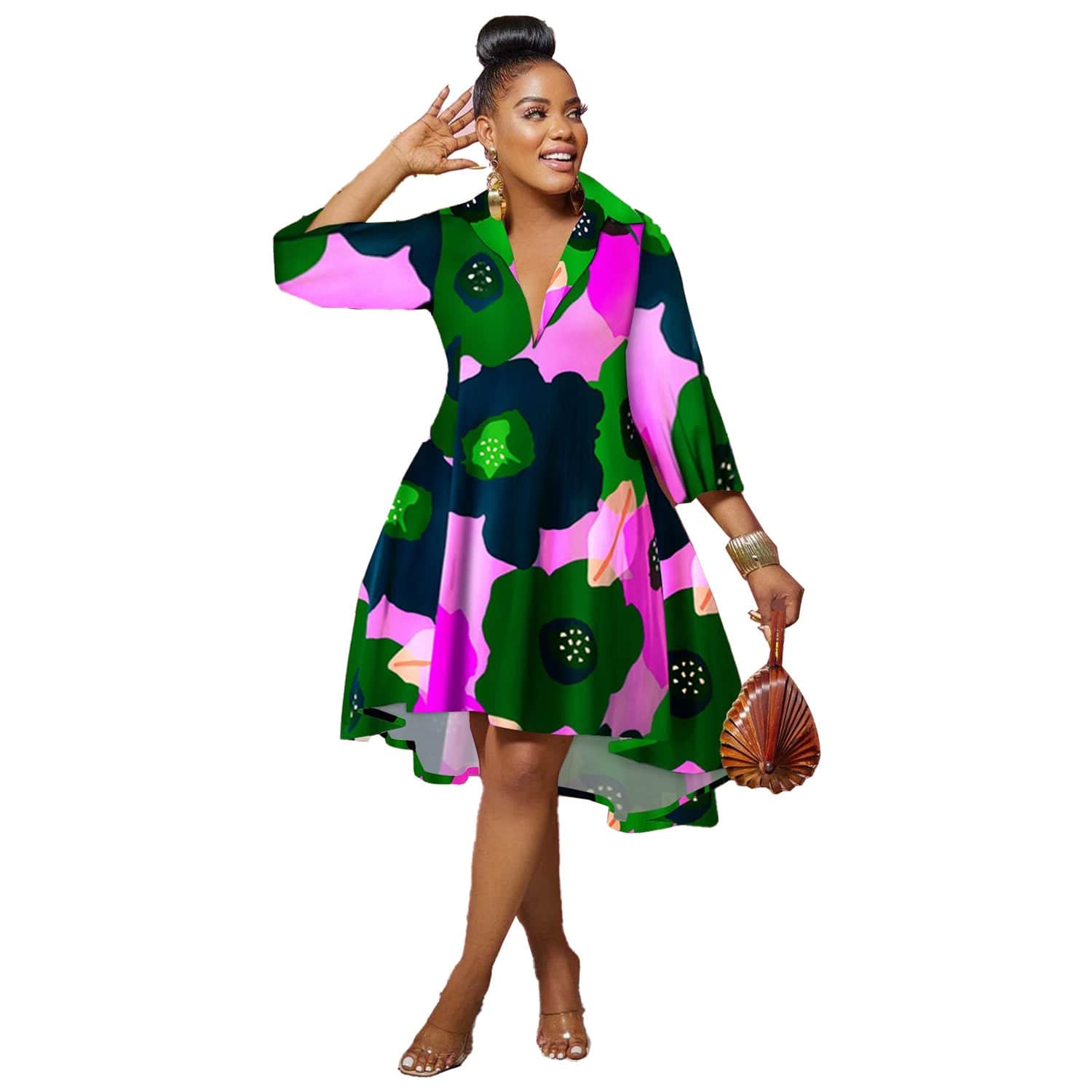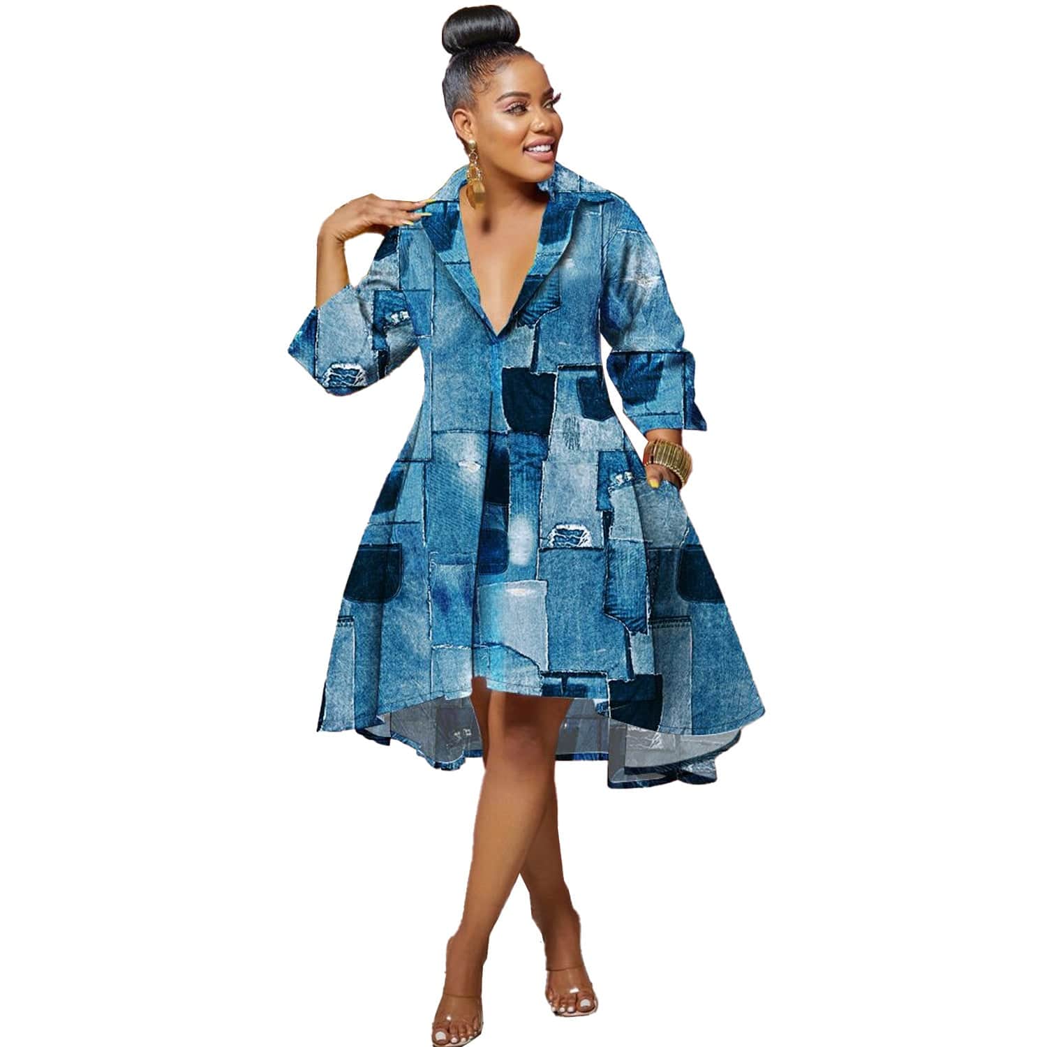Plus Size 3/4 Sleeve Colourful Denim Leopard Camo Asymmetrical Silk Dress Women Ladies Elegant Loose Womens Knee Length Dresses