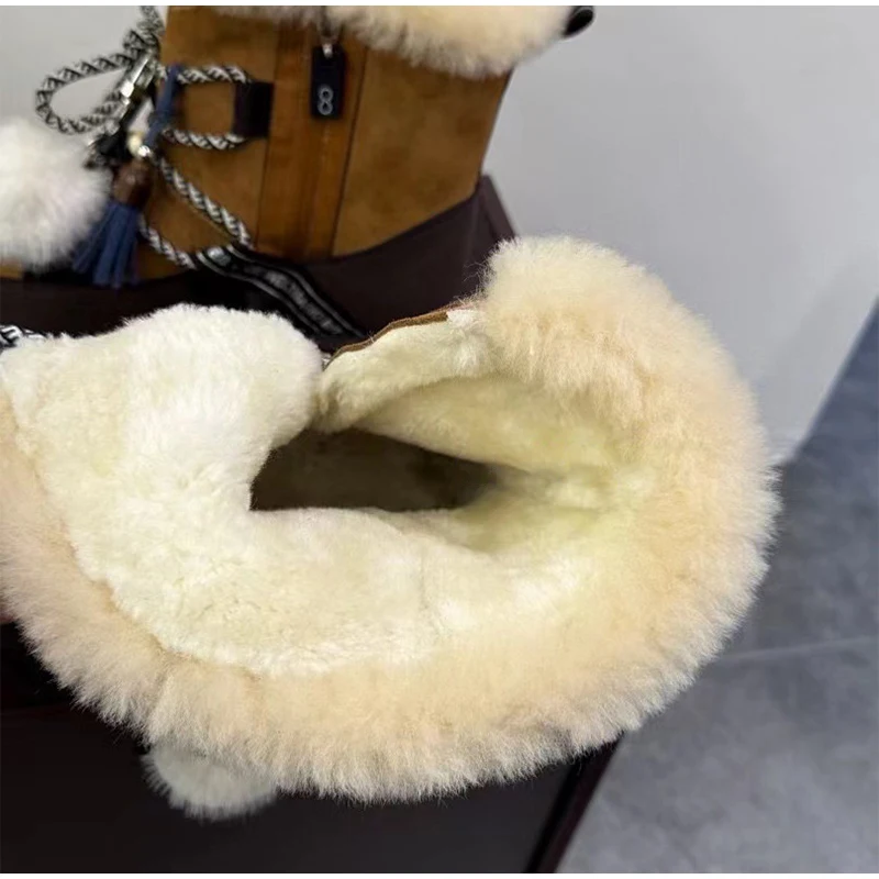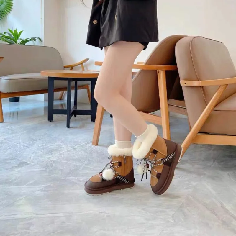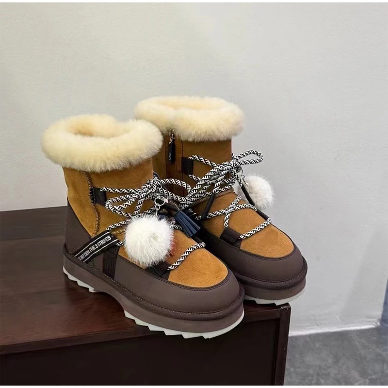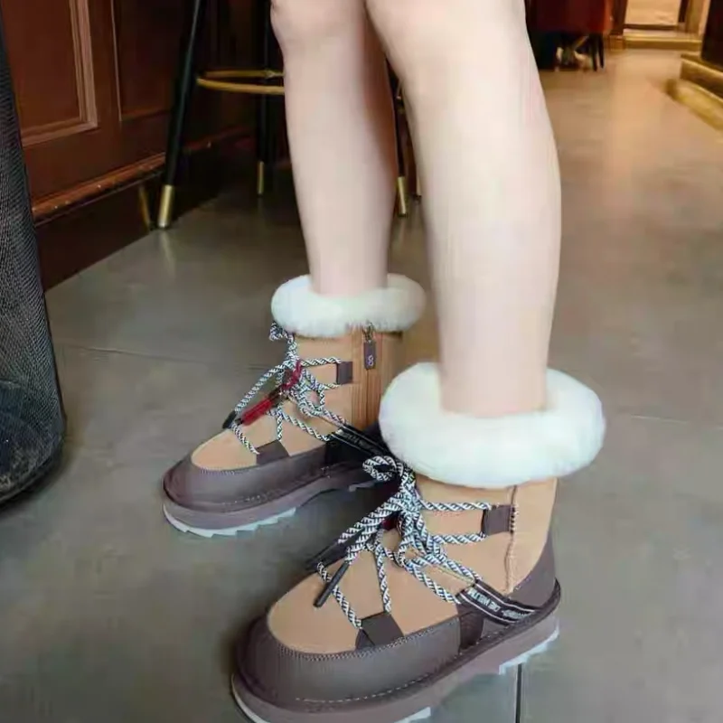 Plush Warm Snow Boots For Women Fashion Short Thick Non-slip Sports Shoes Lace-up Zipper Ankle Boots Thick Sole Shoelace Pendant
