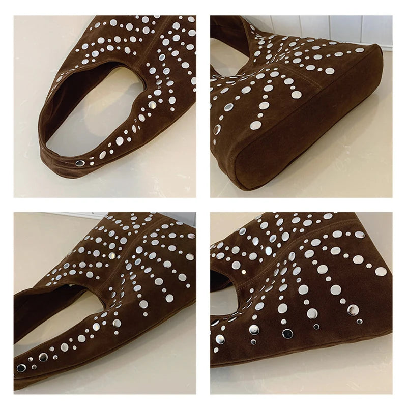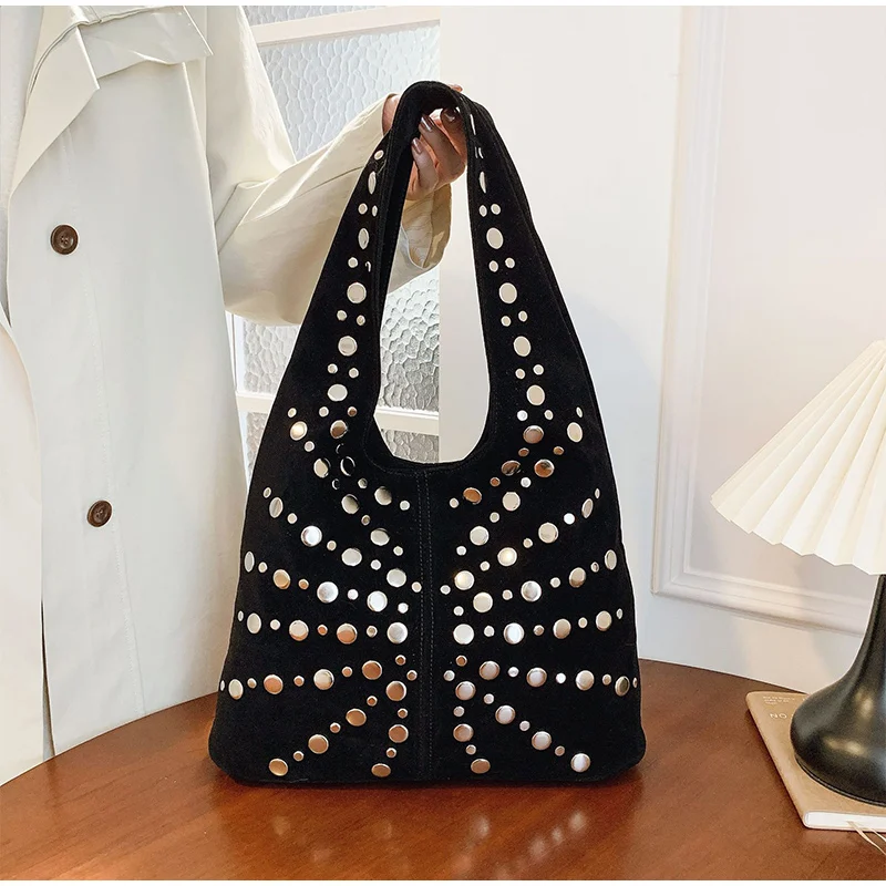 Polka Dot Rivet Tote Bag Women's Fashion Trend Texture Shoulder Bag High-end Luxury Suede Bucket Bag Commuter Female Handbag