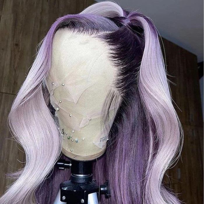 Rainbow Purple Color Silky Body Wave Wig Natural Hairline High Ponytail Glueless HD Transparent Lace Front Wigs