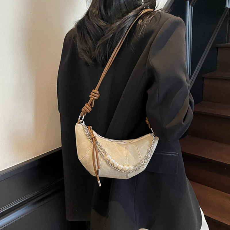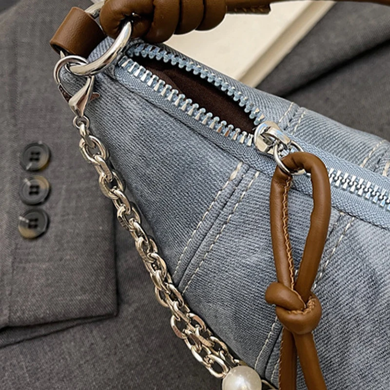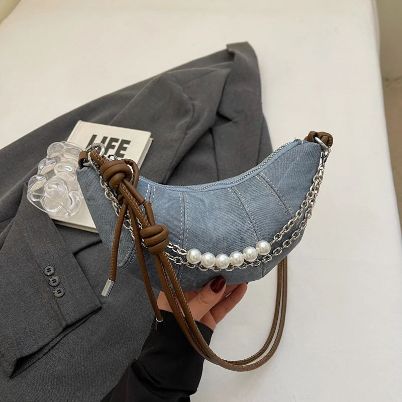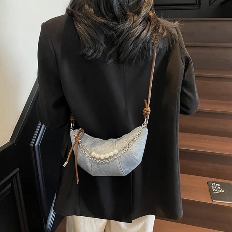 Retro Denim Dumpling Bag Creative Horn Design Pearl Pendant Messenger Bag Brand High-grade Leather Ladies Versatile Shoulder Bag