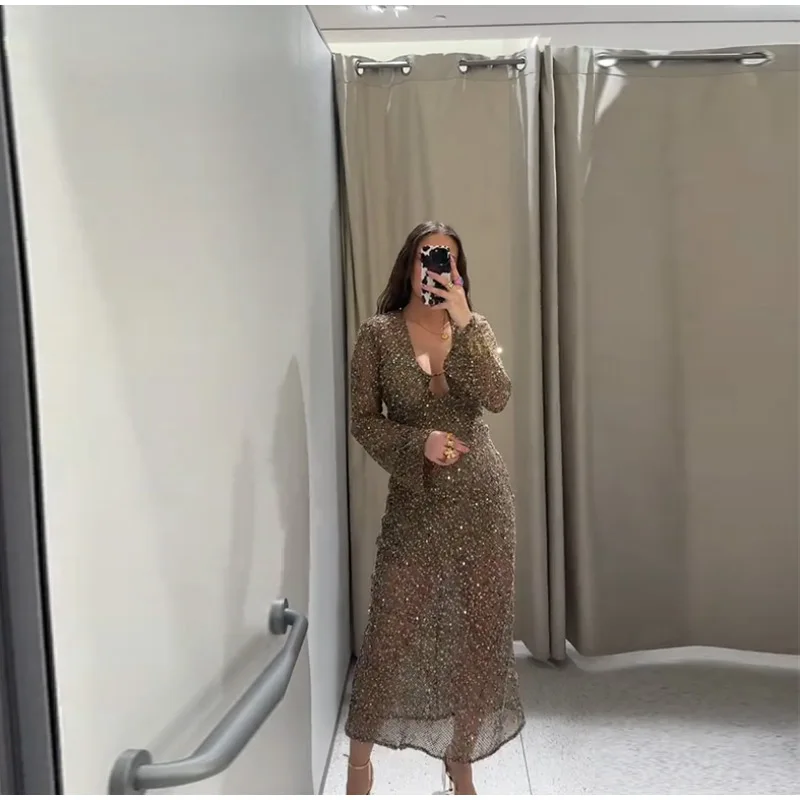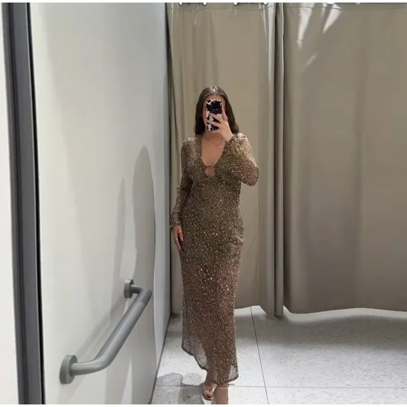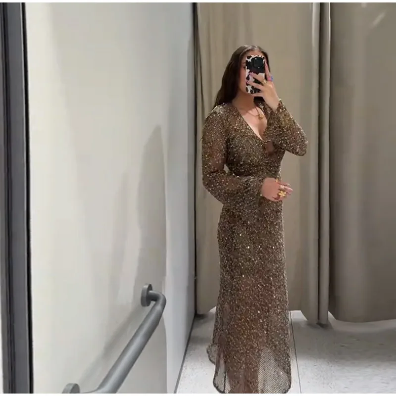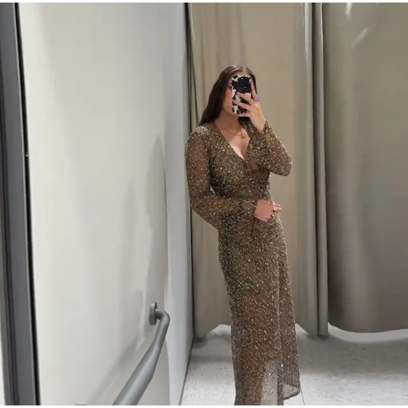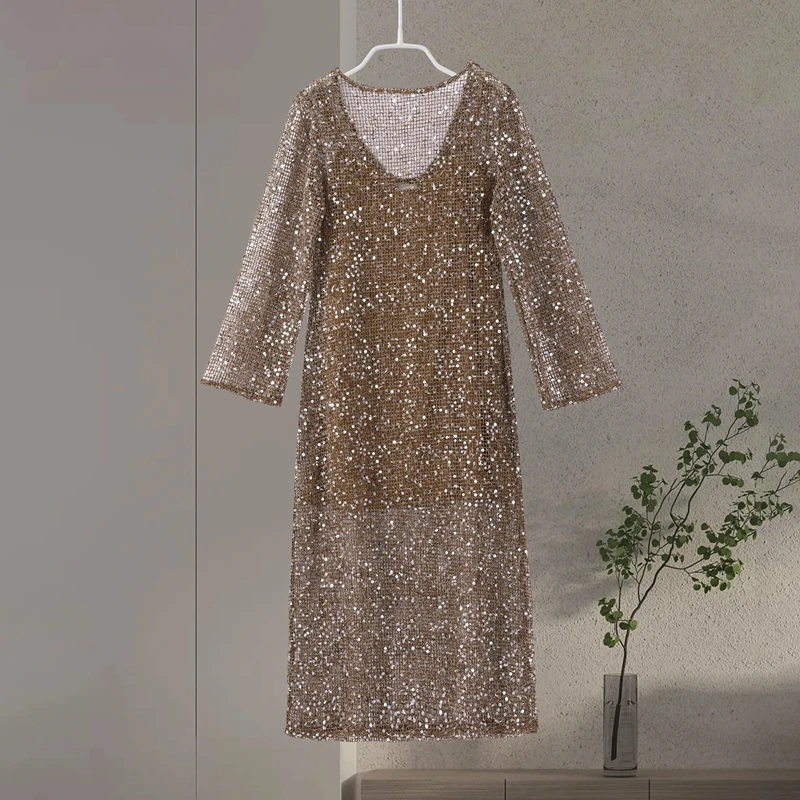Sequin Maixi Dress Woman Deep V-neck Sparkling Lace Up Trumpet Sleeves Slim Long Dresses Sexy Perspective Party Women's Robe