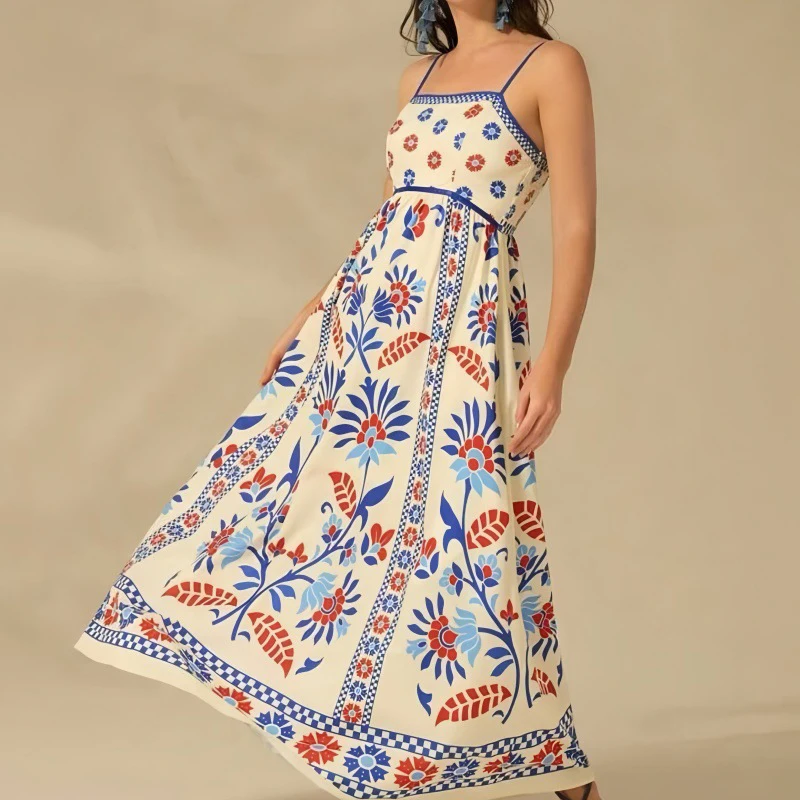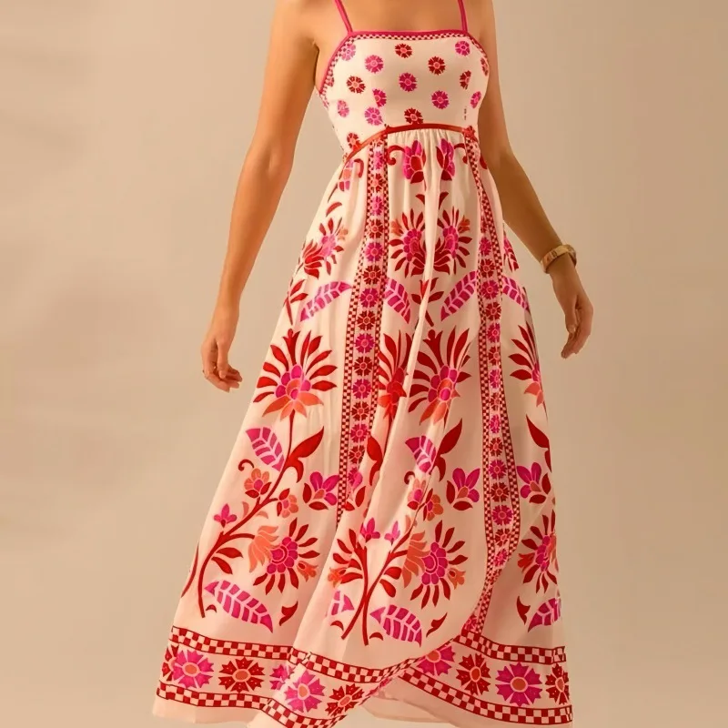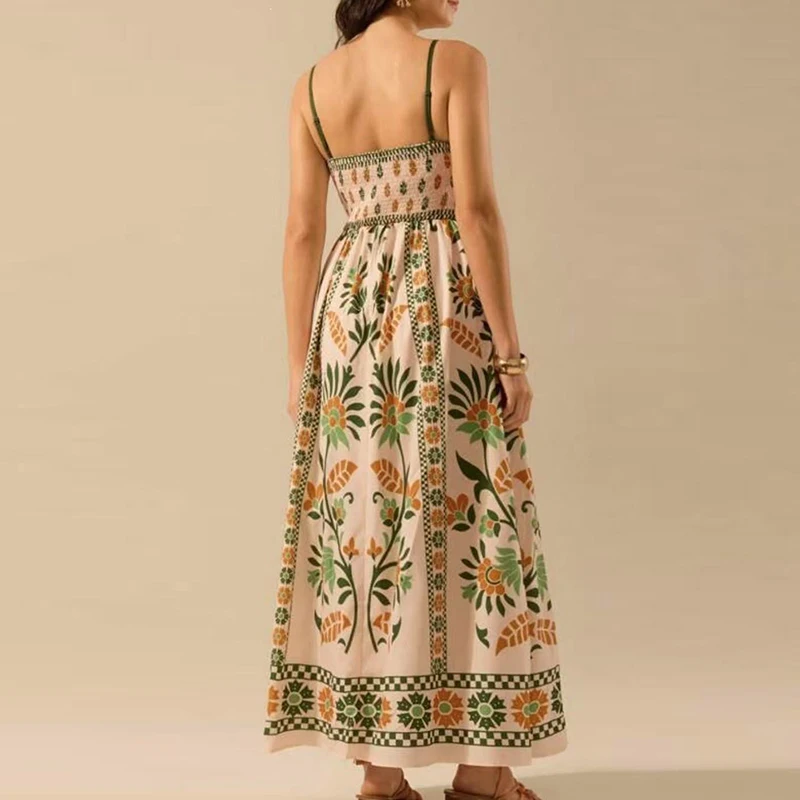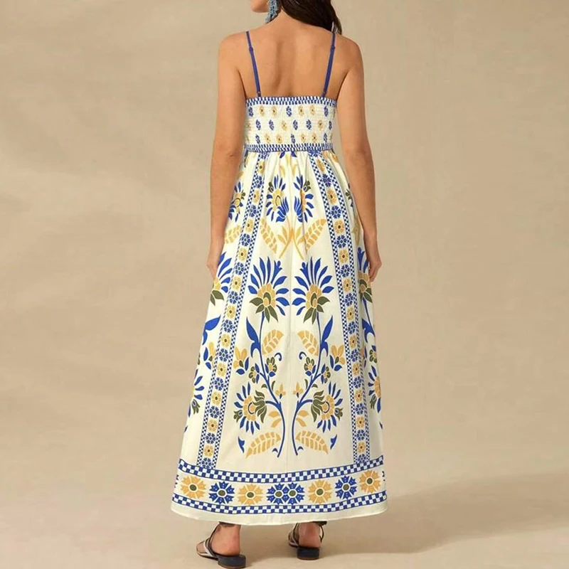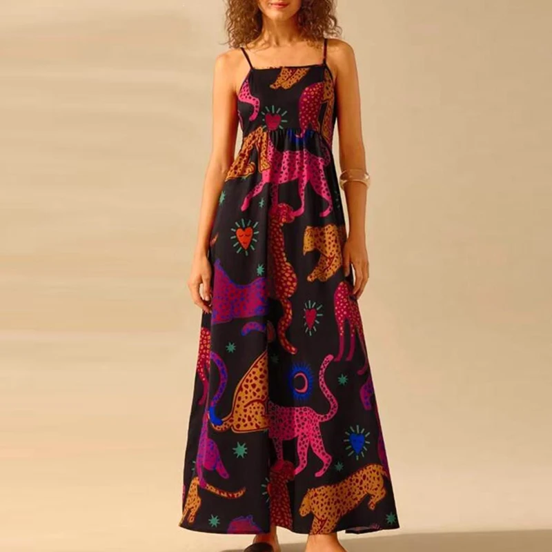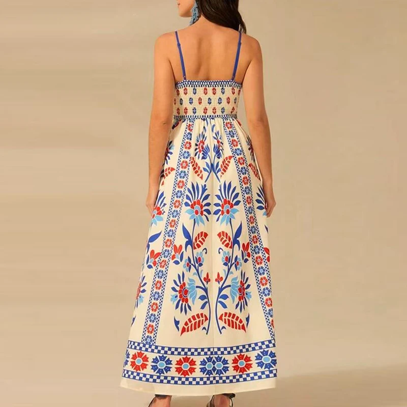 Sexy Women's Off Shoulder Summer Long Dress Casual Bohemian Pleated Sling Dress Graffiti Printed High Waist Beach Dress Vestidos