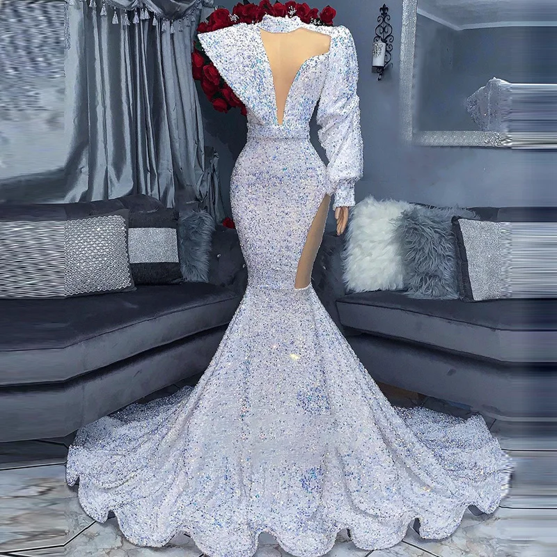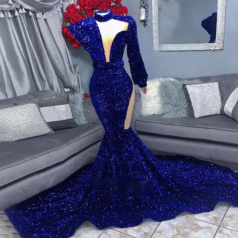 Sparkly Sequin Royal Blue Mermaid Prom Dresses for Black Girls Plus Size Evening Graduation Party Gowns RM008