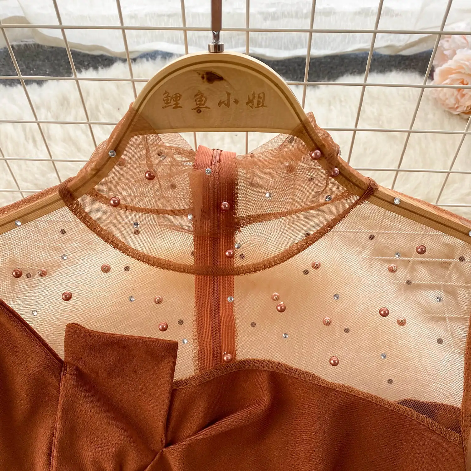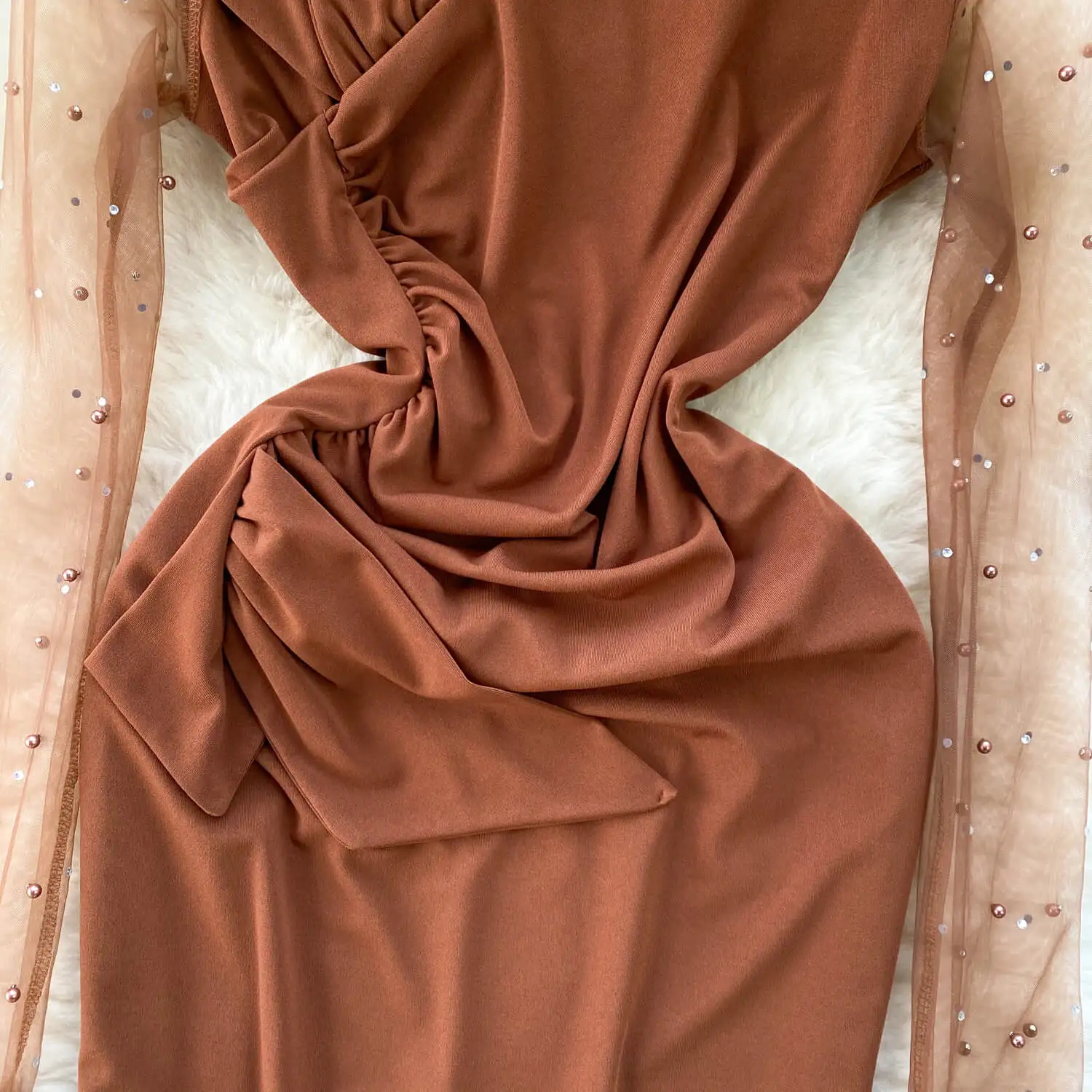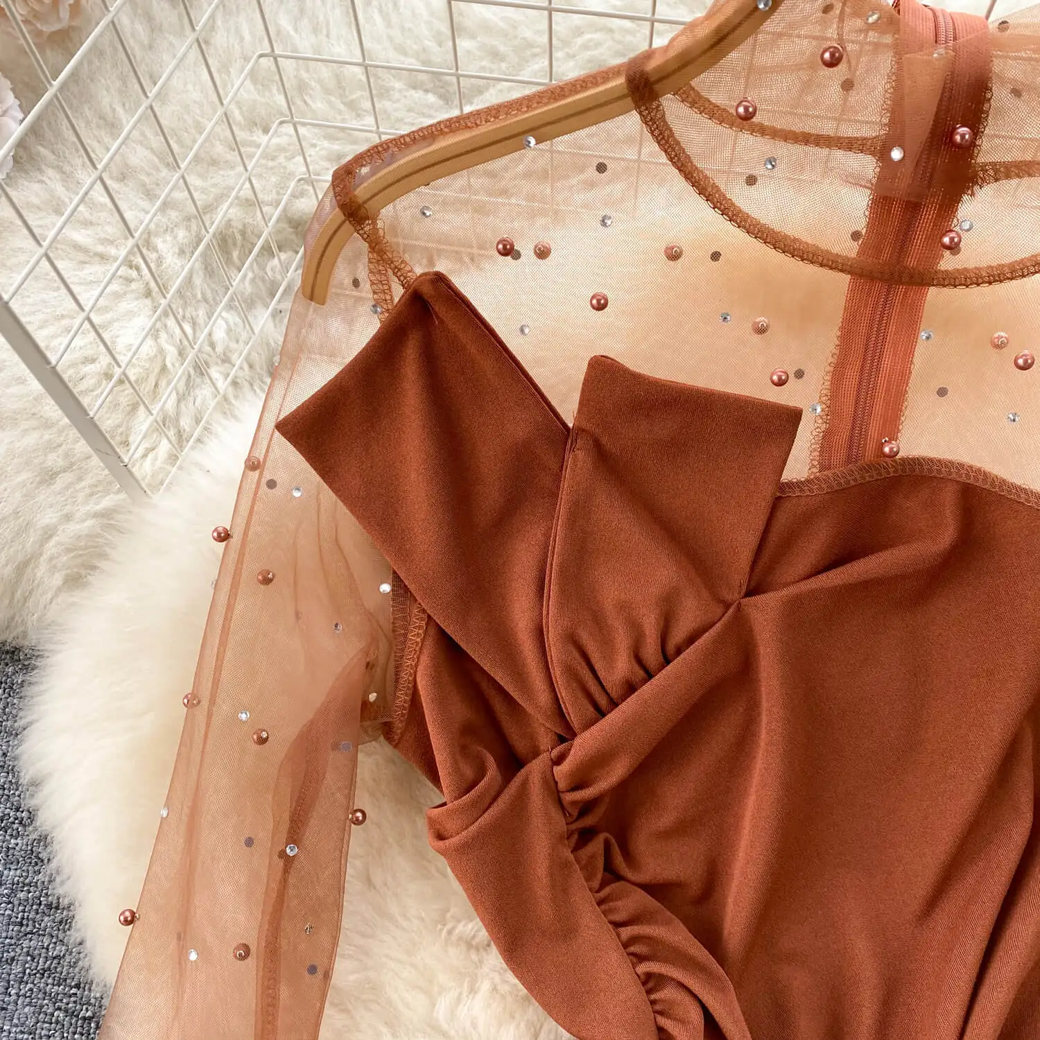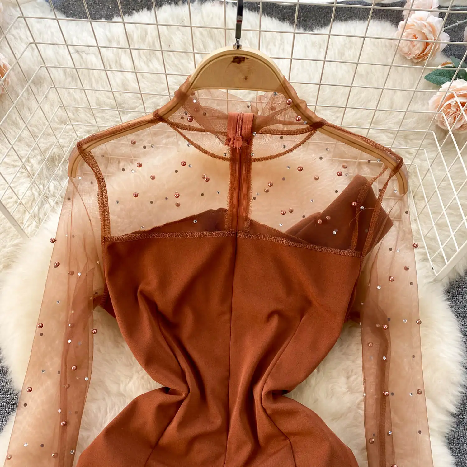 Sping New High Quality Elegant Midi Dress For Women Puff Sleeve Empire Beaded Mesh Vestidos Ladies Elegant Dresses
