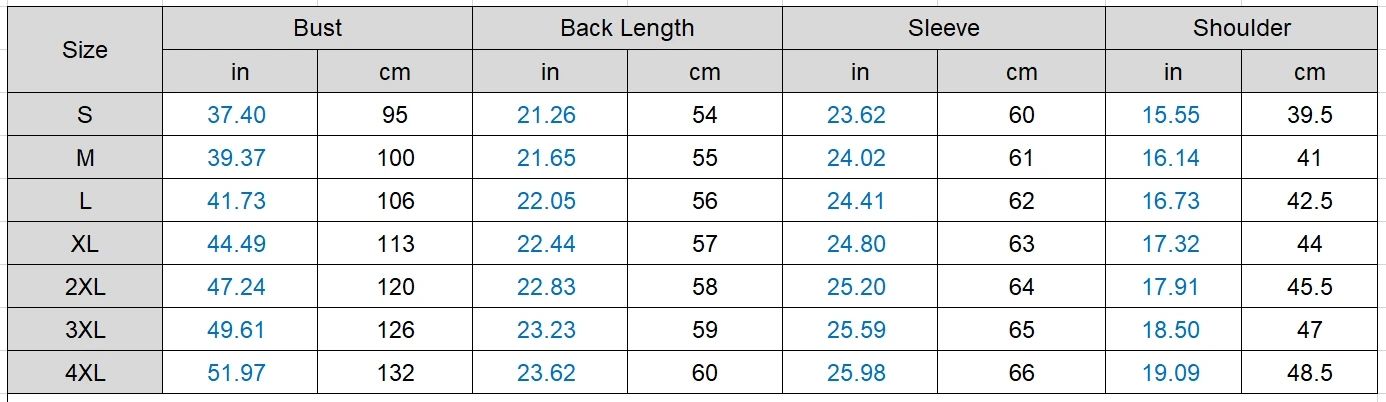 size_info: {"sizeInfoList":[{"length":{"cm":"95","inch":"37.40"},"size":"S bust 95cm","vid":-15},{"length":{"cm":"100","inch":"39.37"},"size":"M bust 100cm","vid":-16},{"length":{"cm":"106","inch":"41.73"},"size":"L bust 106cm","vid":-17},{"length":{"cm":"113","inch":"44.49"},"size":"XL bust 113cm","vid":-29},{"length":{"cm":"120","inch":"47.24"},"size":"XXL bust 120cm","vid":-30},{"length":{"cm":"132","inch":"51.97"},"size":"4XL bust 132cm","vid":-32},{"length":{"cm":"126","inch":"49.61"},"size":"XXXL bust 126cm","vid":-37}]}