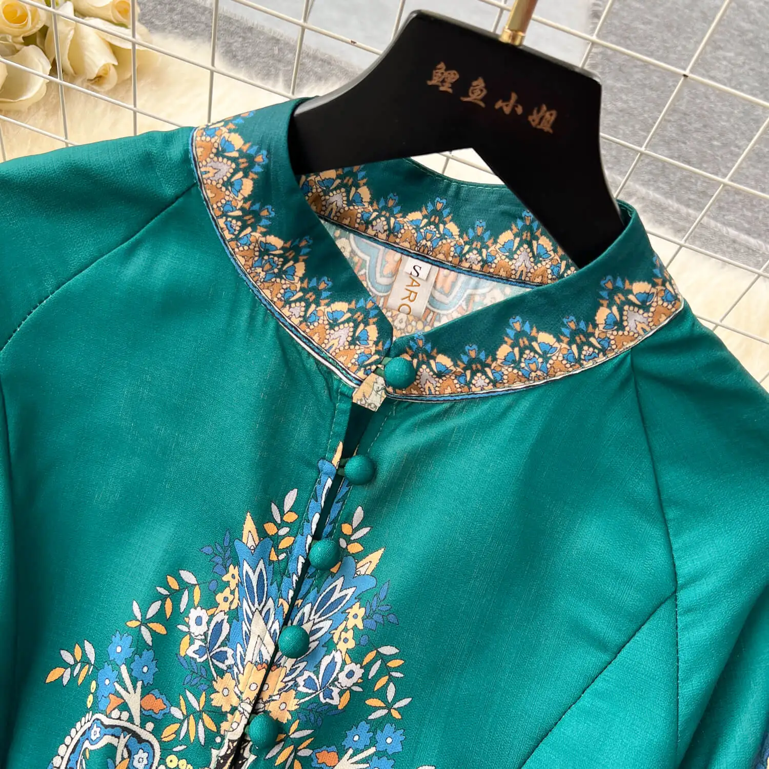 Spring Full Sleeve Stand Collar Print Casual Dress Women High Waist Lantern Sleeve Midi A-line Dress Ladies Elegant Dresses