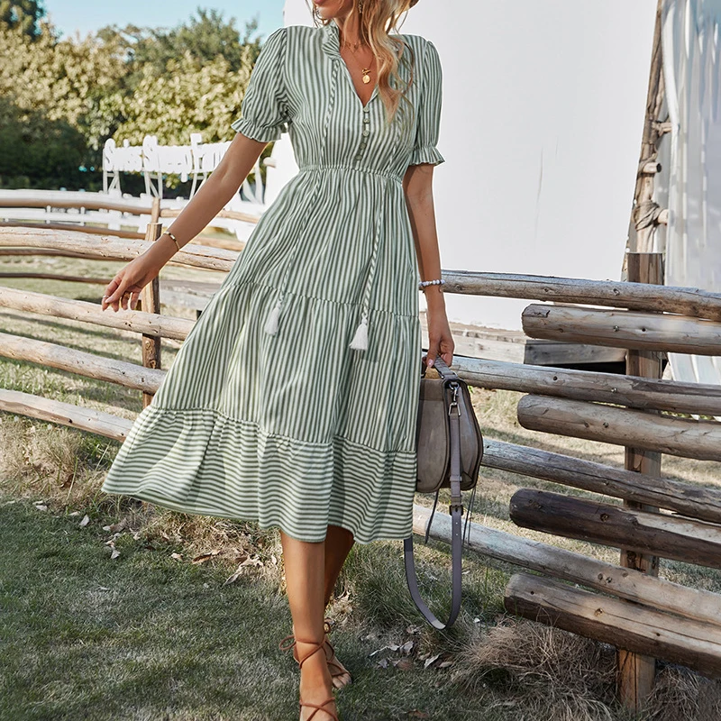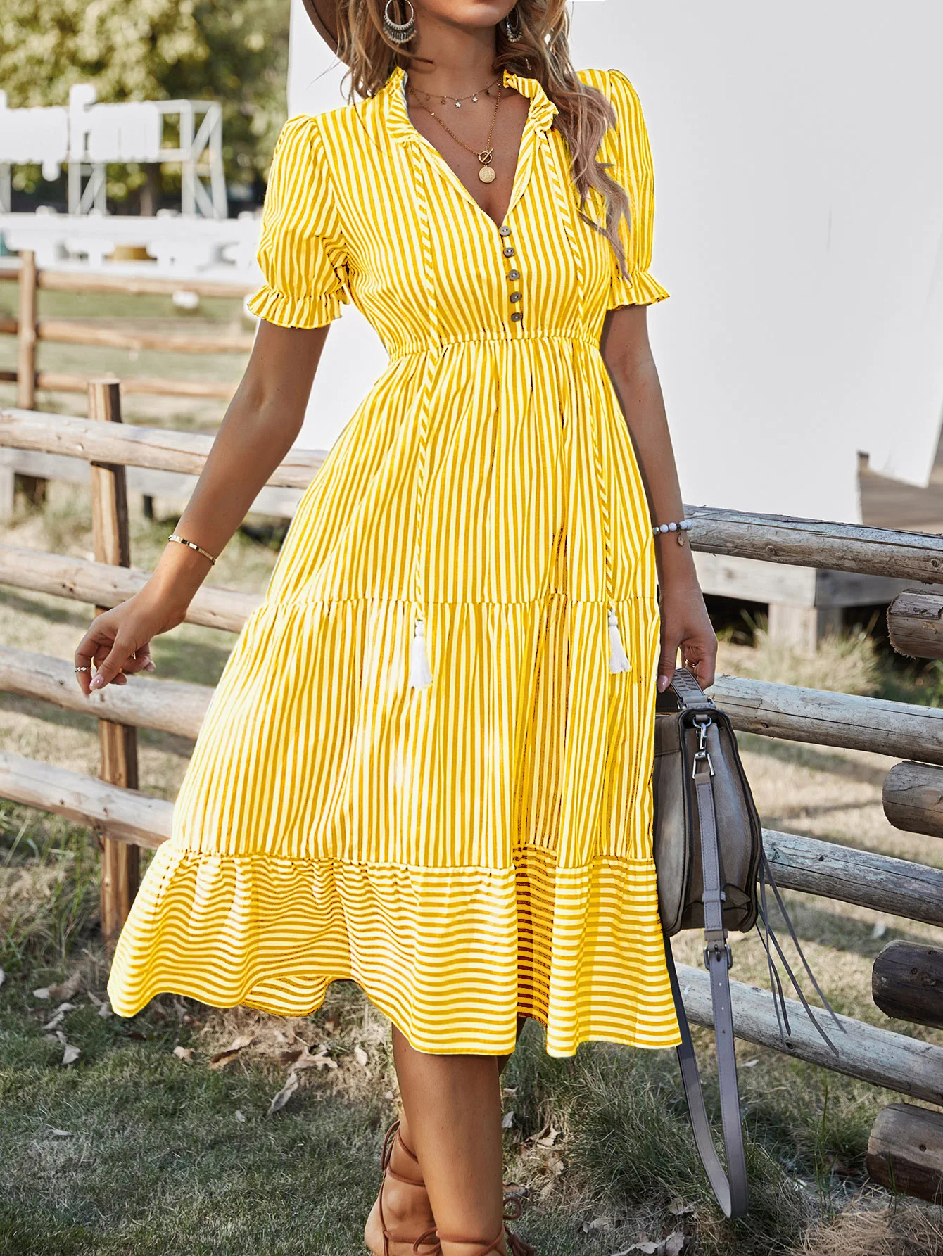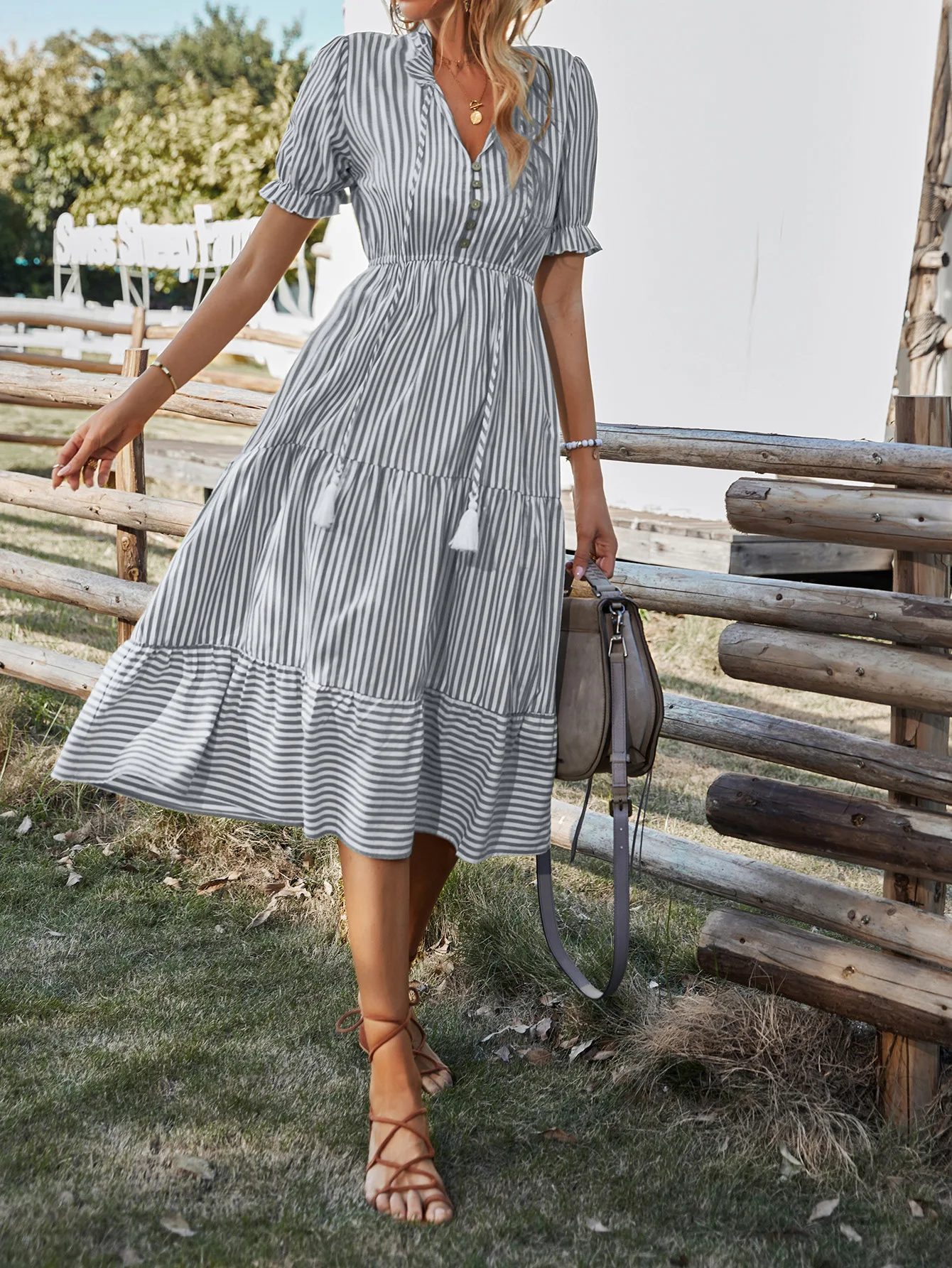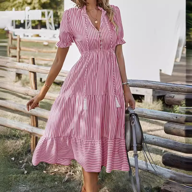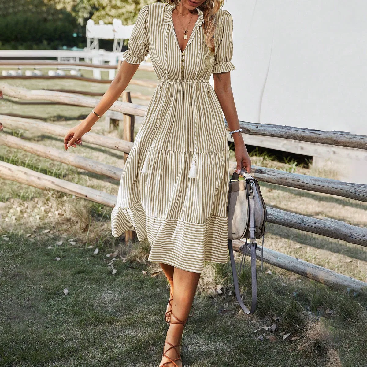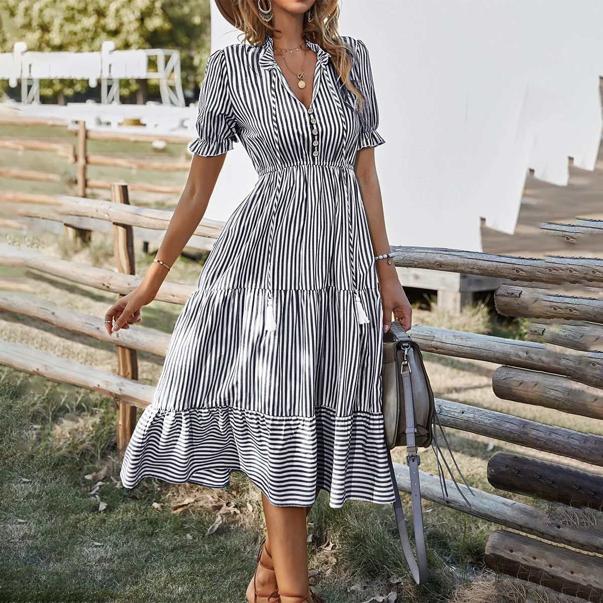 Summer Women's Striped Short Sleeve V-Neck Elastic Waist Dress