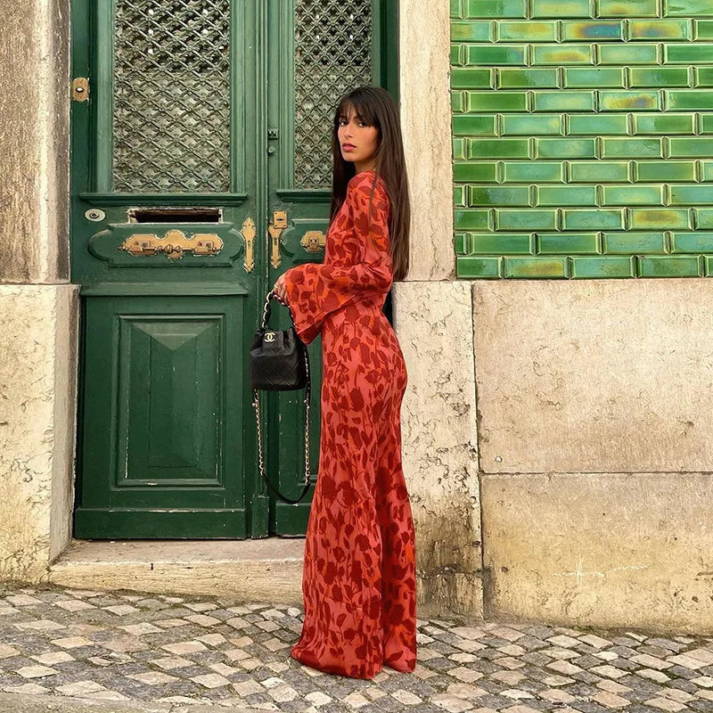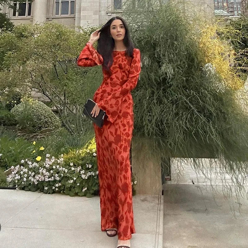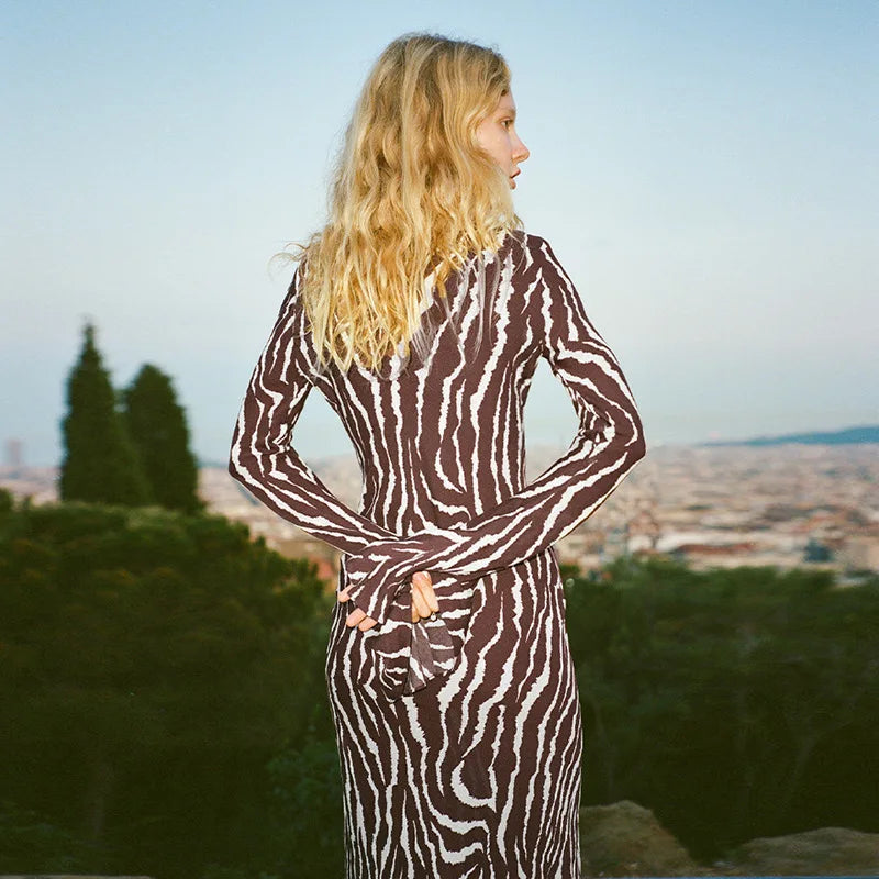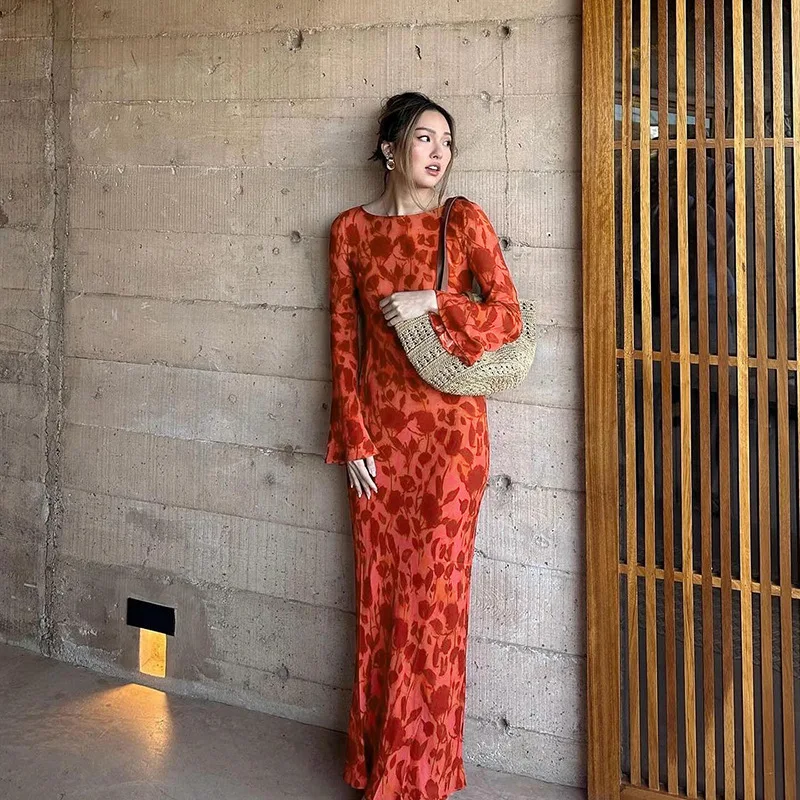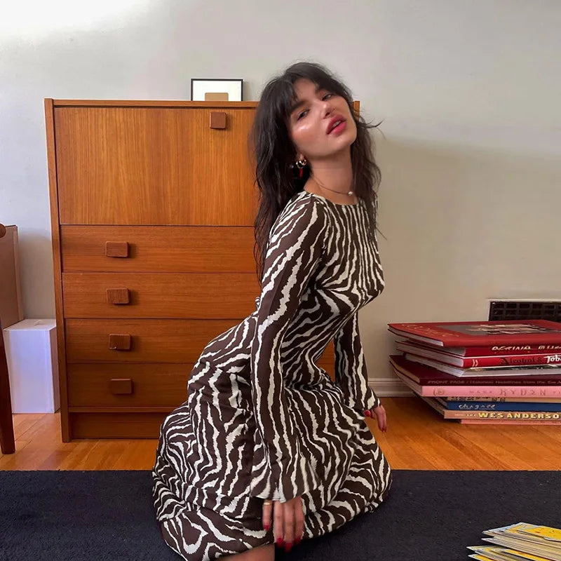 Temperament printed crewneck basic dress female fall style fashion elegant slim dress
