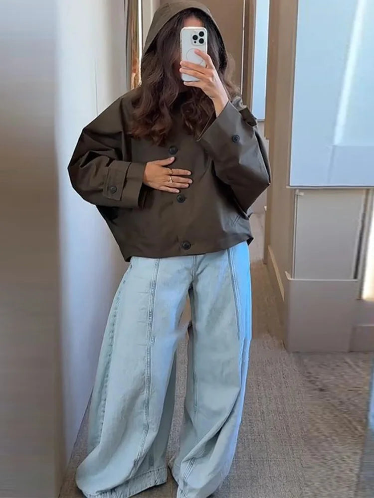Vintage Single Breasted Women 's Treach Coats Loose Hooded Pockets Full Sleeve Short Jacket Female 2025 Autumn New Lady Outwears