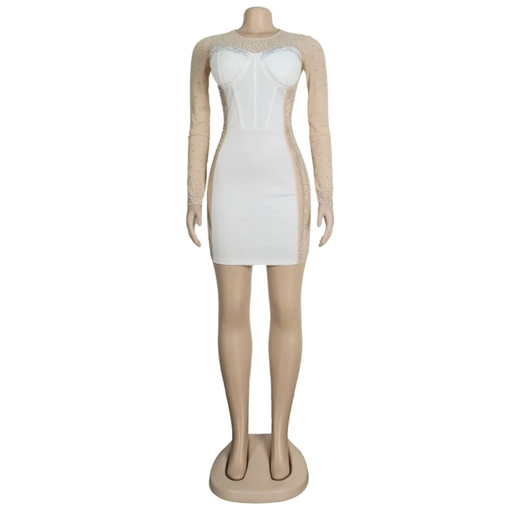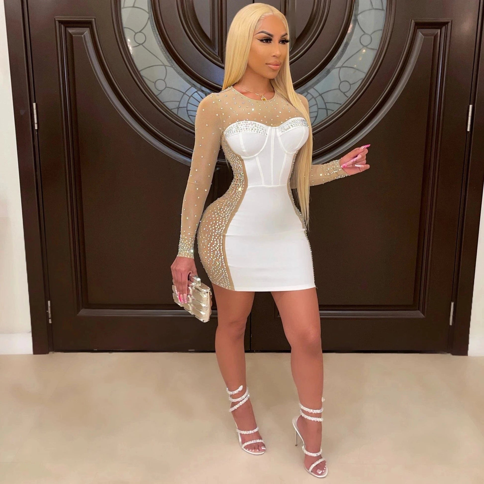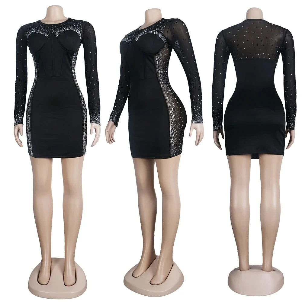 Autumn Fashion Plus Size Dress Bodycon Sexy Transparent Beading O-Neck Women Dress Long Sleeve