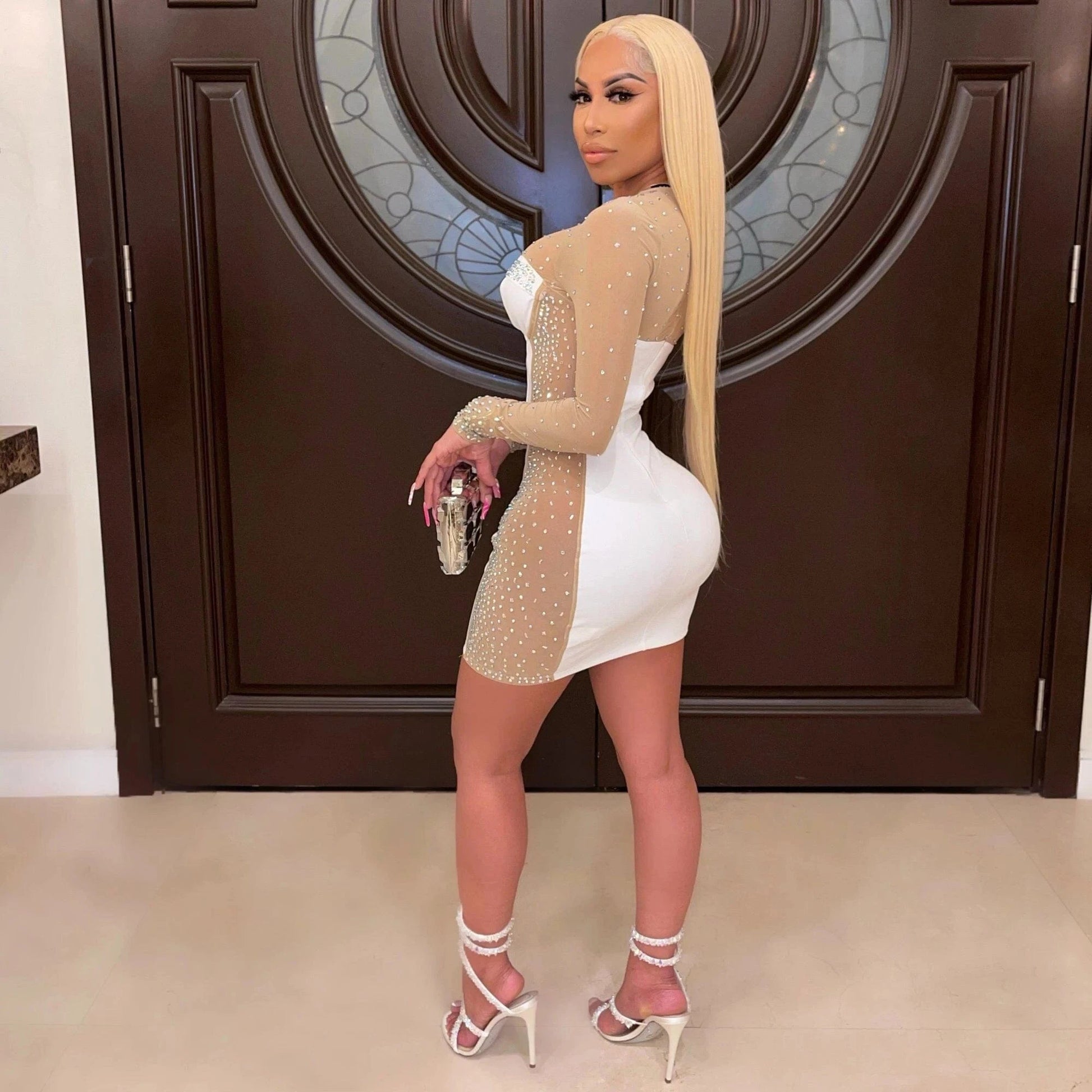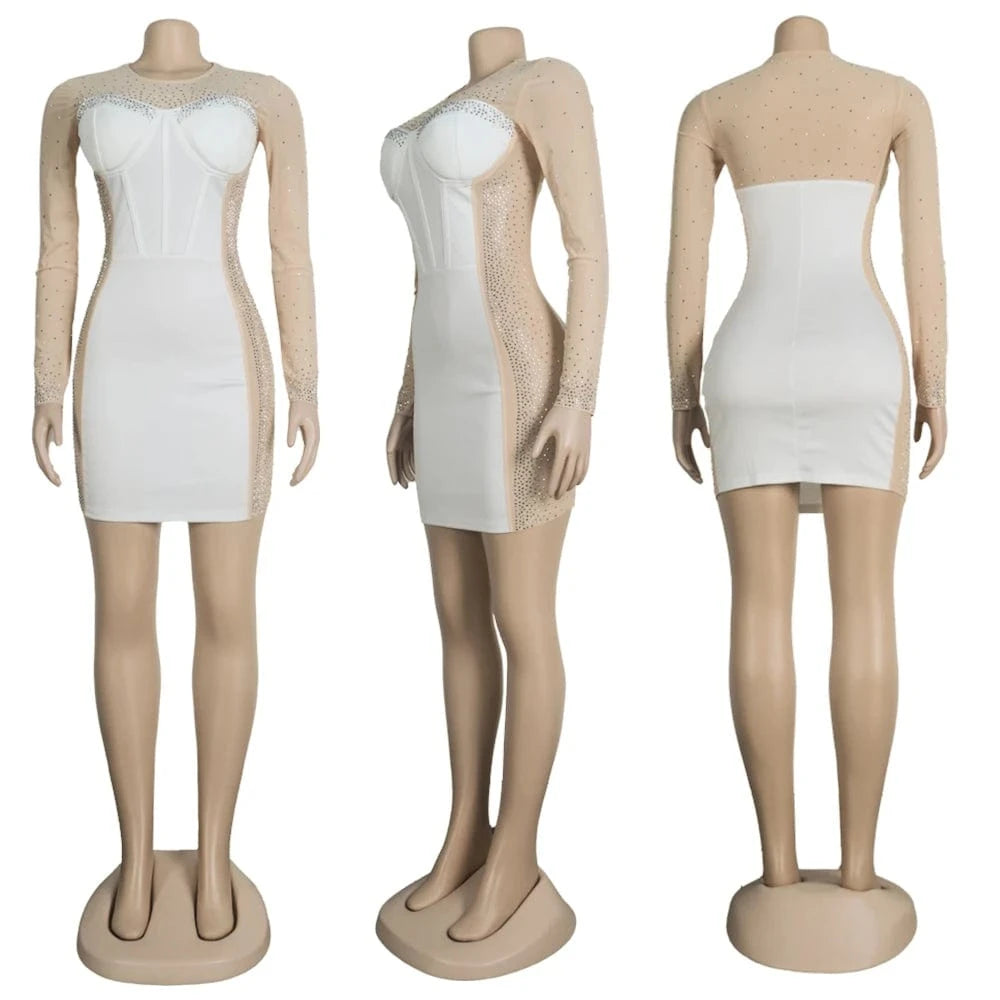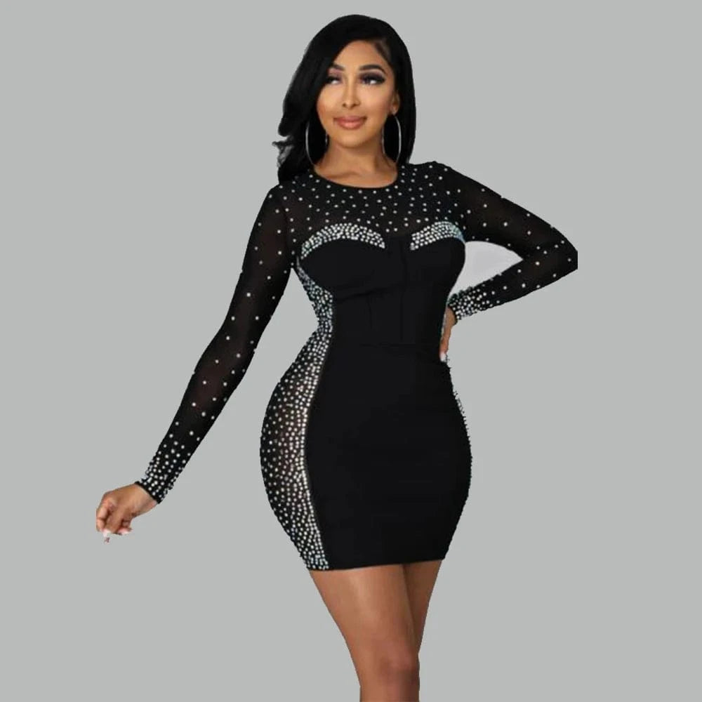 VK2226 Autumn Fashion Plus Size Dress Bodycon Sexy Transparent Beading O-Neck Women Dress Long Sleeve