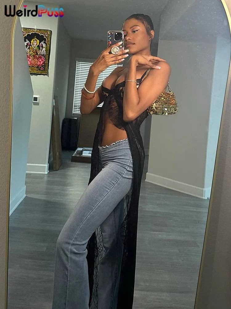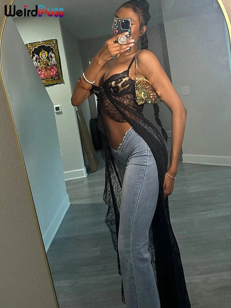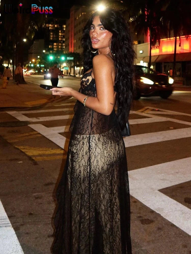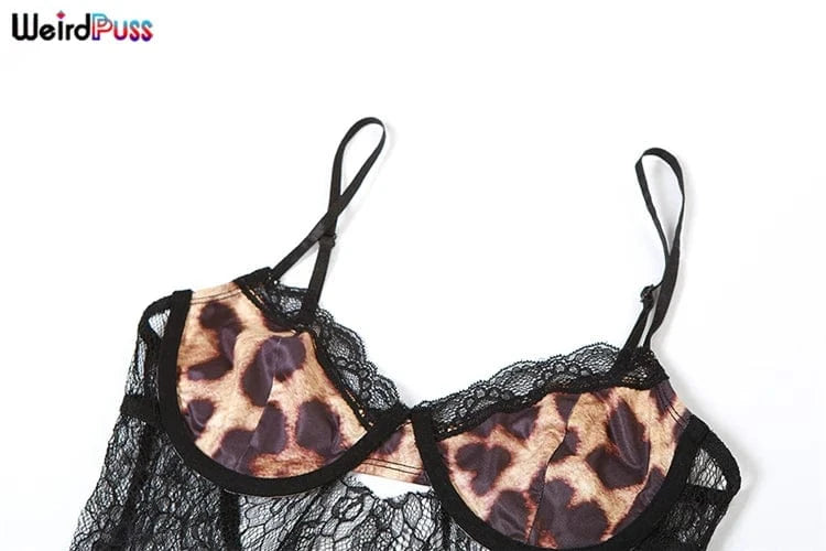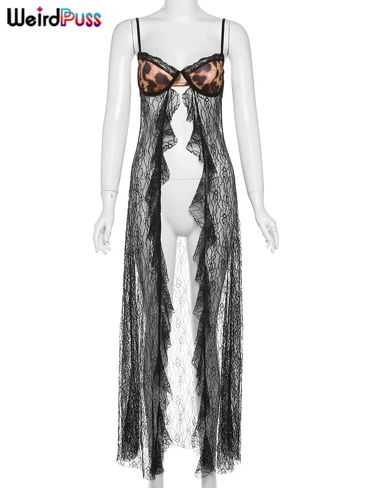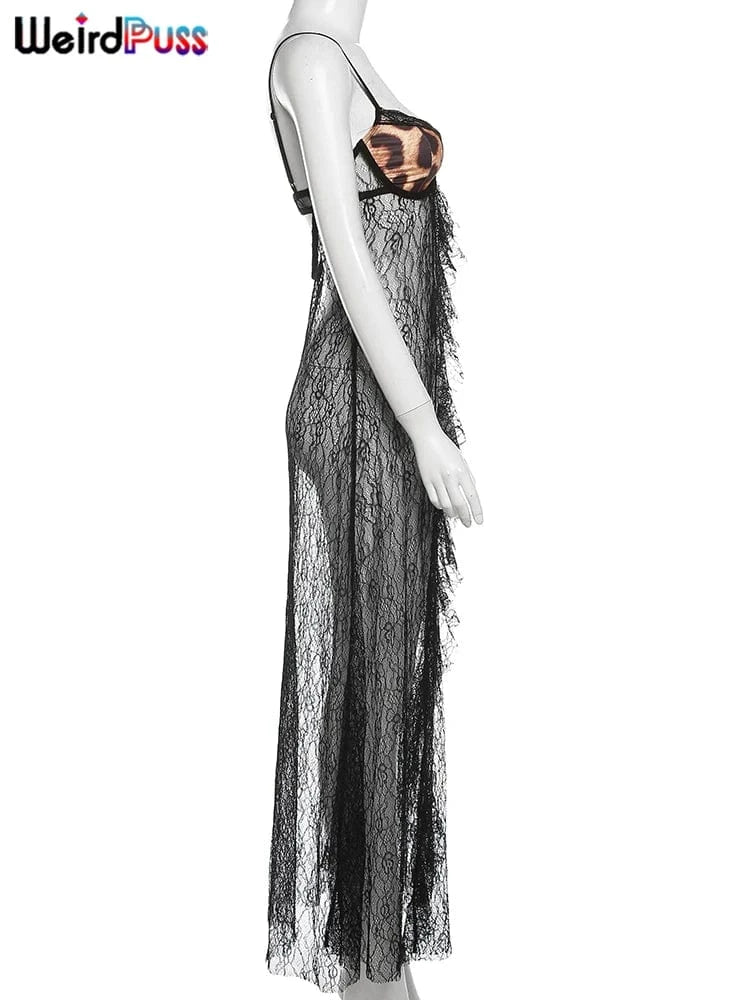 Weird Puss Backless Sexy Women Camisole Leopard Mesh Patchwork Ruffles Sexy Club Party Midnight Hot Girls Wild Coquette Maxi Top